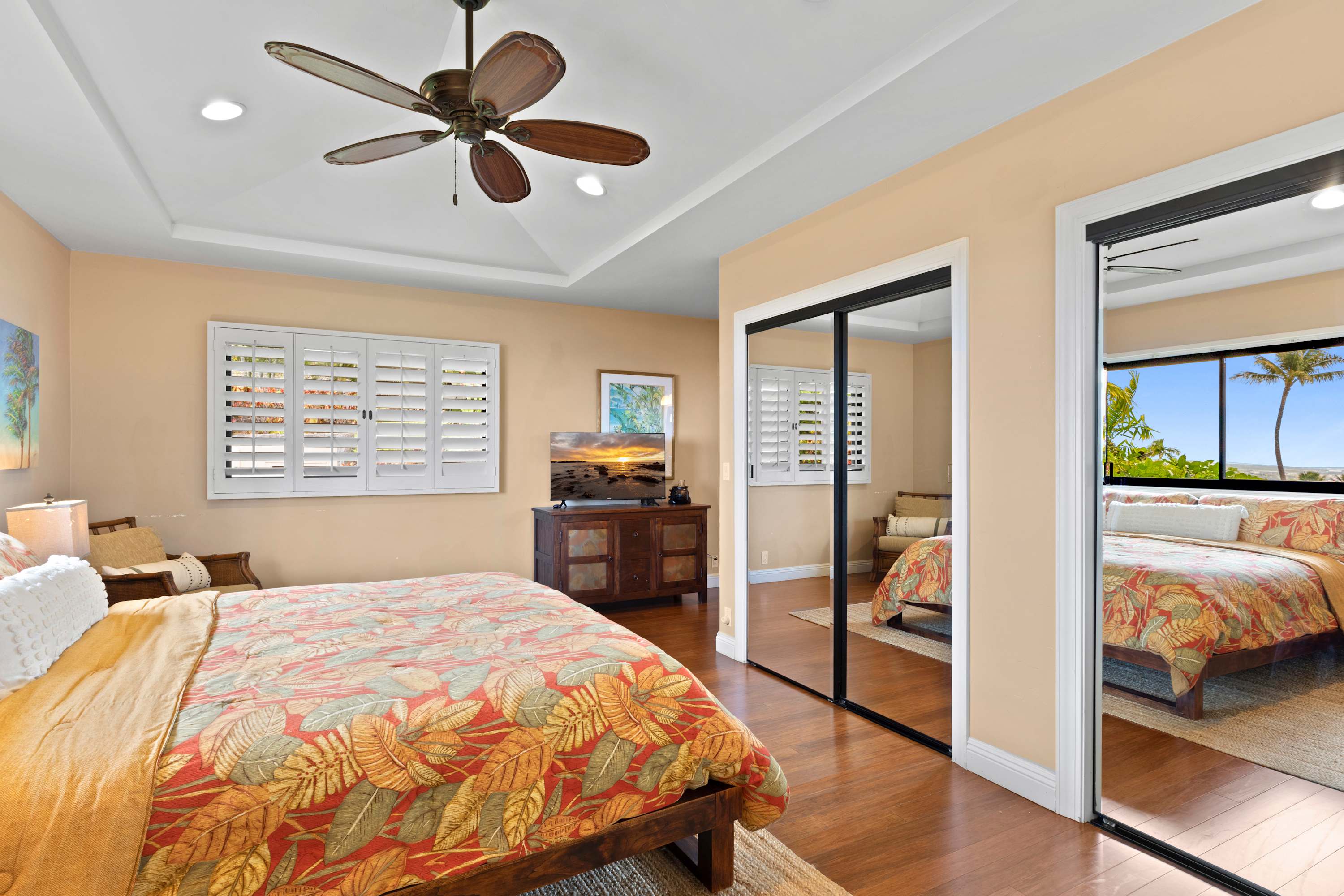 Bedroom #1 (Primary Suite) includes a king size bed, smart TV, and ensuite bathroom with 2 separate vanities, walk-in shower, and a soaking tub, and walk-in closet space. Sliding glass doors open onto the private lanai.