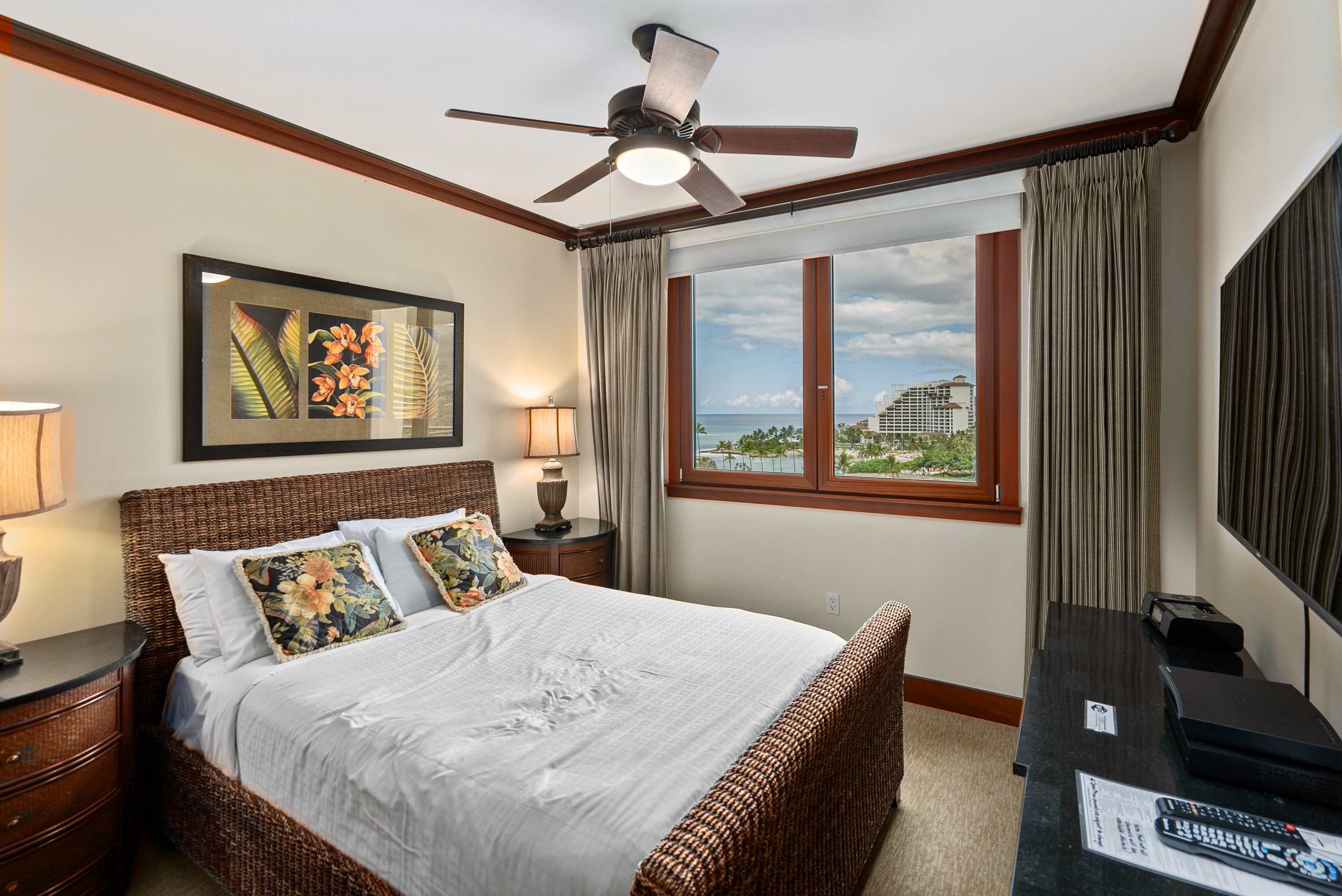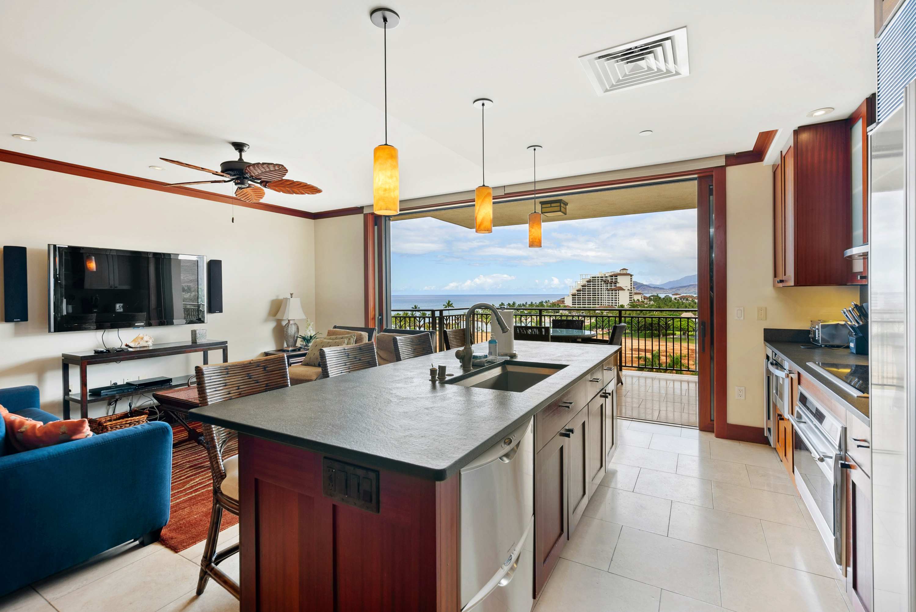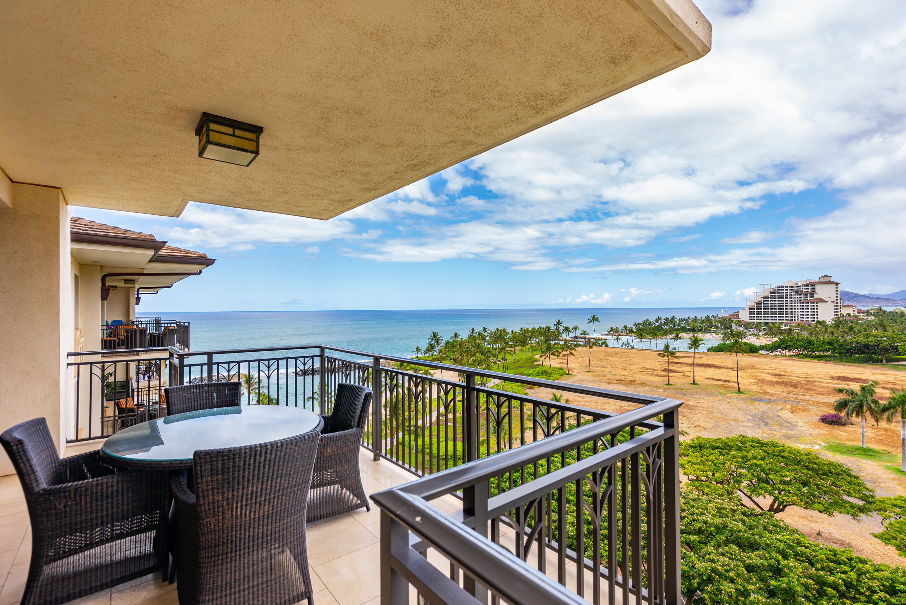 Once you're finally able to stop gazing at shimmering sunsets from your private deck, you'll find a stunning unit professionally designed with Adriana Hoyos furnishings and Chef Roy Yamaguchi's kitchen. Guests can experience serenity on the pristine golf course or lounge in the privacy of Ko Olina's secluded lagoons, known for their calm waters and good snorkel. Enjoy the beachside tiki bar, grill out with friends, or lounge poolside under palm trees. Tucked between exotic gardens and shimmering koi ponds, this space invites vacationers that are equal parts adventurous and relaxed.