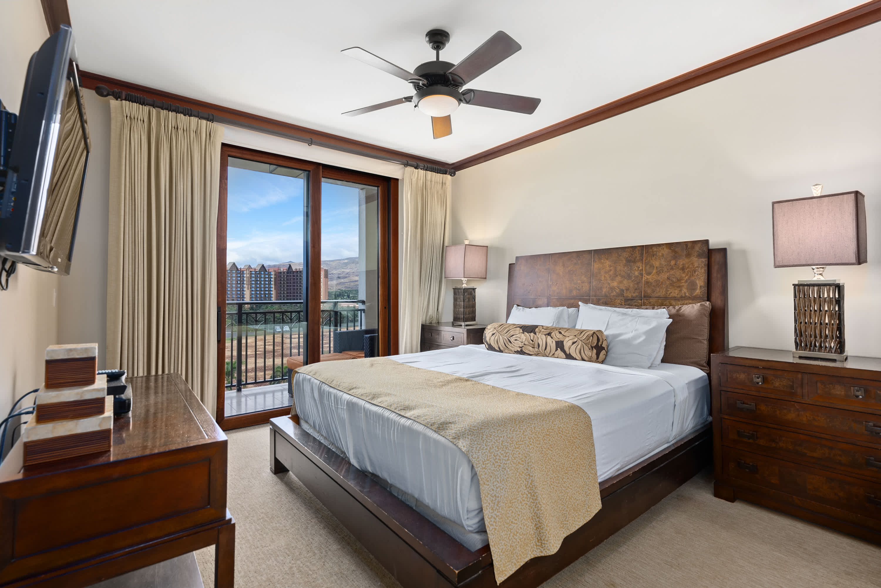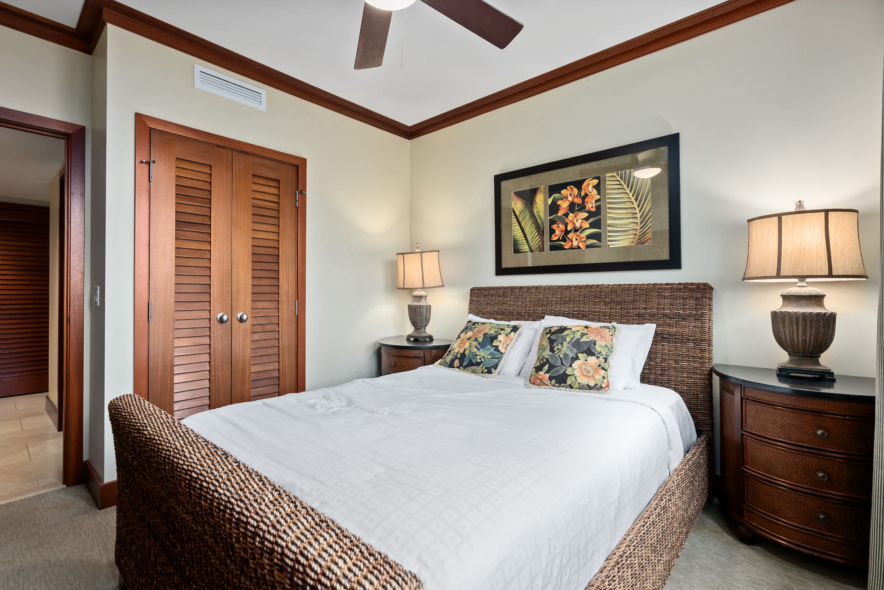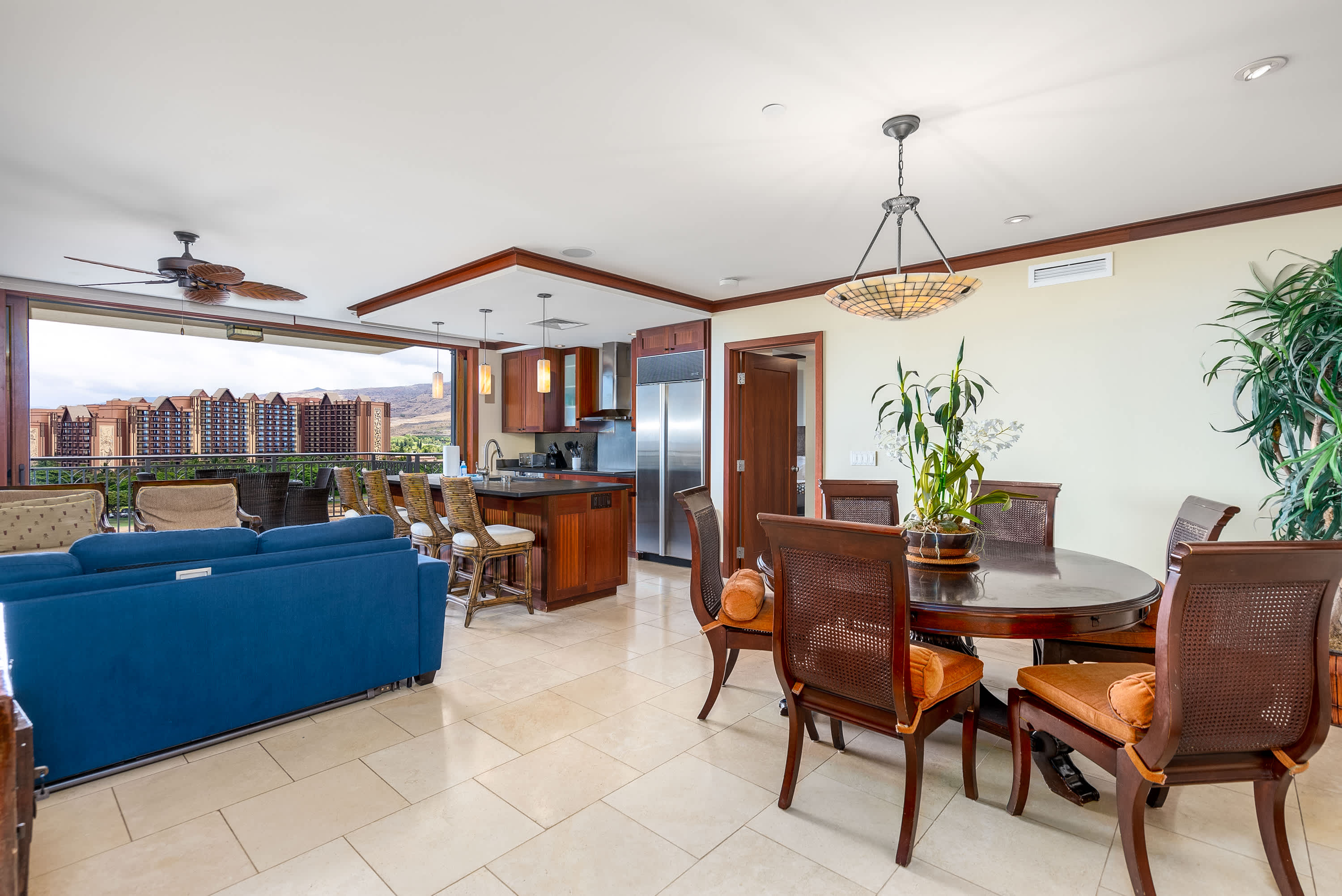 Once you're finally able to stop gazing at shimmering sunsets from your private deck, you'll find a stunning unit professionally designed with Adriana Hoyos furnishings and Chef Roy Yamaguchi's kitchen. Guests can experience serenity on the pristine golf course or lounge in the privacy of Ko Olina's secluded lagoons, known for their calm waters and good snorkel. Enjoy the beachside tiki bar, grill out with friends, or lounge poolside under palm trees. Tucked between exotic gardens and shimmering koi ponds, this space invites vacationers that are equal parts adventurous and relaxed.