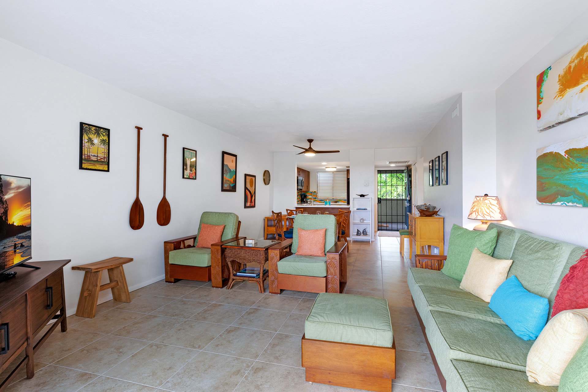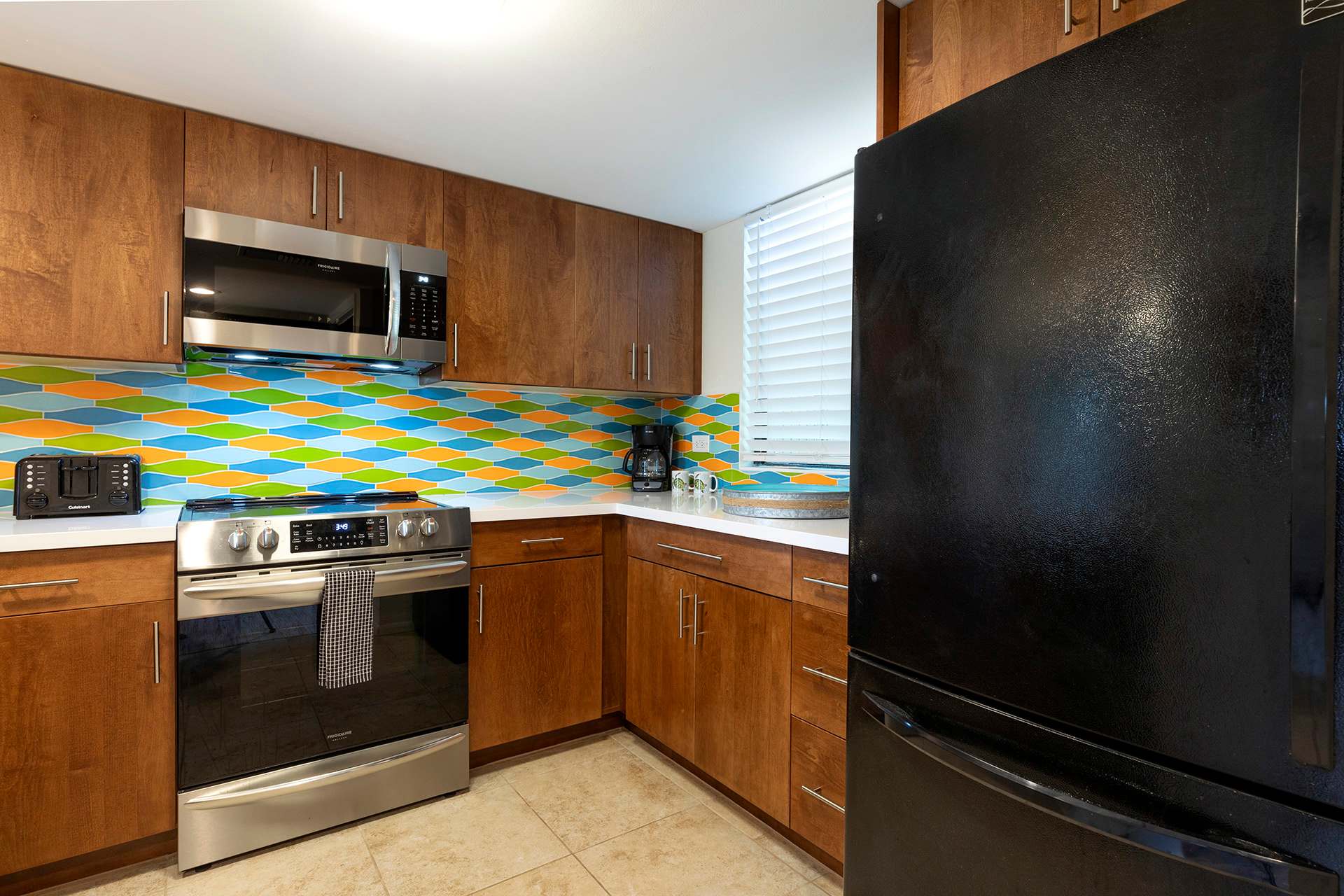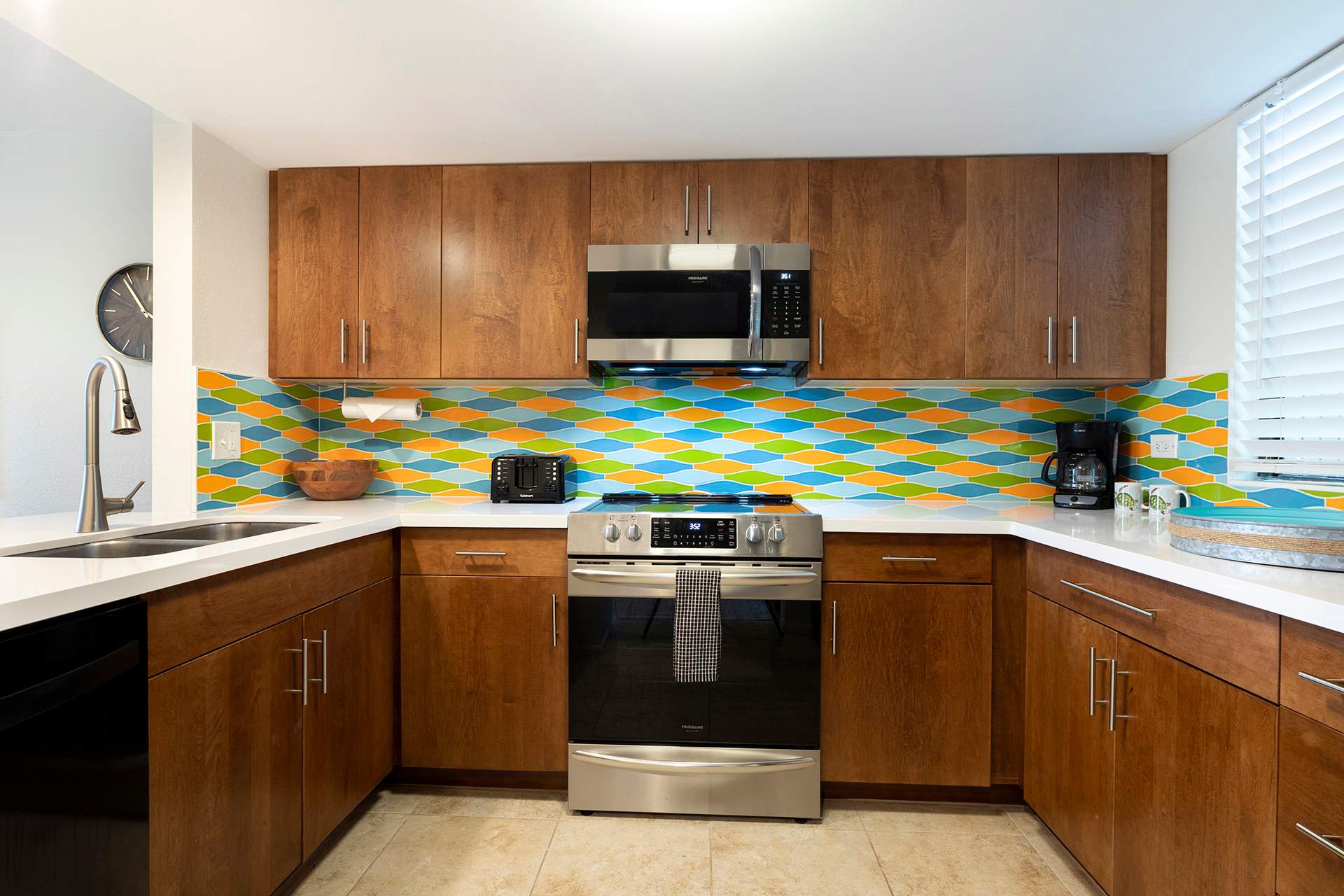 The aloha vibes find their way inside through colorful, laid-back design. As you step inside, you’ll come first into the fully updated and equipped kitchen which features high-end appliances, modern cabinetry, and vibrant backsplash. When you aren’t exploring the local food spots, conveniently prepare your own meals at home which you can share at the dining table set for 4 or at the kitchen counter with barstools for 2.