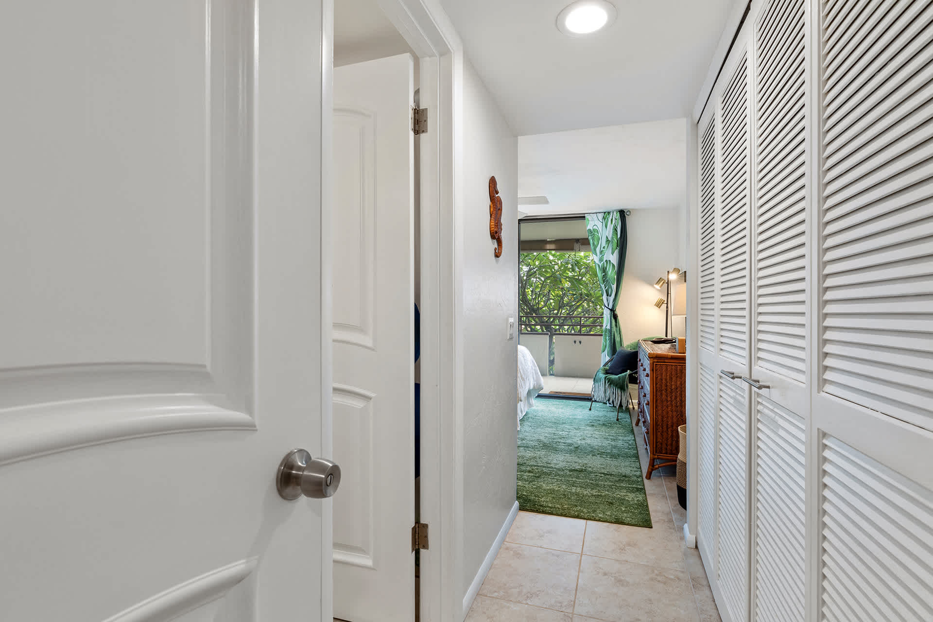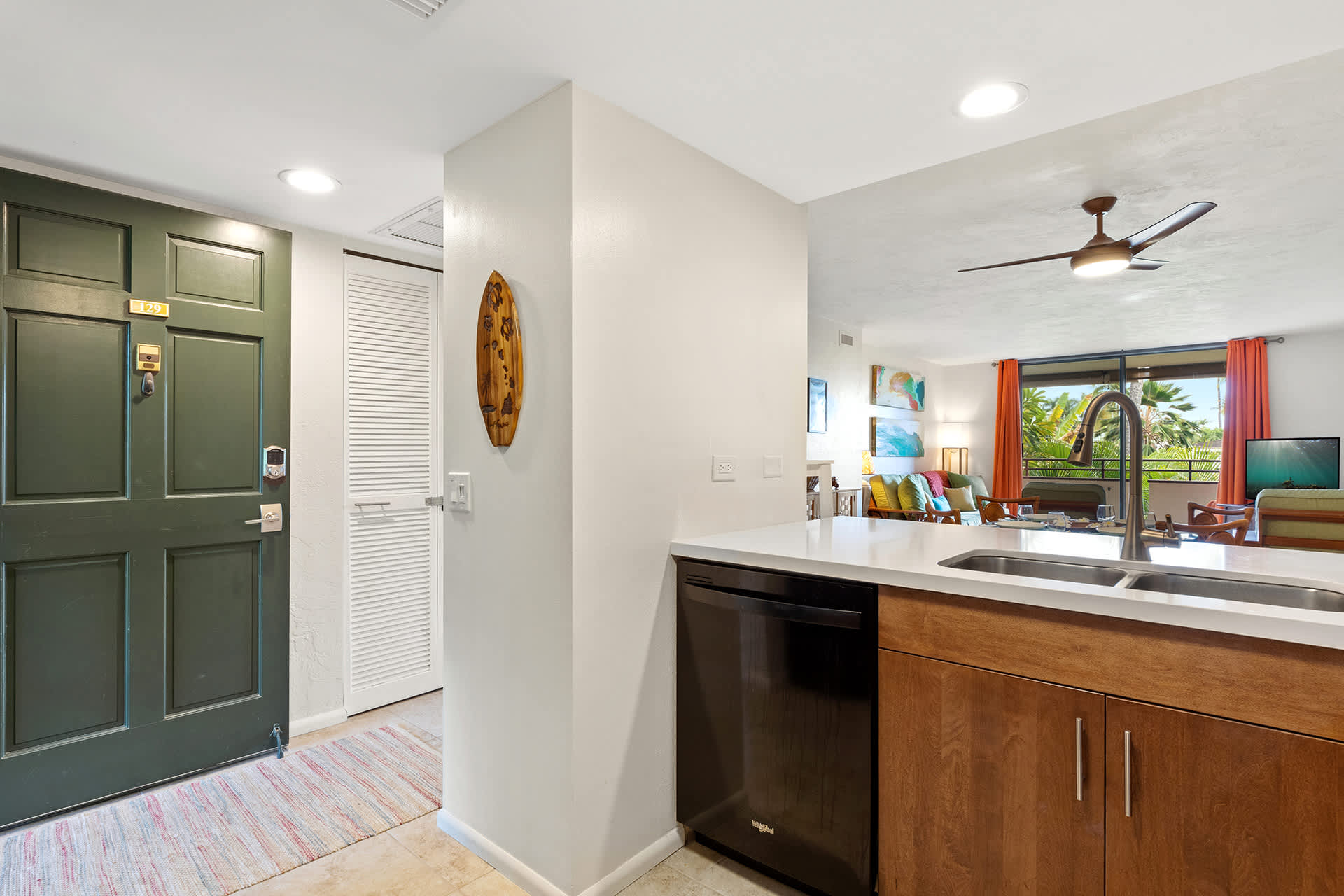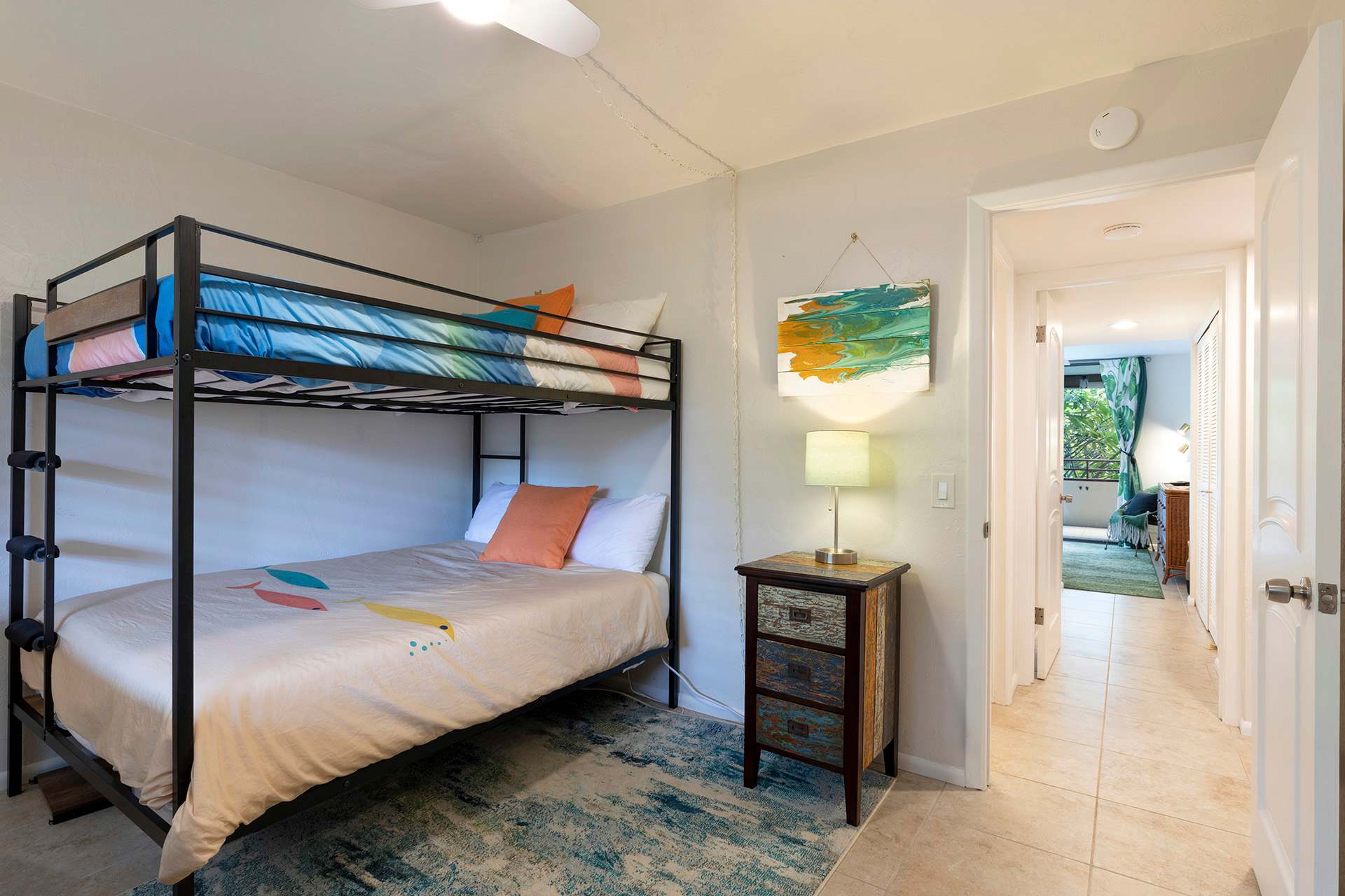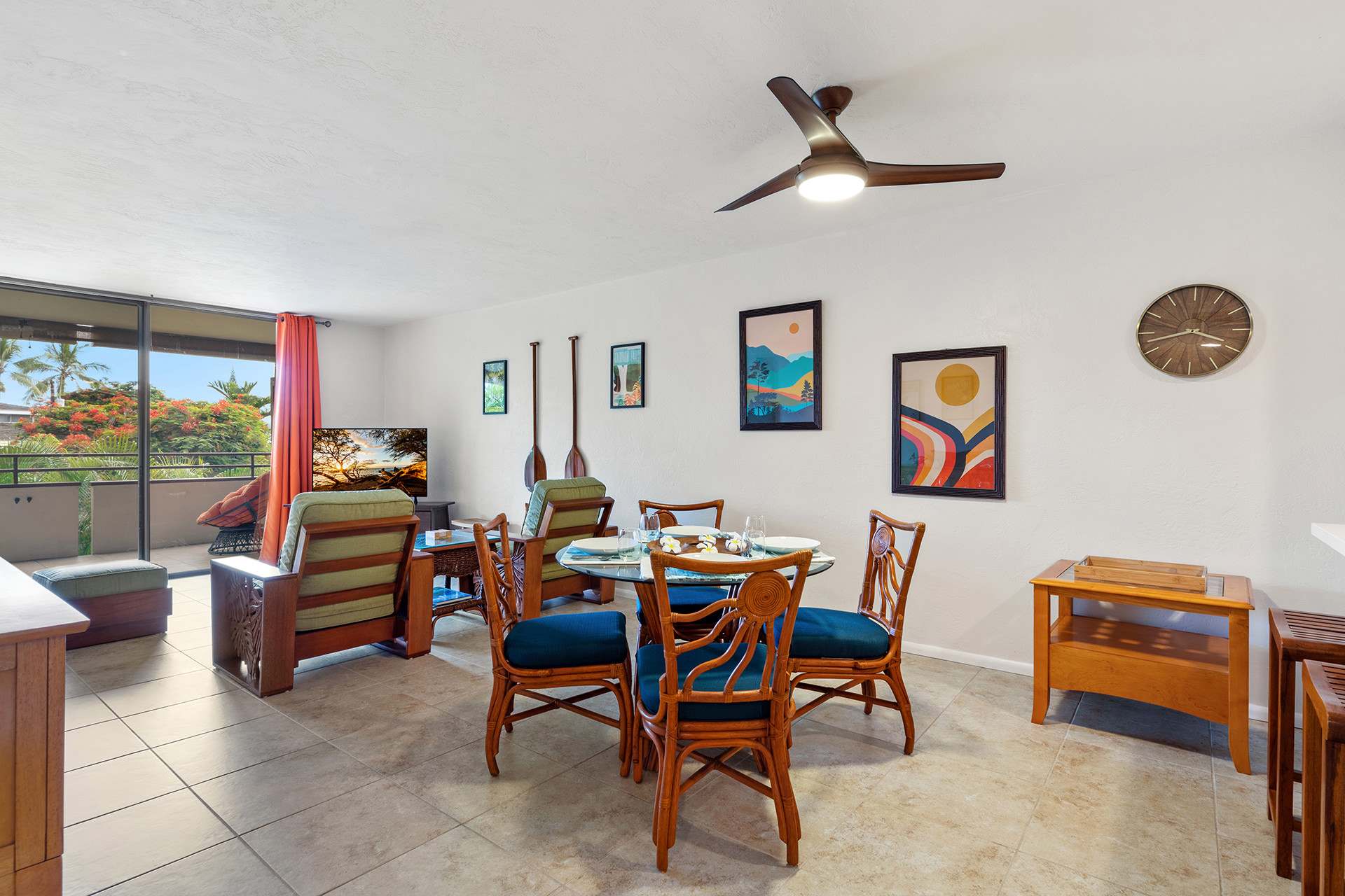The aloha vibes find their way inside through colorful, laid-back design. As you step inside, you’ll come first into the fully updated and equipped kitchen which features high-end appliances, modern cabinetry, and vibrant backsplash. When you aren’t exploring the local food spots, conveniently prepare your own meals at home which you can share at the dining table set for 4 or at the kitchen counter with barstools for 2.