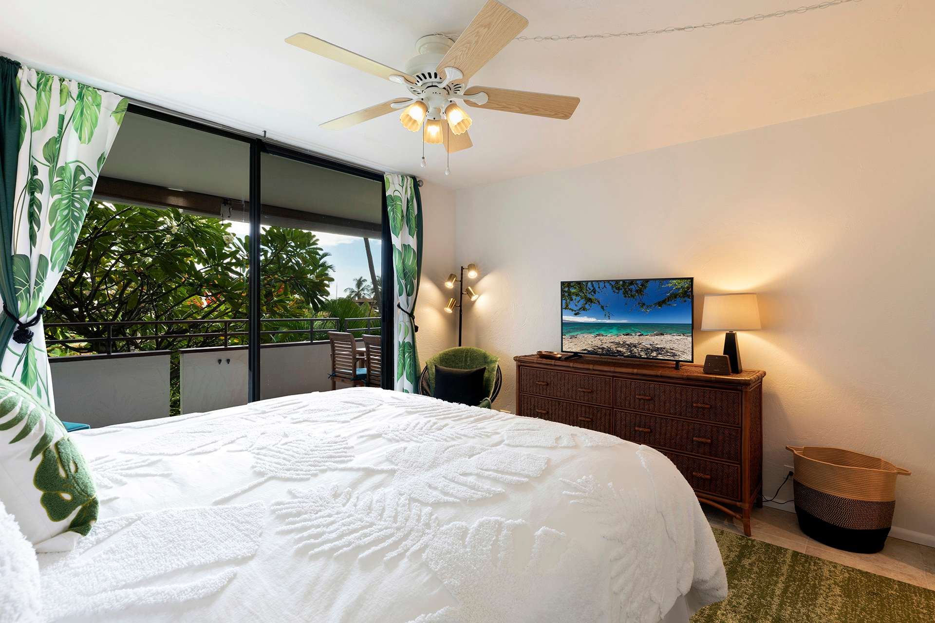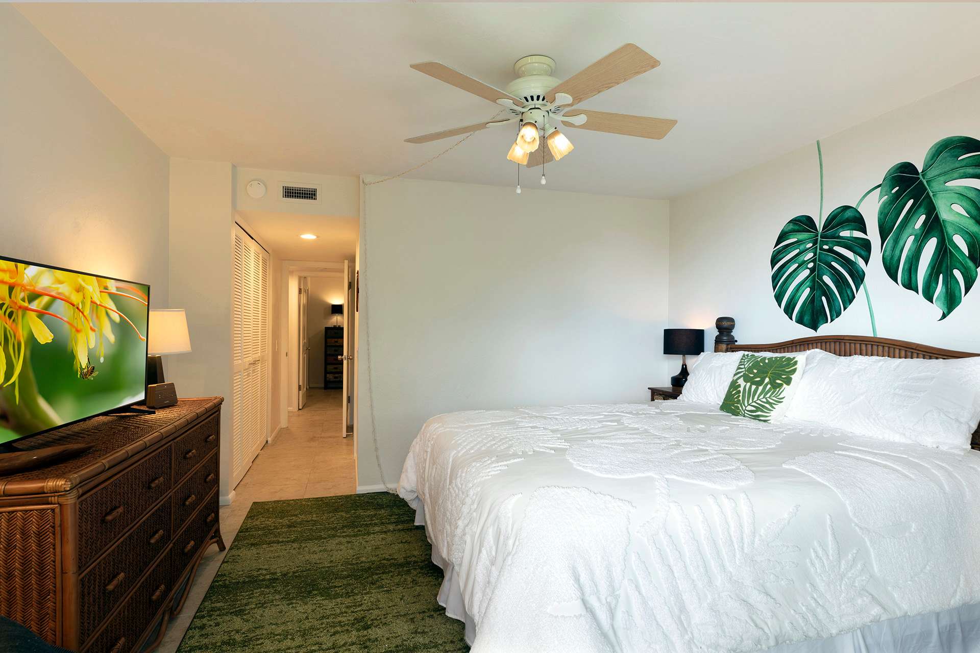 Bedroom #1 is the primary suite with a king size bed, smart tv, tropical design, and ensuite bathroom with walk-in shower. Sliding glass doors provide direct access to the home’s lanai.
