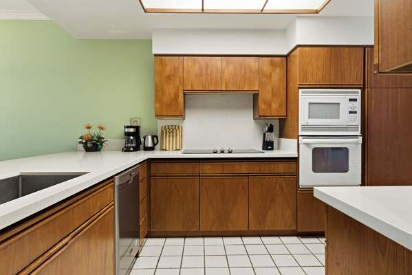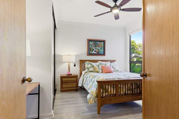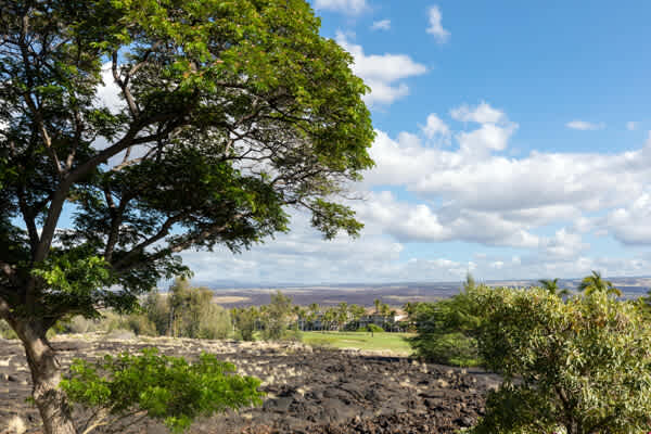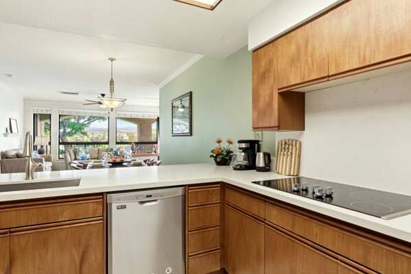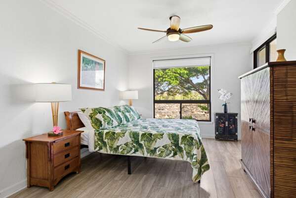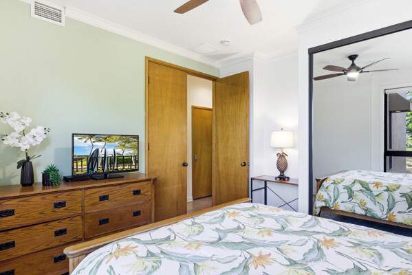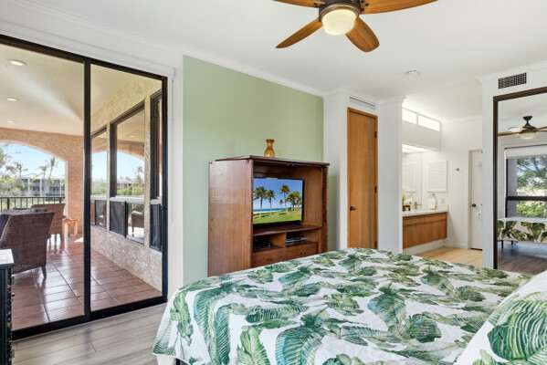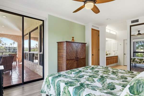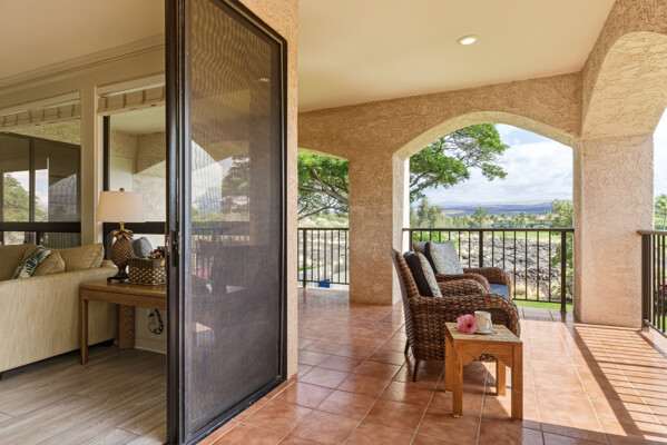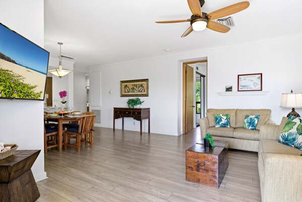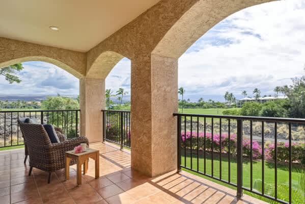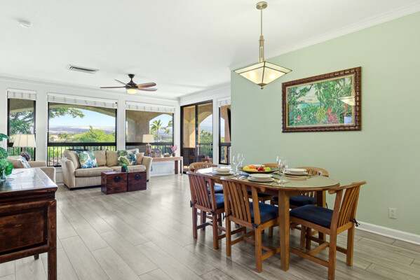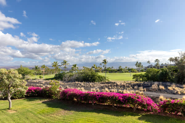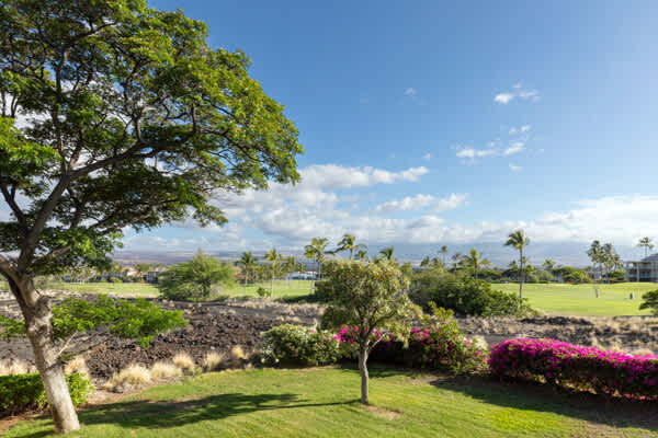 The breezy living room is furnished with seating gathered around a flat screen TV and access to the lanai. The spacious lanai provides beautiful greenery views of the golf course and resort. Sit out here with your Kona coffee and soak in the Hawaii sun!