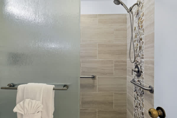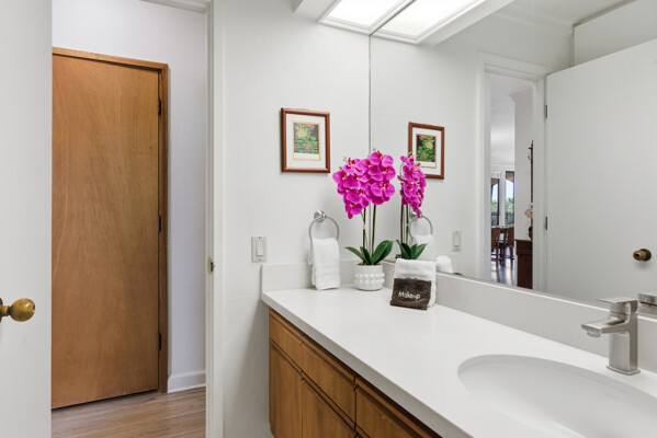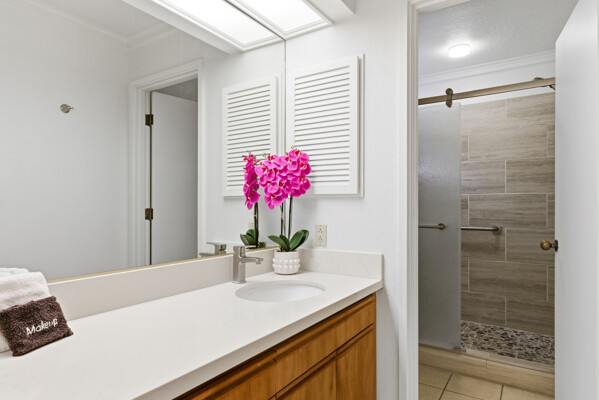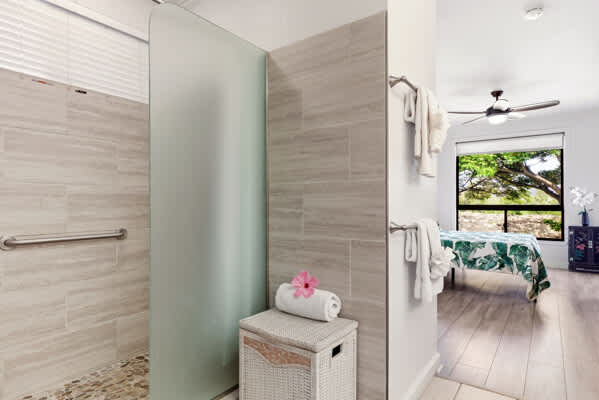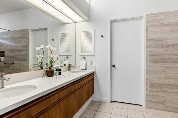There are 2 bedrooms to chose from. The main bedroom has a California King bed, flat screen TV, en suite bathroom, and access to the lanai. The en suite bathroom has dual sinks and a standing shower. The 2nd bedroom holds a Queen bed and a flat screen TV. There is also a 2nd shared full bathroom.