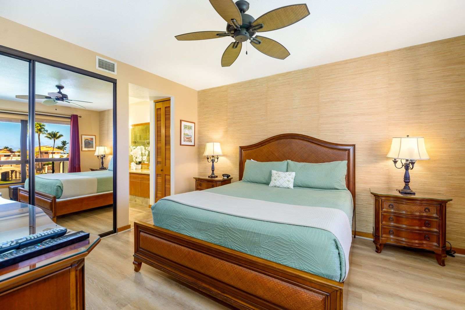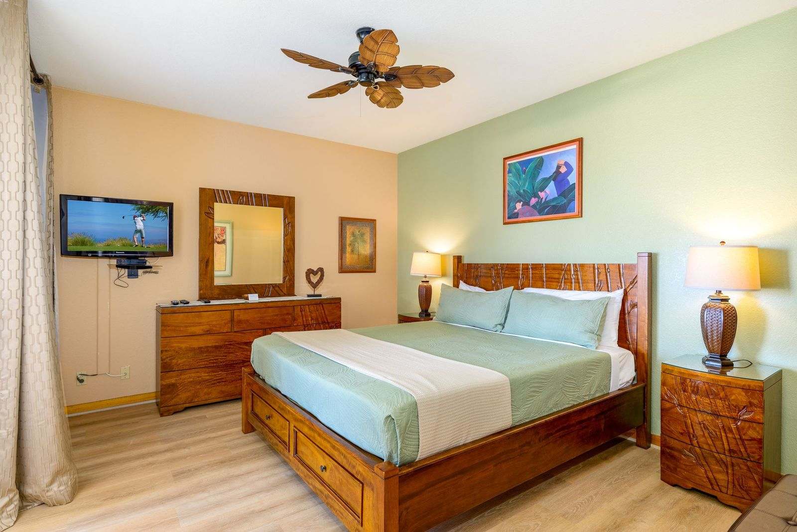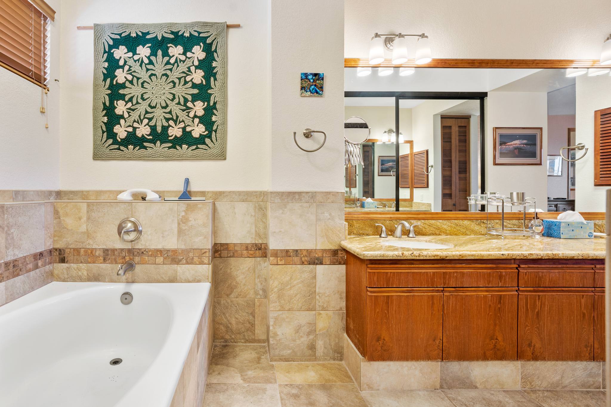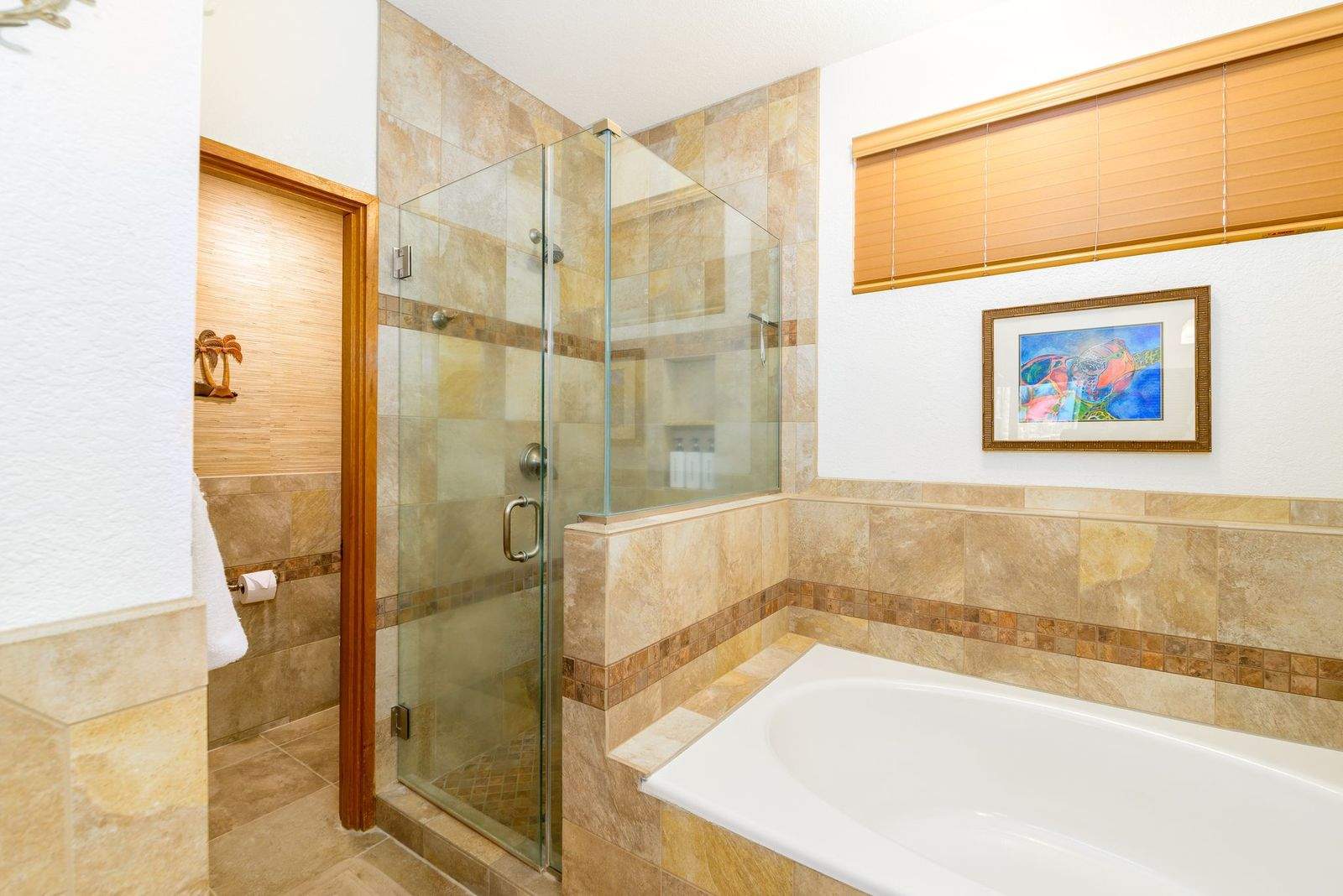 The main bedroom holds a King bed, TV, and en suite bathroom. The large en suite bathroom has dual sinks, a soaking tub, and walk in shower. The 2nd bedroom similarly has a King bed, TV, and access to the lanai. The 2nd full bathroom is right by the 2nd bedroom.