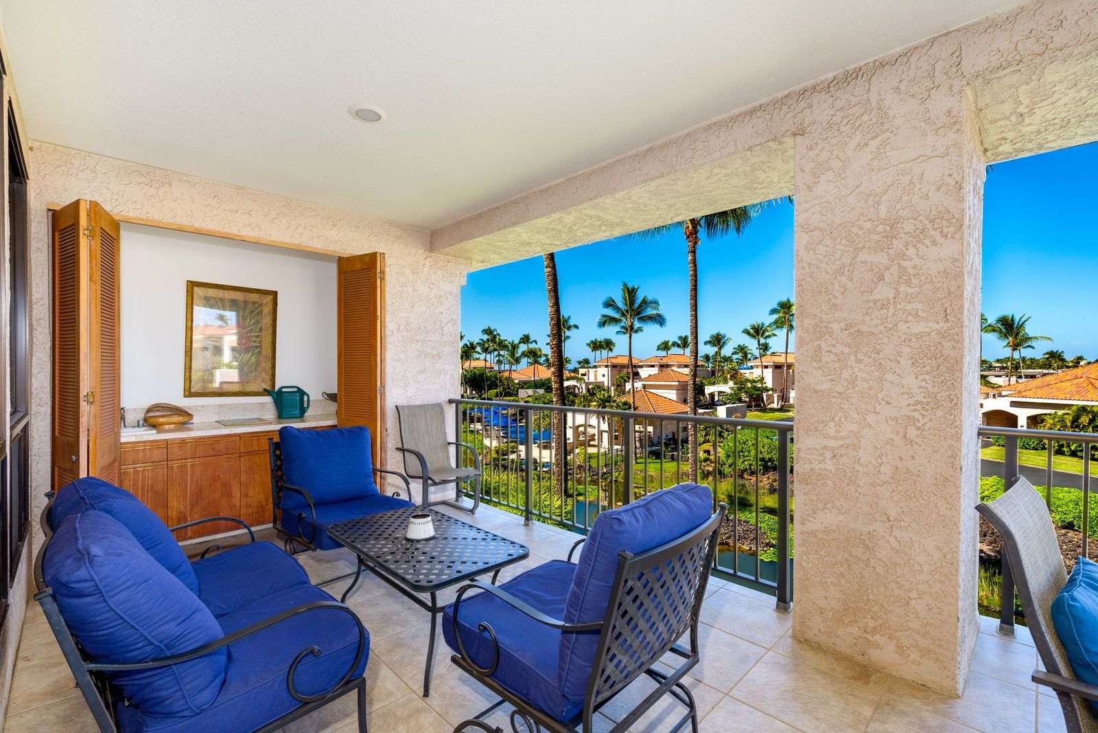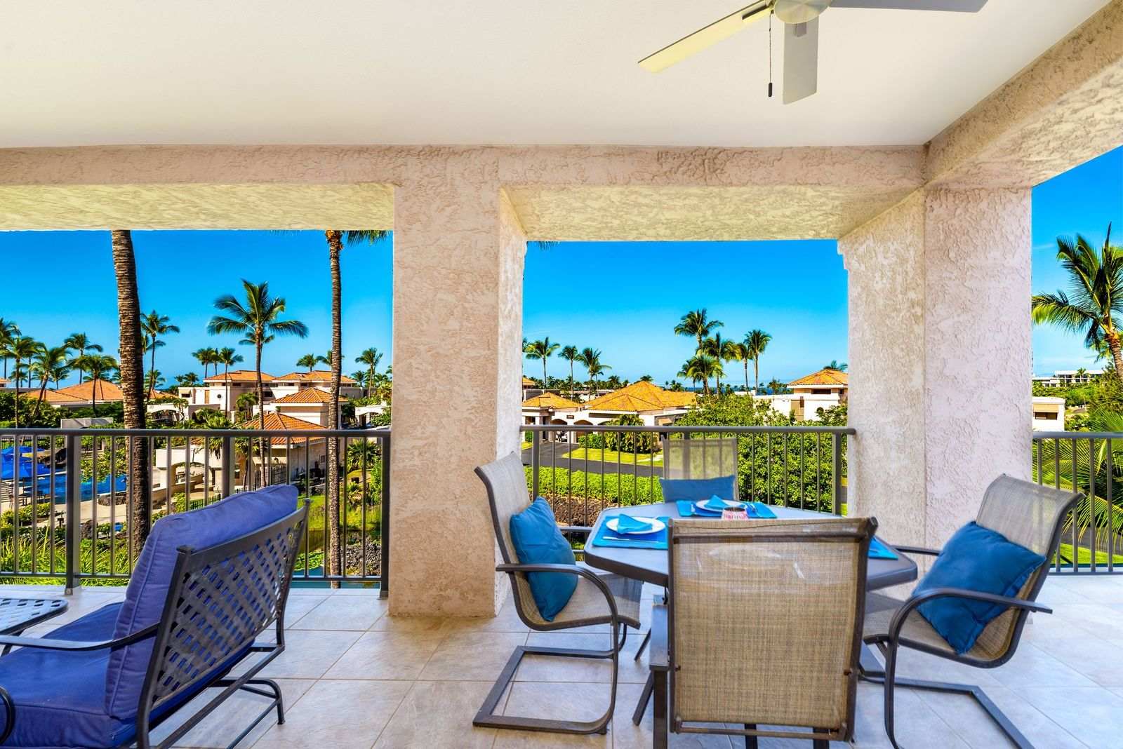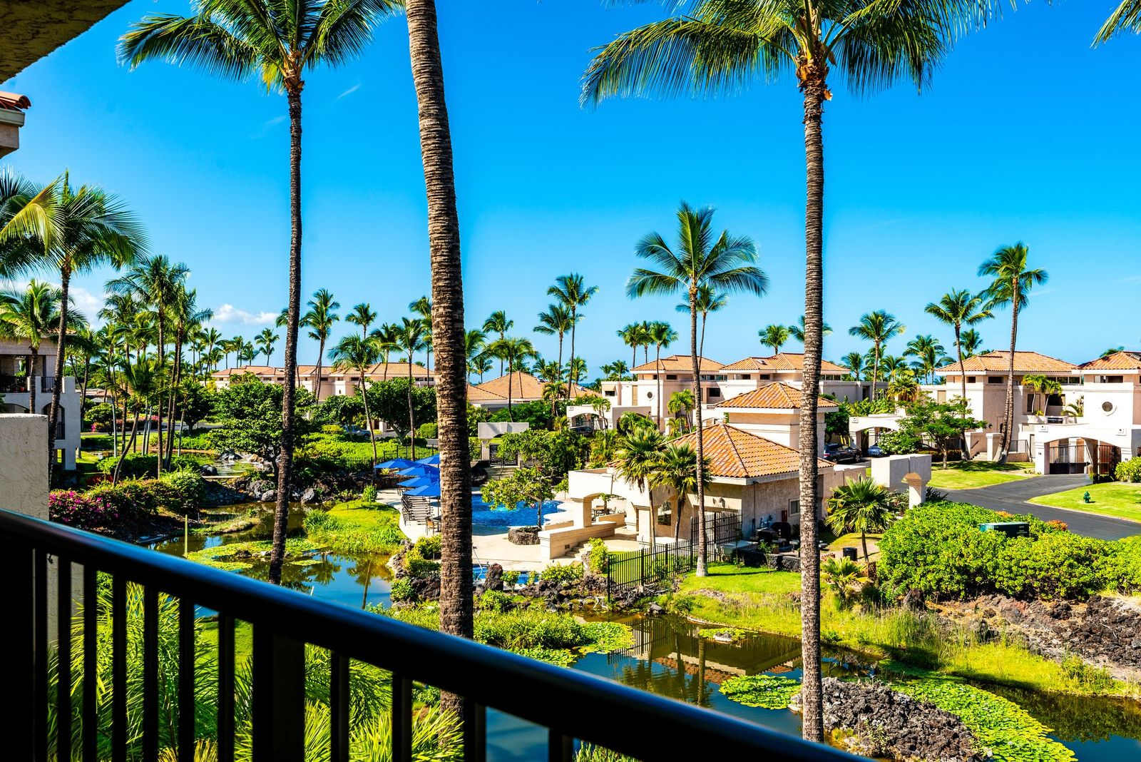 This tropical top floor penthouse offers beautiful resort views and peek a boo ocean views that look towards the Hilton Waikoloa hotel. The Waikoloa Beach Resort features luscious greenery, koi ponds, a shared swimming pool, a fitness room, and BBQ stations to enjoy. Maximum occupancy strictly enforced in accordance with local ordinances.