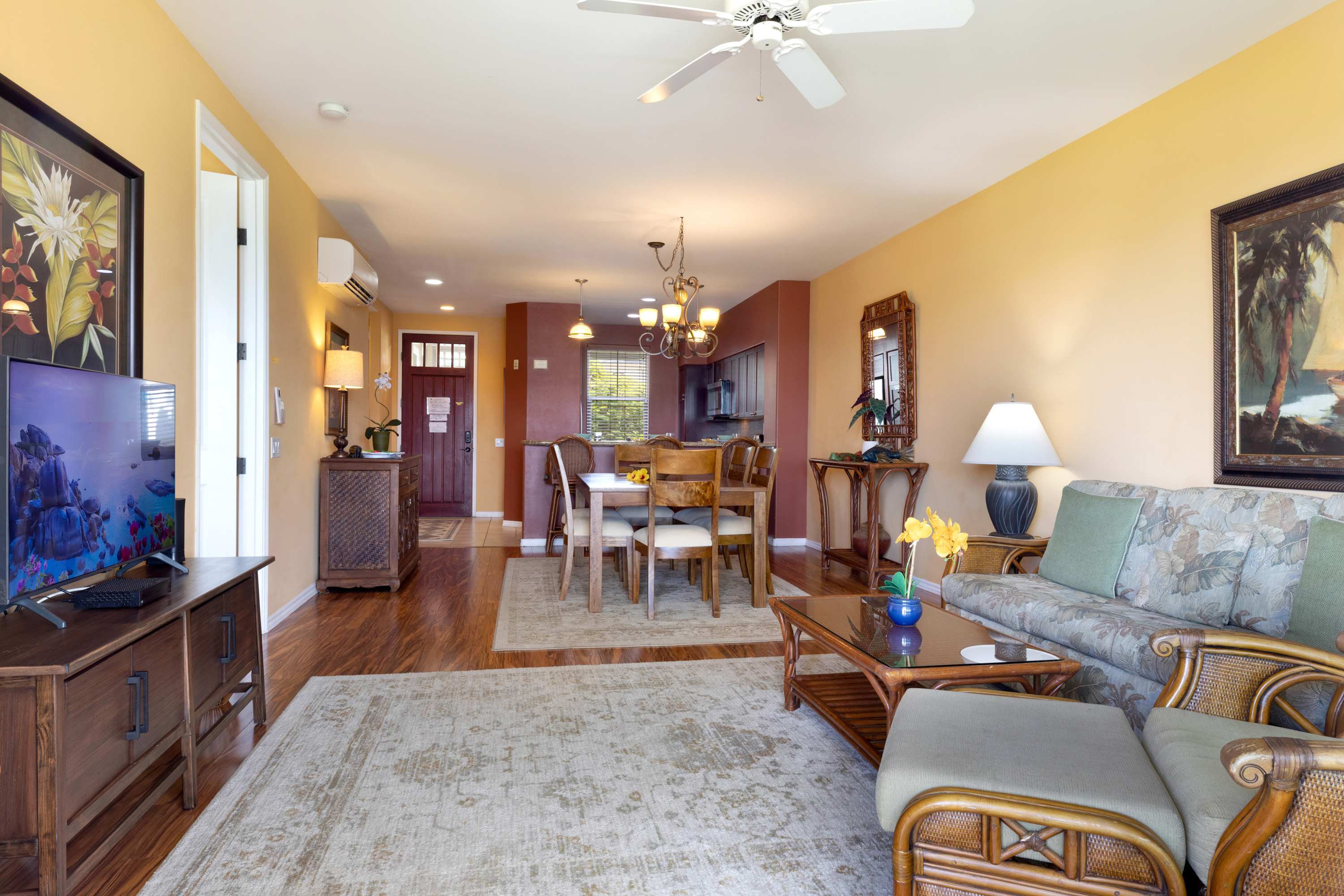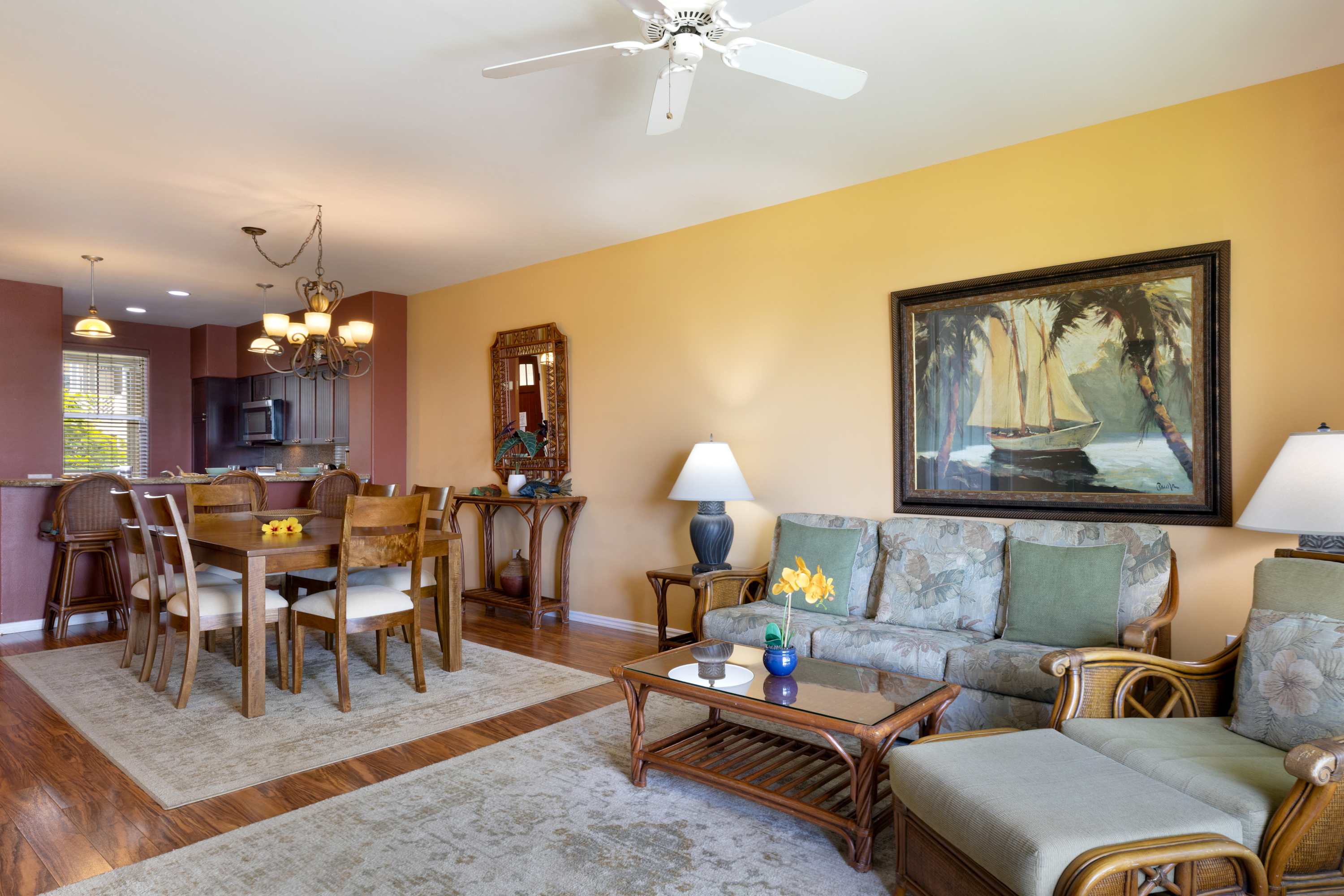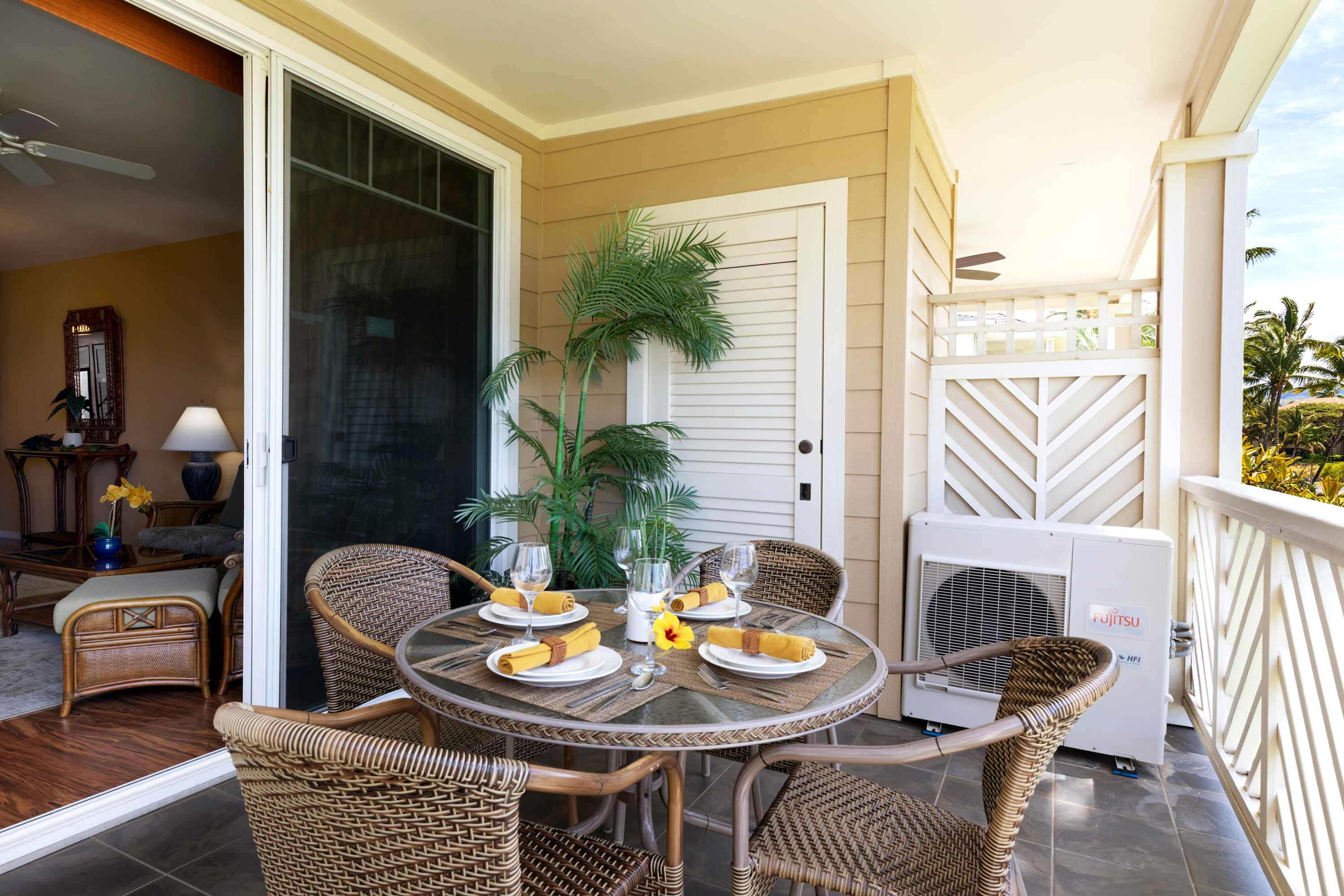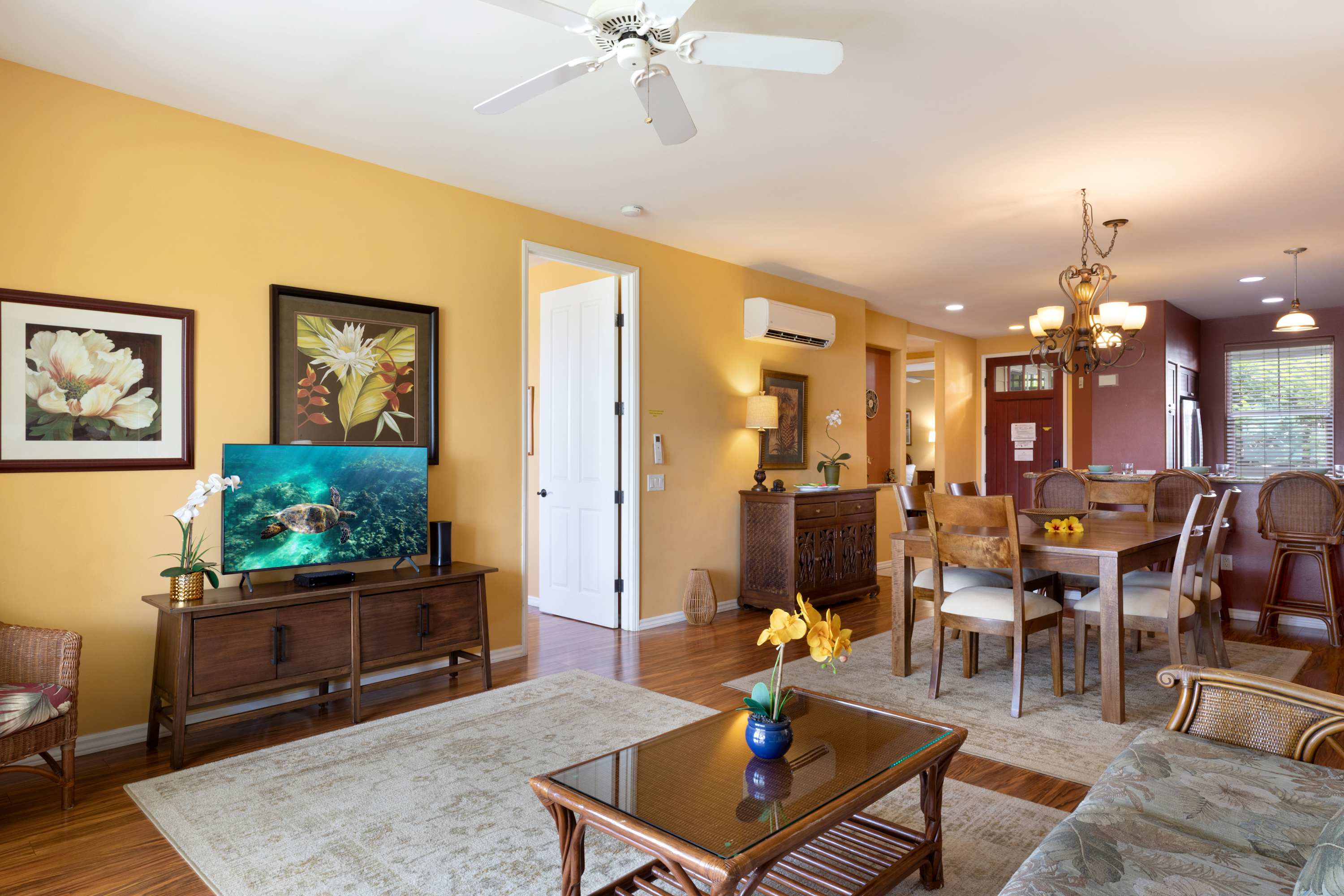 Step inside the luxurious villa to be greeted by Hawaiian decor and island furnishings! The living room is well situated with a cable TV, DVD player, and lanai access. Enjoy your morning coffee out on the lanai overlooking the golf course and reservoir. There is air conditioning available to stay cool during the warm summer days.