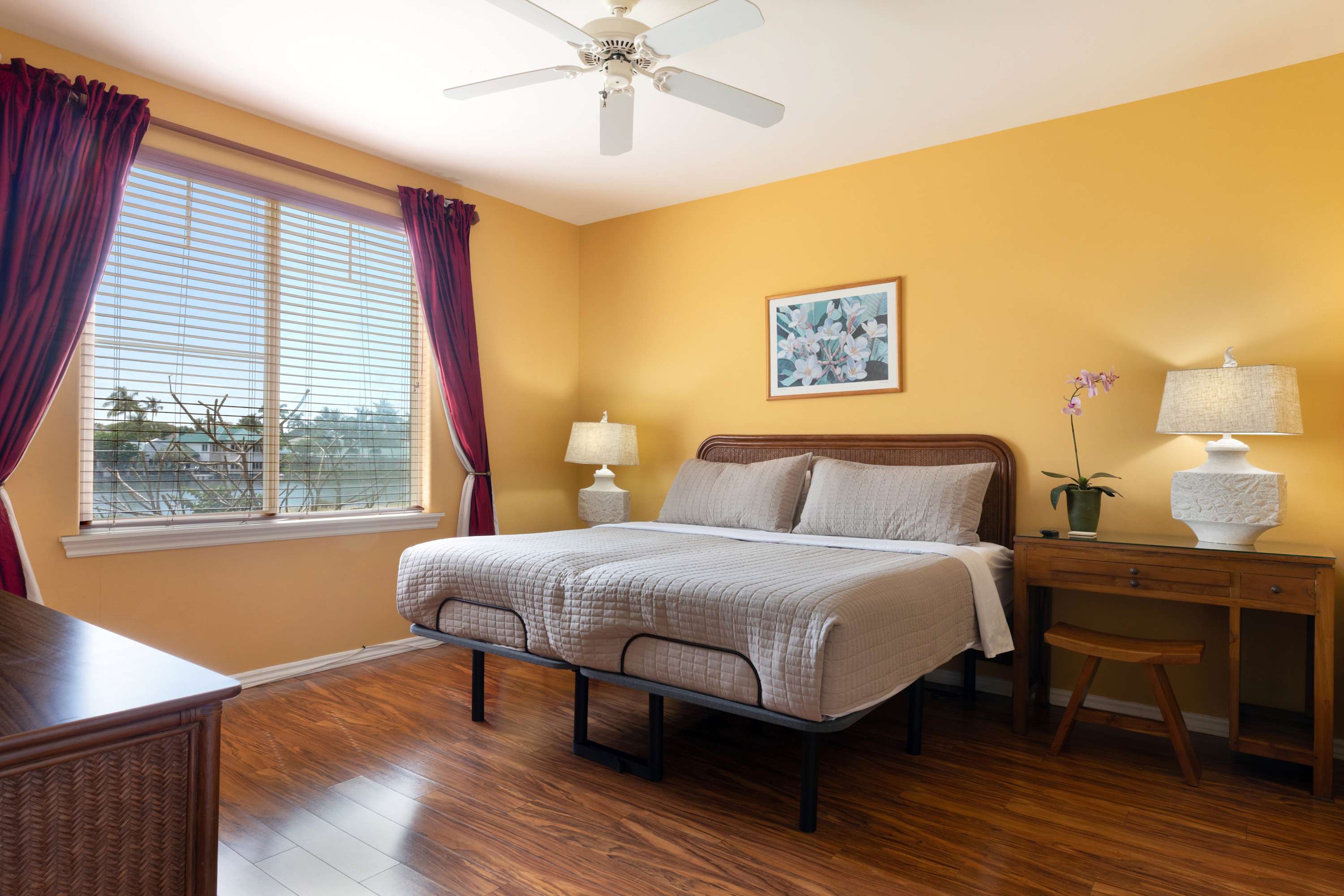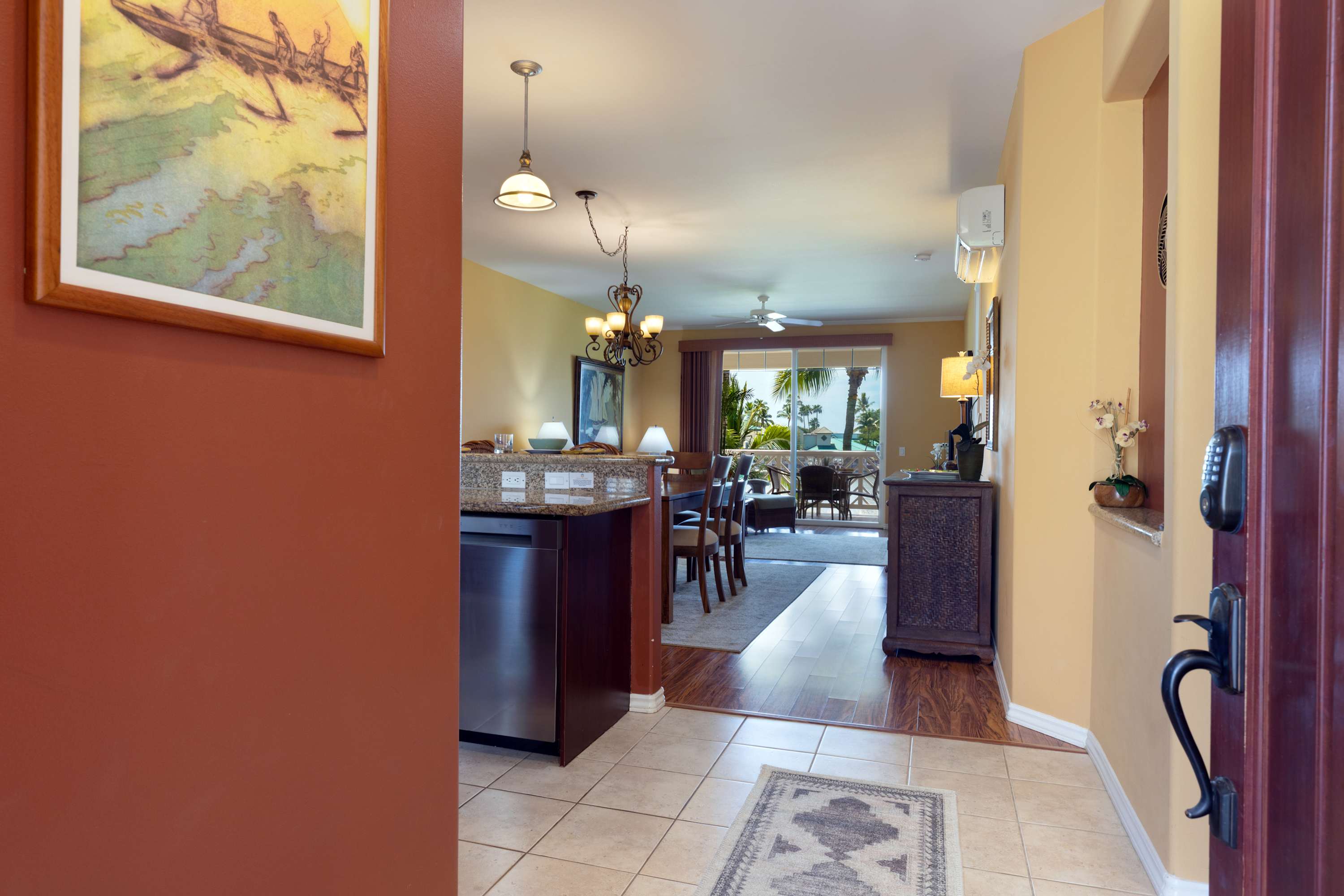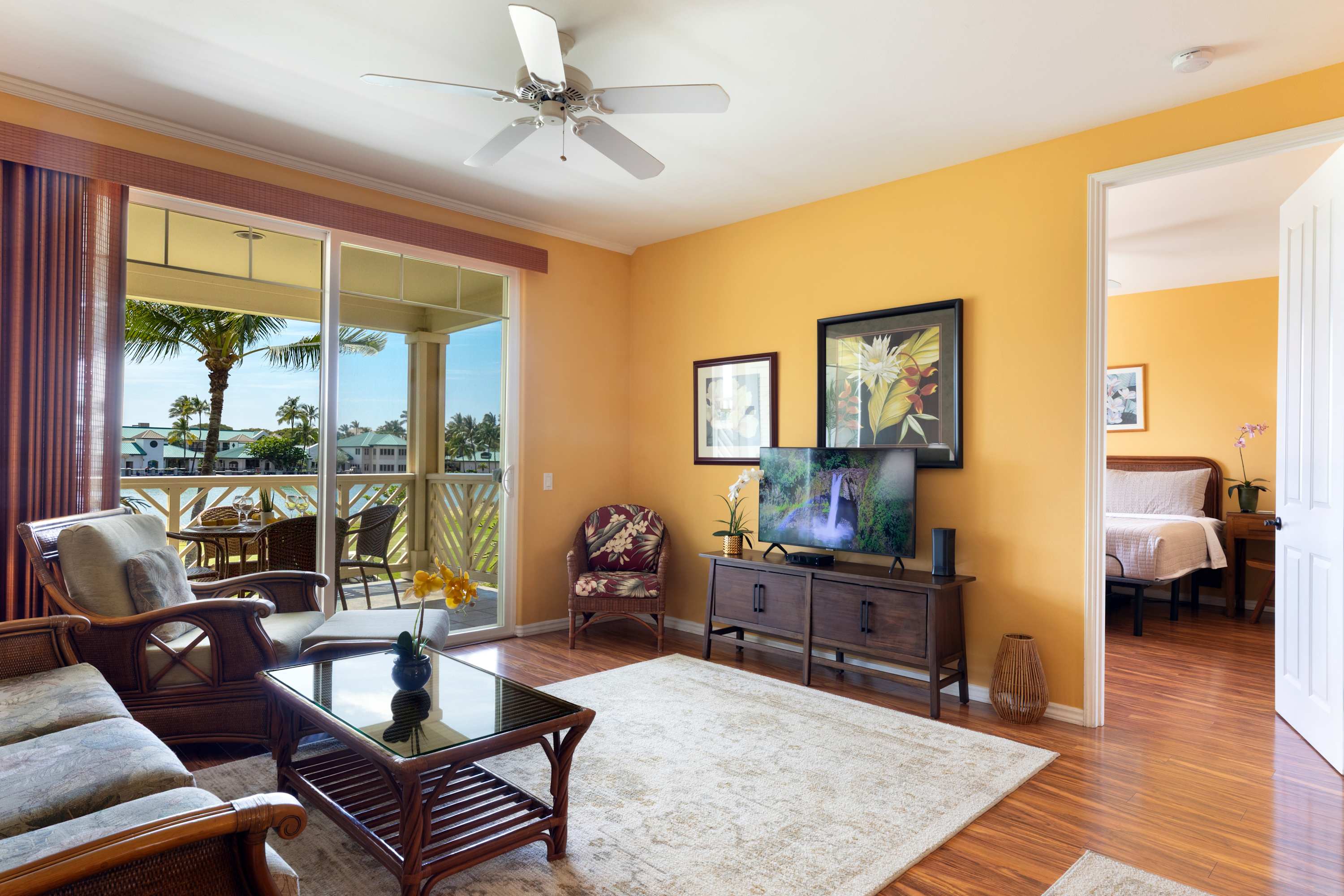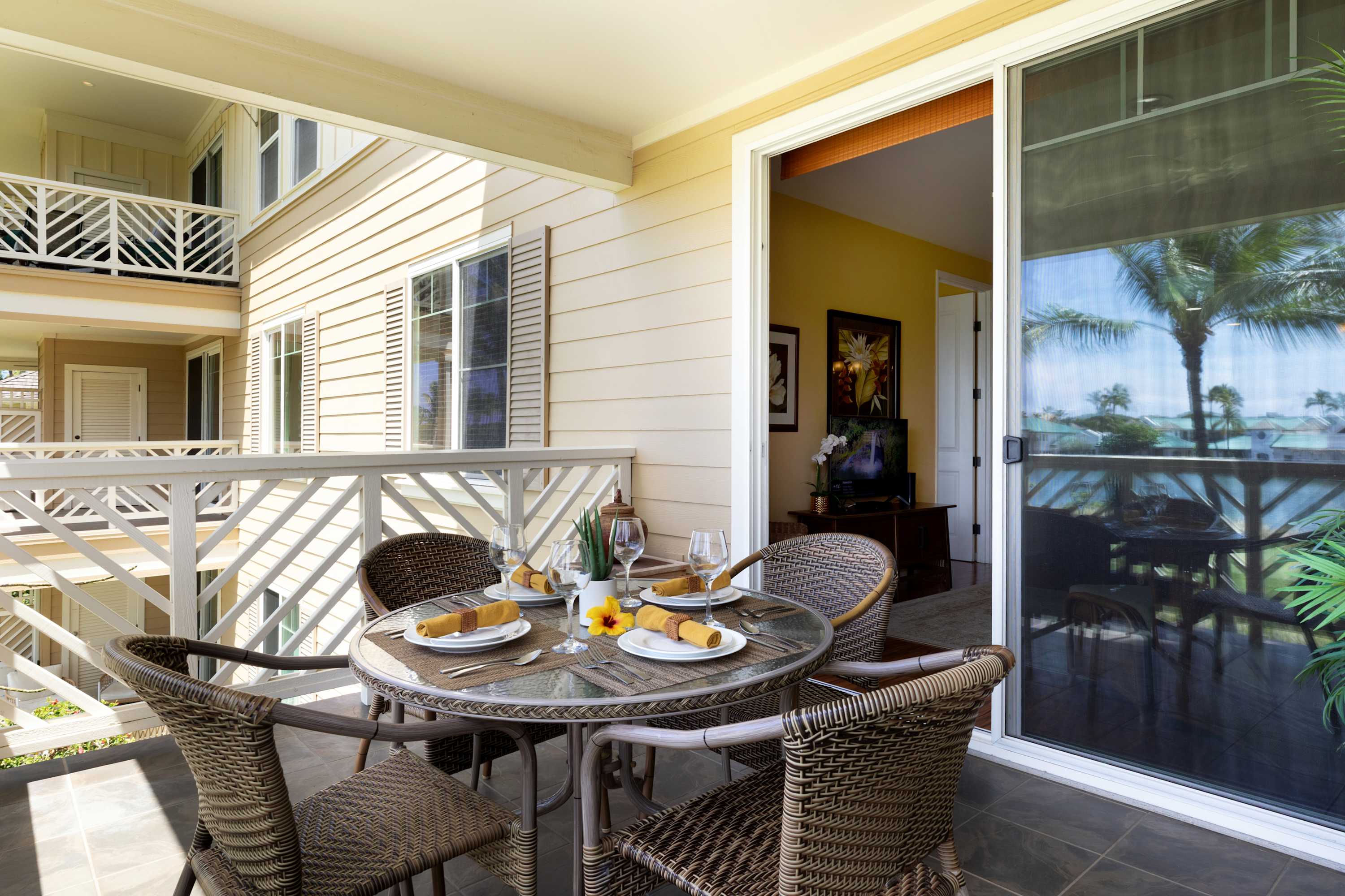Step inside the luxurious villa to be greeted by Hawaiian decor and island furnishings! The living room is well situated with a cable TV, DVD player, and lanai access. Enjoy your morning coffee out on the lanai overlooking the golf course and reservoir. There is air conditioning available to stay cool during the warm summer days.