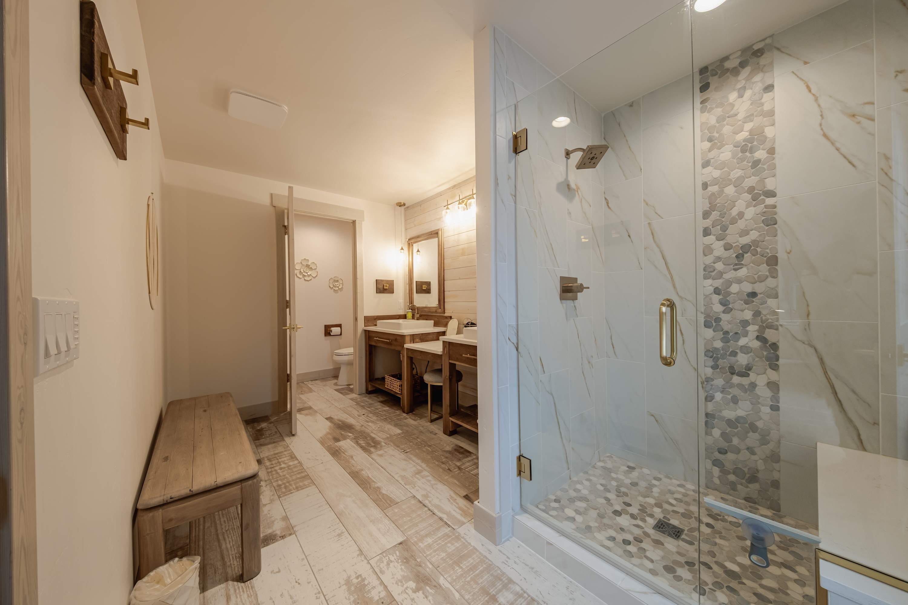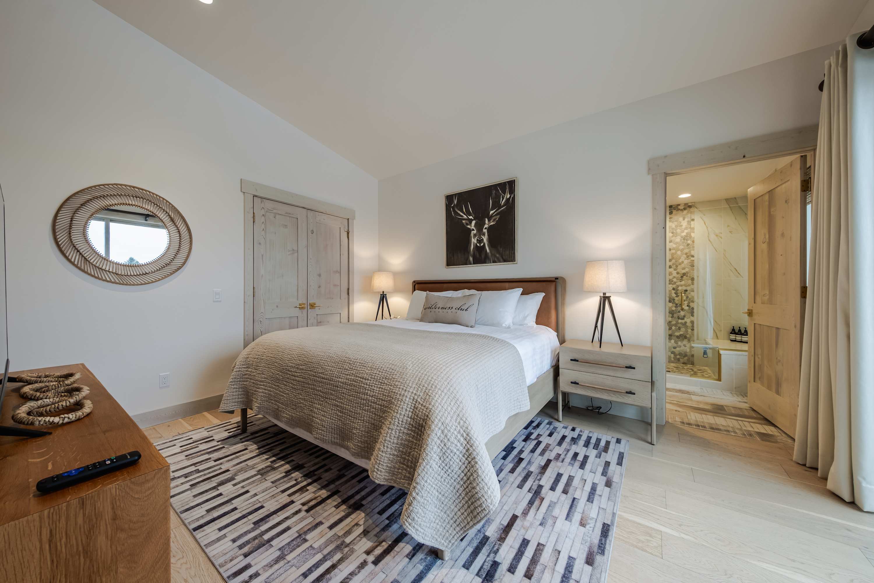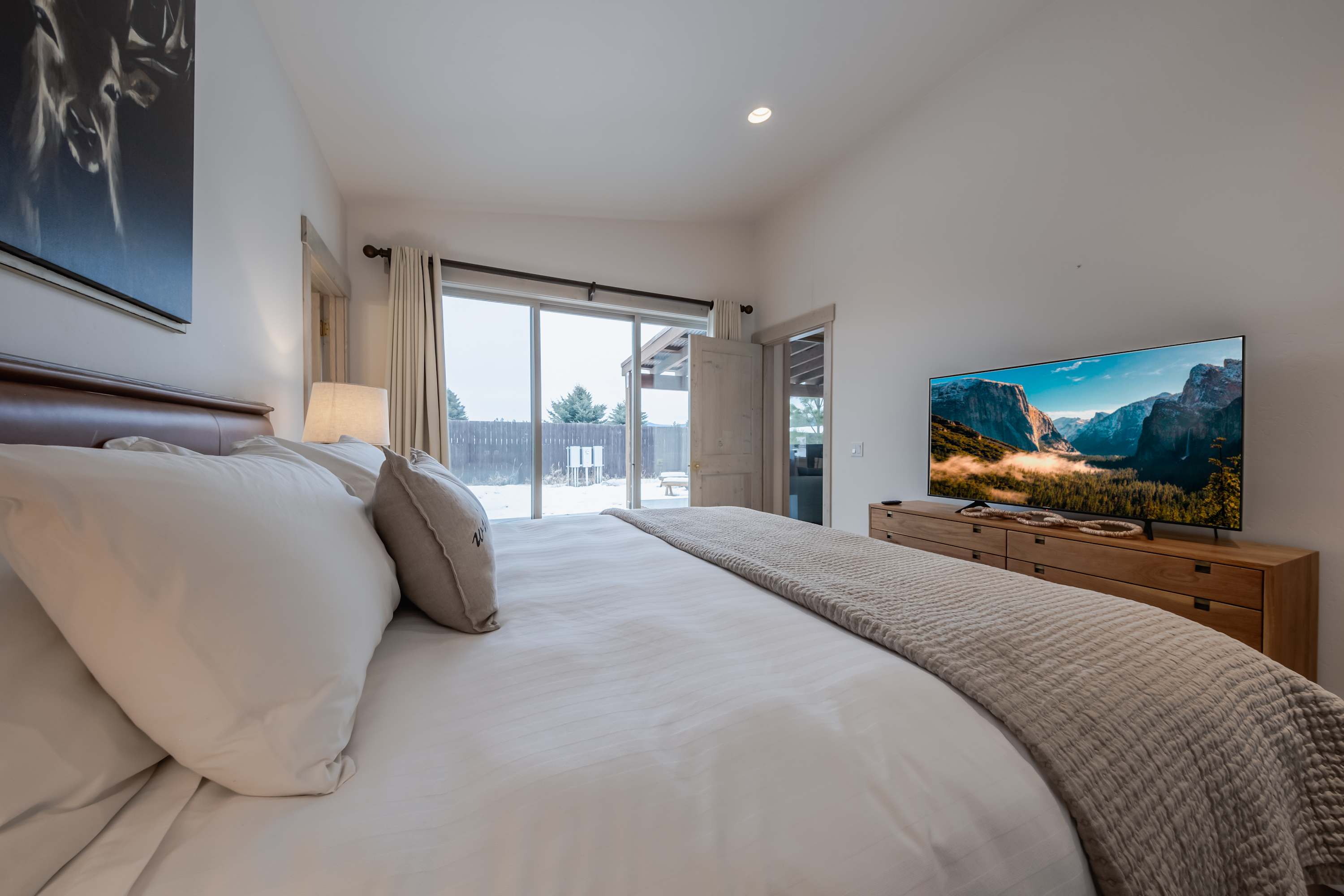 Bedroom #1 includes a king size bed, smart TV, deck access, and ensuite bathroom with a dual vanity and glass walk-in shower.