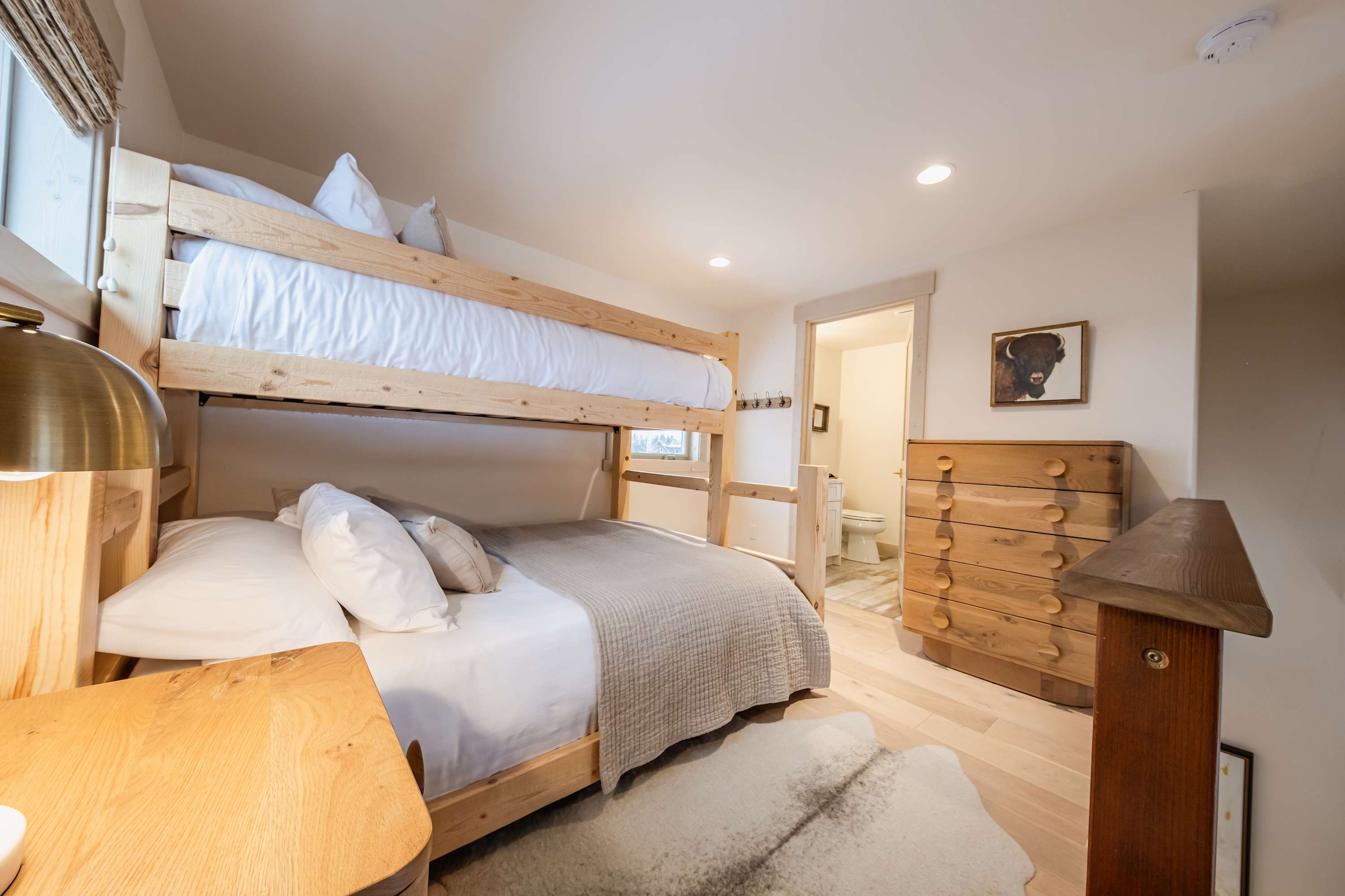 Bedroom #2 includes a twin-over-queen bunk bed and ensuite bathroom with a single vanity and shower/tub combo.