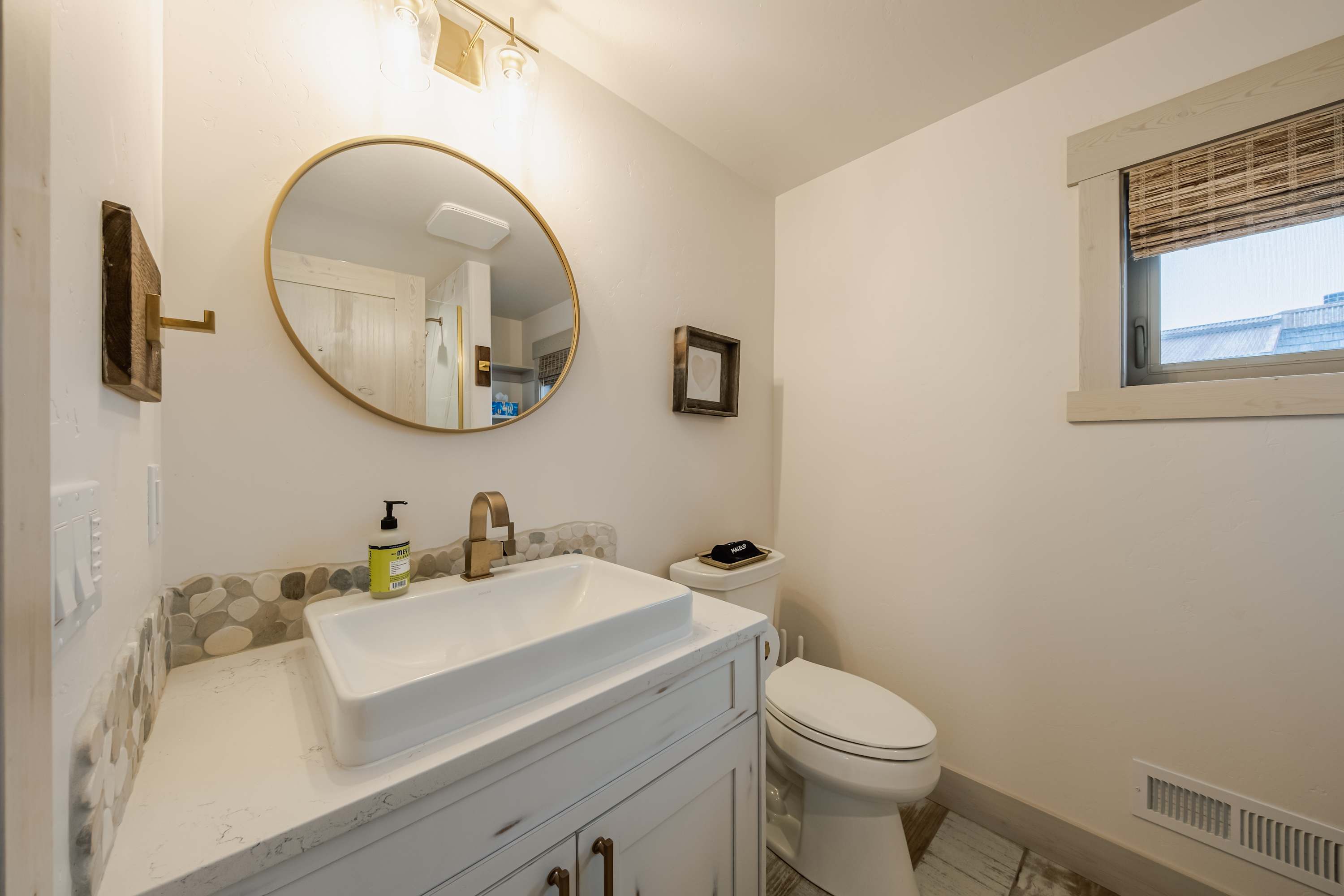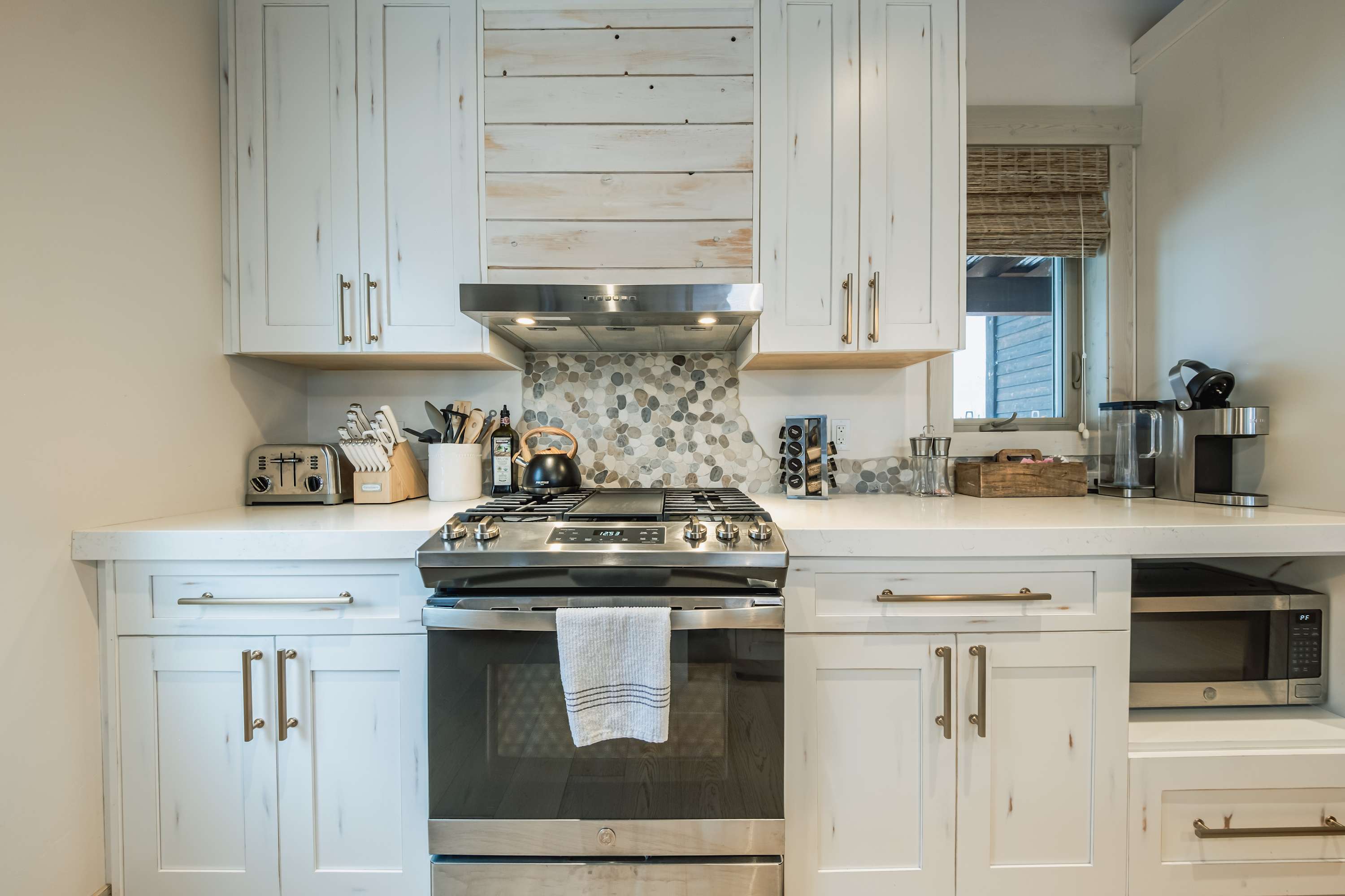 Indoors, vaulted ceilings sit atop a desirable open floorplan, with large picture windows illuminating rooms in abundant, natural light. Sink into plush sofa and armchair seating in the living room while you keep up with episodes of all your favorite stream-ready shows on the mounted smart TV with a Sonos sound system, and the crackling fireplace provides a cozy ambiance in the cooler months. The stylish kitchen showcases stainless steel appliances, sleek stone countertops, and cabinetry stocked with all the comforts of home. The expansive island doubles as a dining venue for meals both large and light, accompanied by trendy high-top stools for 5.