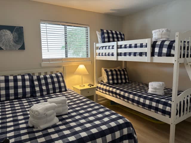 • Bedroom 2: Twin-over-twin bunk bed and standalone queen bed, smart TV
