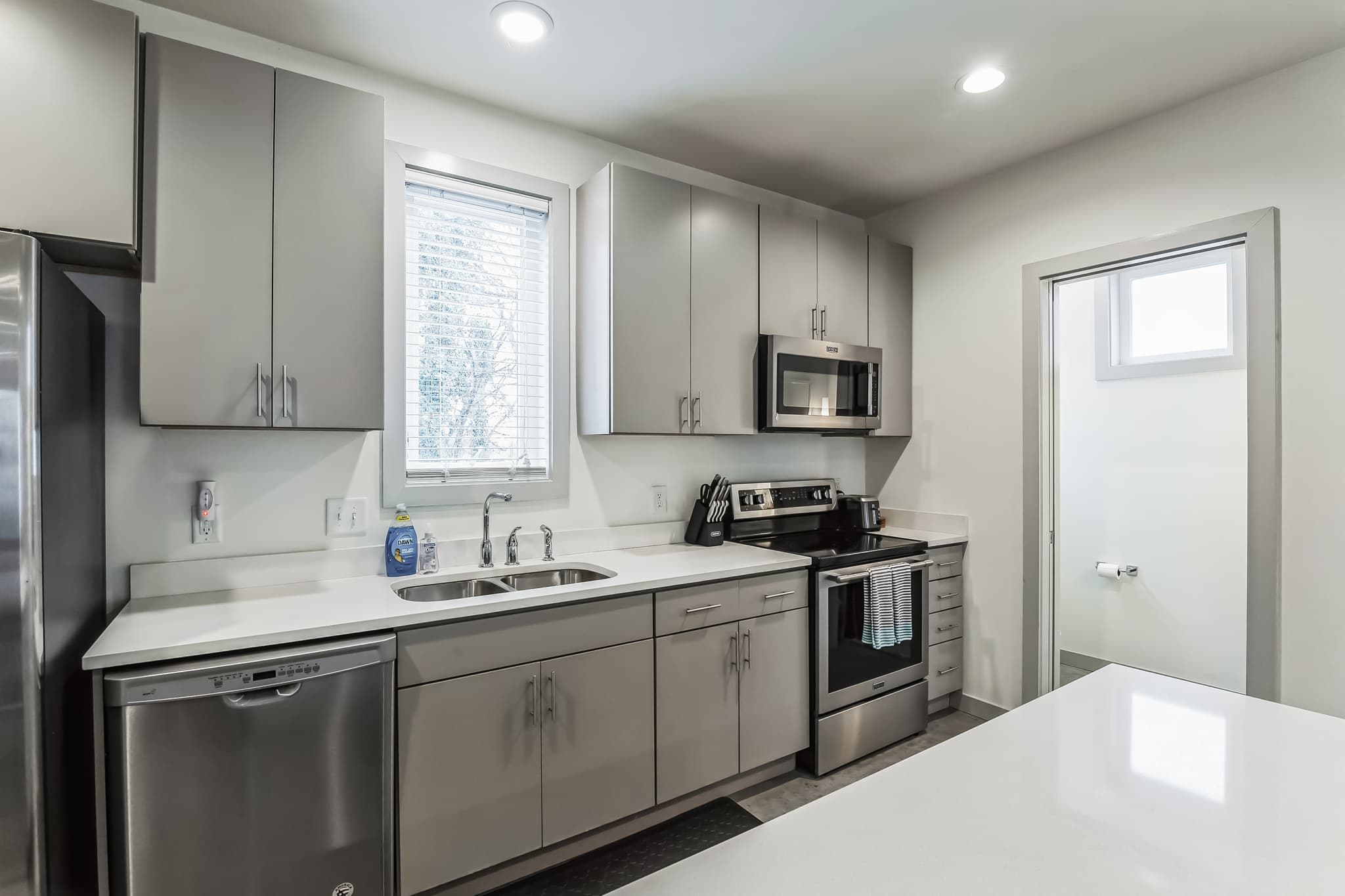 Back indoors, natural light illuminates a stylish kitchen showcasing stainless steel appliances, smooth stone counters, and sleek cabinetry stocked with all the cookware and dining ware you need to whip up family style meals in the comfort of home. Gather around the chic bench-style dining table for all your meals or head up to the 3rd floor balcony to dine al fresco while soaking in the fresh air and surrounding city vistas.