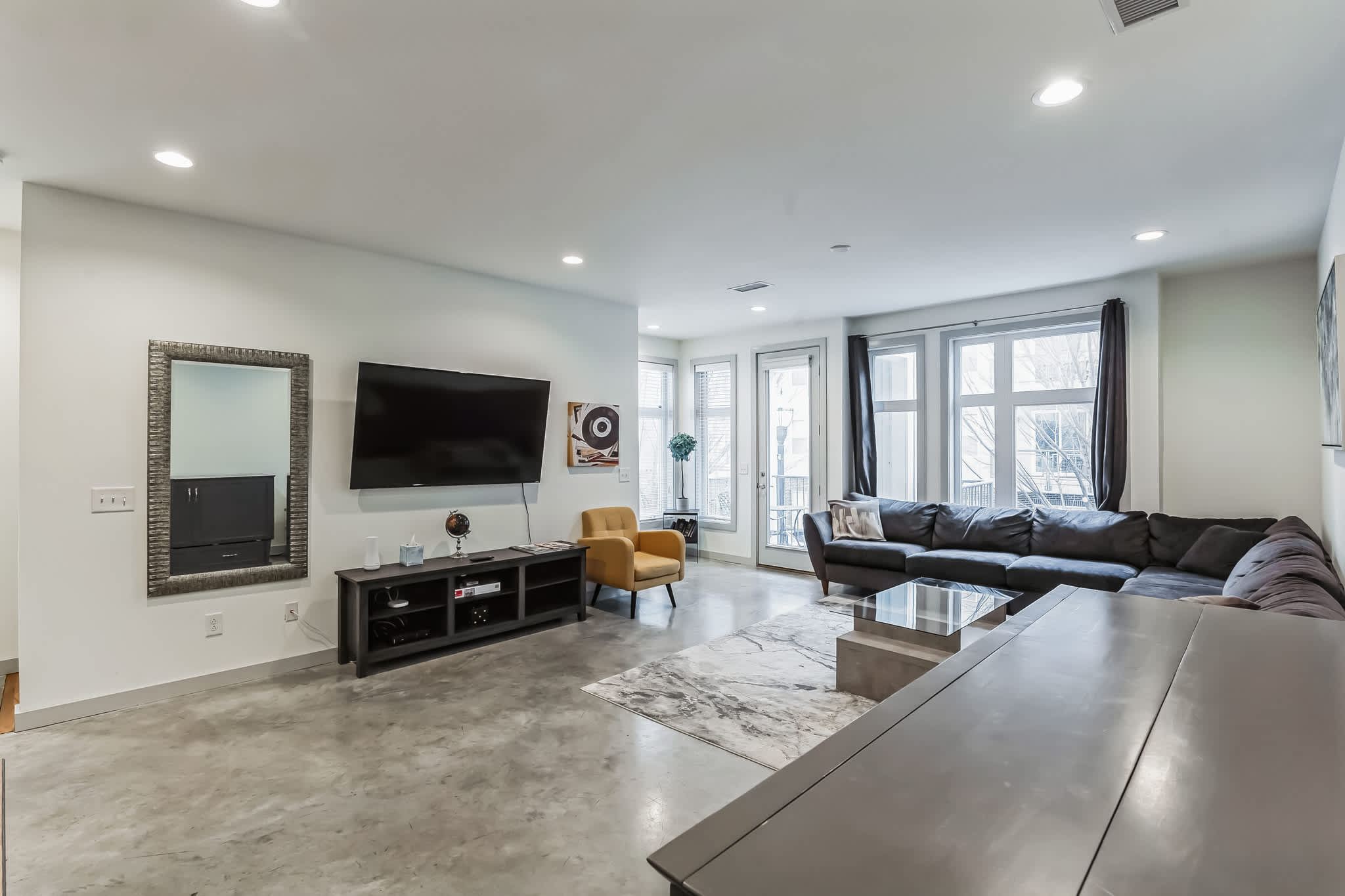 The home’s bright and breezy interior features tall ceilings and a desirable open floorplan conducive for gathering with friends and family as you unwind between adventures in the city. The living room offers plush sofa seating and a smart TV for keeping up with all your favorite shows and movies. Step out the door and onto the balcony, the perfect spot for diving into a new read or enjoying a happy hour cocktail.