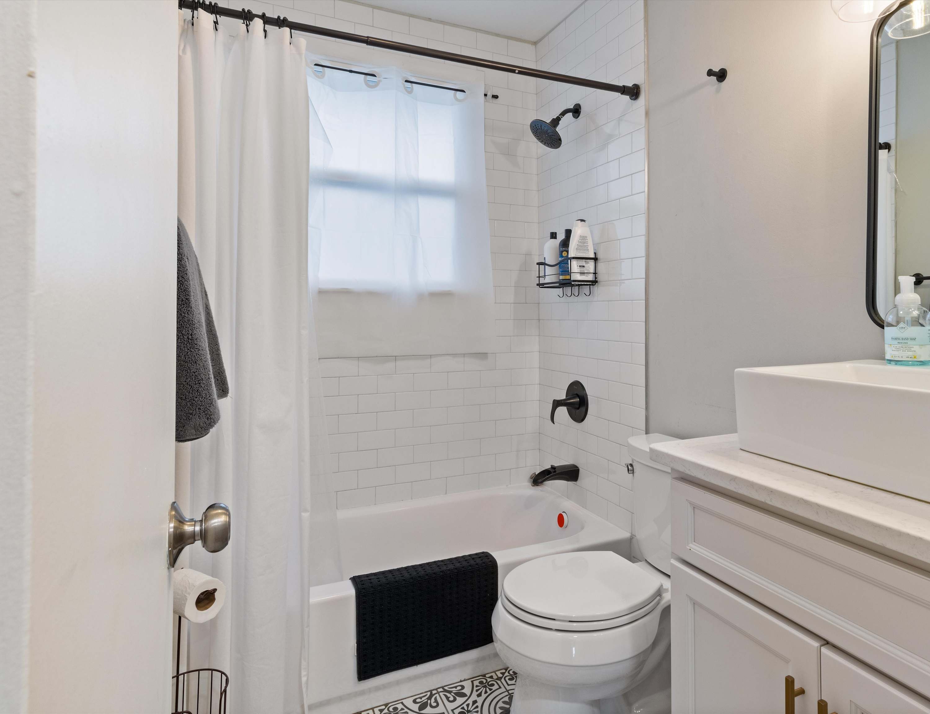 The home also includes a full guest bathroom with a single vanity and shower/tub combo.