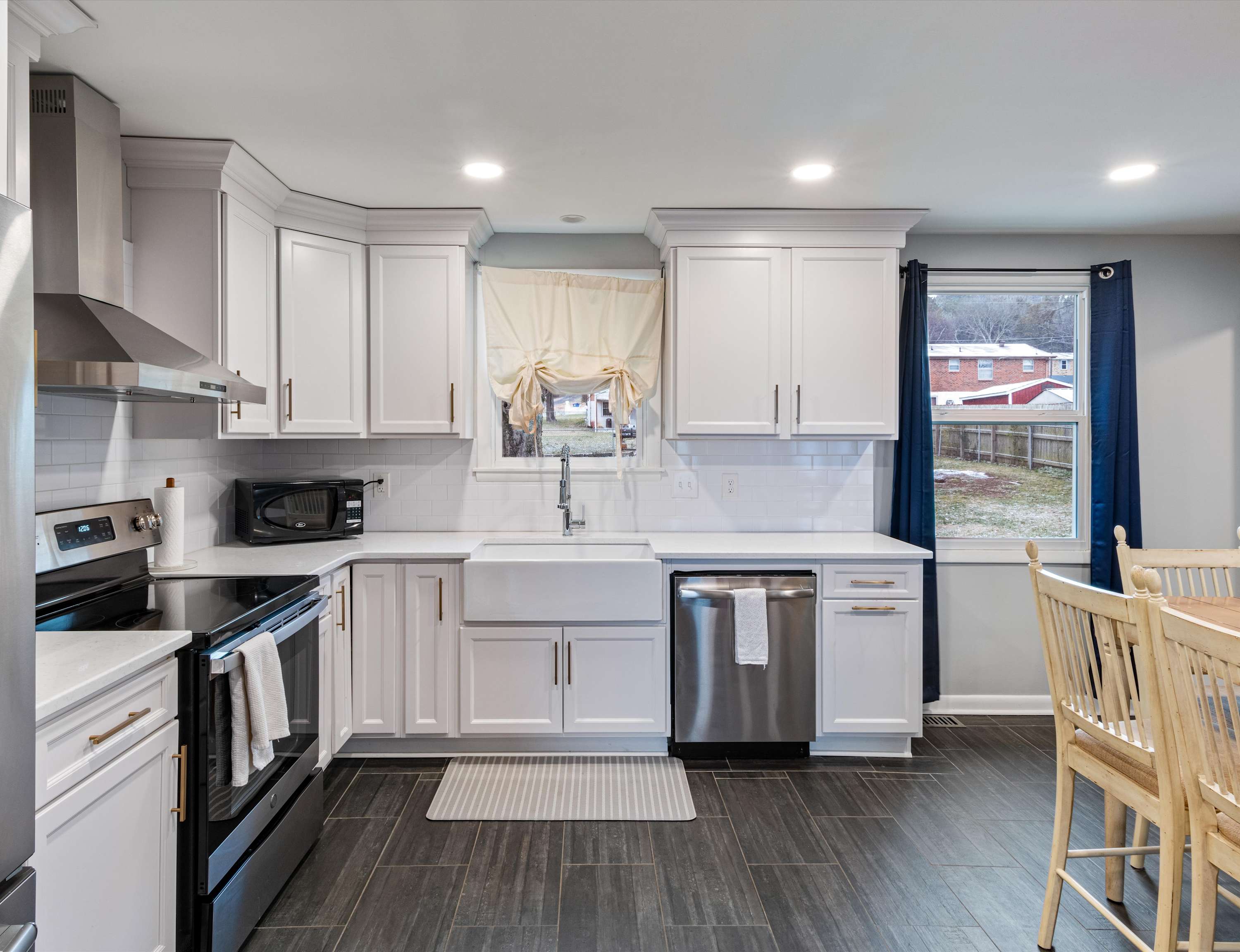The home’s open and modern interior offers plenty of space for you and your guests to spread out while communal areas join you back together for connection and entertainment. Curl up on cushy sofa seating in the living room while you stream all your favorite entertainment on the smart TV. The open floorplan flows you into the kitchen and dining areas, fully equipped for all your mealtime needs with stainless steel appliances, glossy stone counters, sleek white cabinetry, and seating for the whole crew for formal meals and family game nights alike at the trendy high-top dining table.