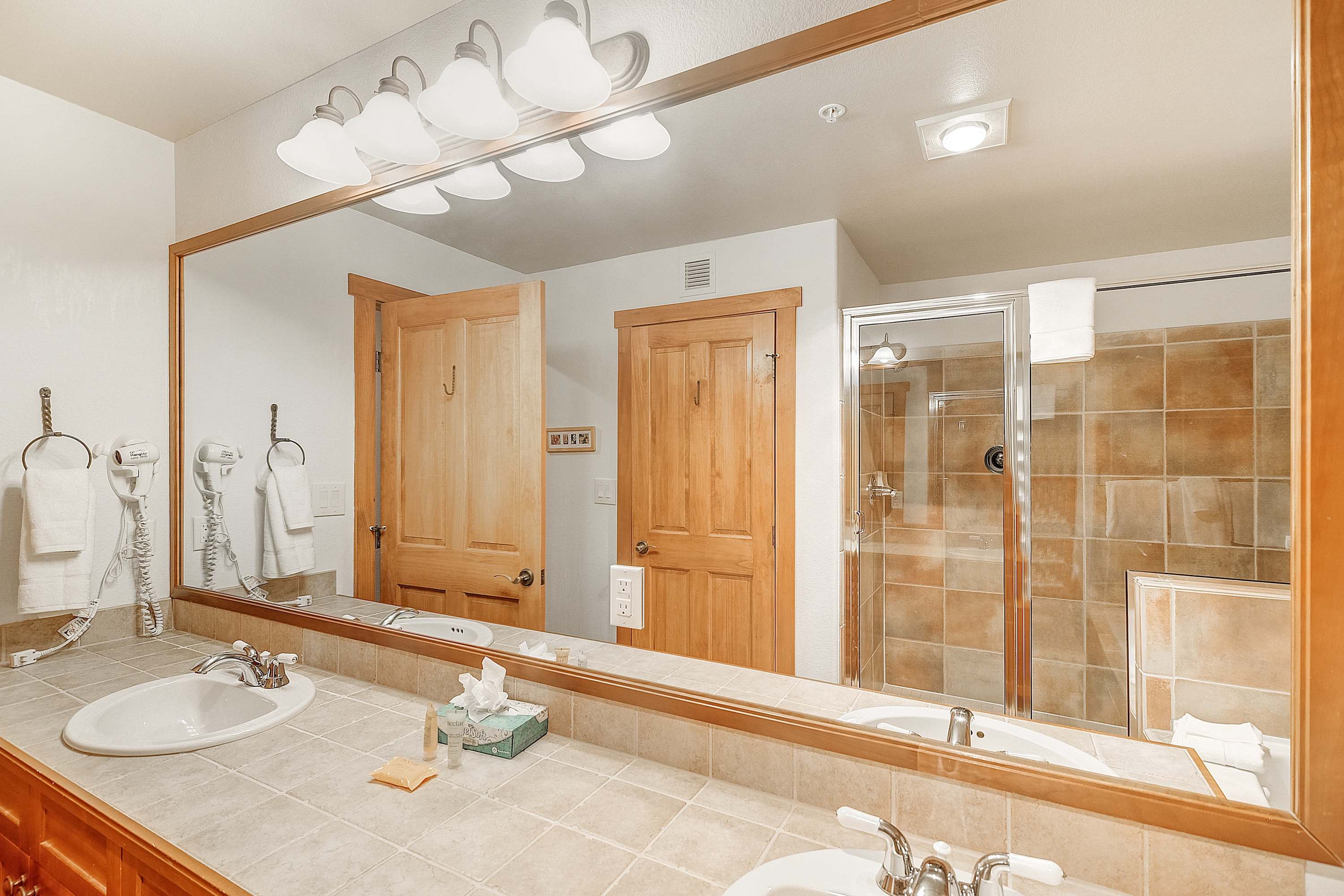 • Bedroom 3: King bed, TV, ceiling fan; ensuite bathroom with dual vanity, soaking tub, and glass walk-in shower