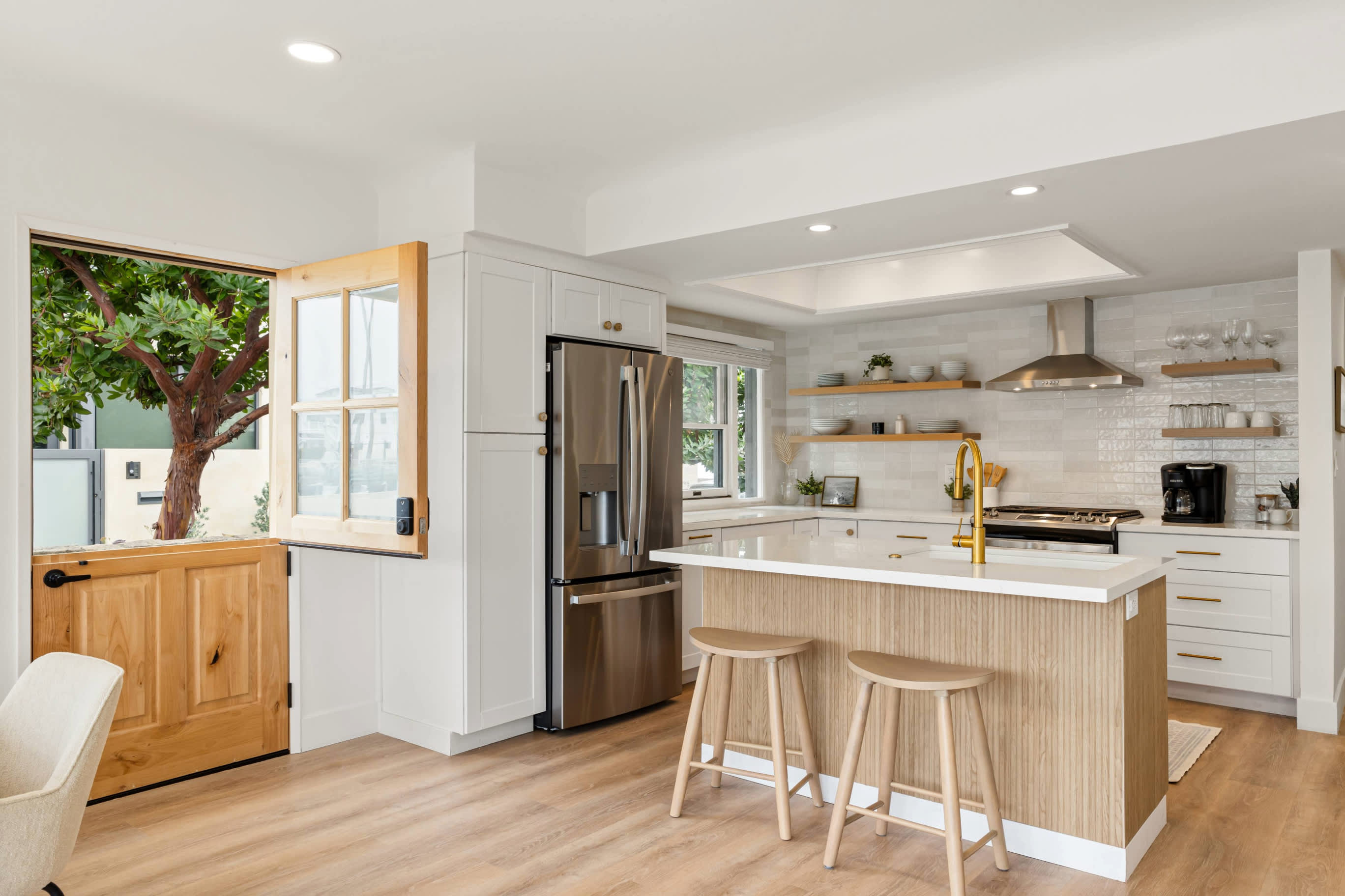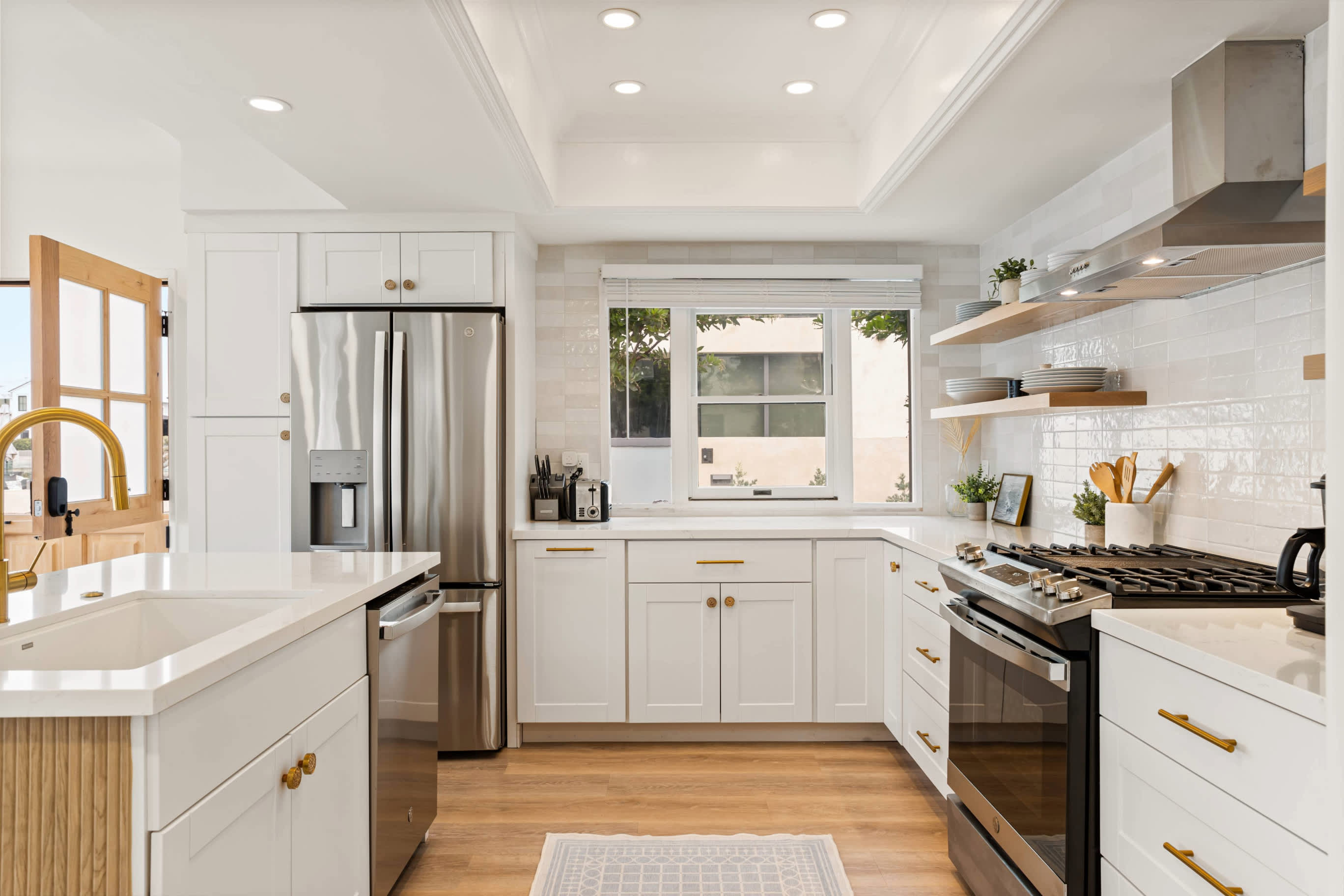 The home’s modern interior offers clean lines and soothing neutral tones ideal for relaxing between excursions on and around the water. Surf the channels or queue up a movie in the living room, inclusive of enough plush sofa and armchair seating for the whole crew. The open floorplan creates an organic connection between spaces, ensuring no one is every left out of the conversation. The stylish kitchen showcases stainless steel appliances, smooth stone countertops, and sleek white cabinetry with gold-accented hardware. Have a seat at the island to assist in meal prep or snack on appetizers or gather around the table for formal dining with a side of those exquisite water vistas.