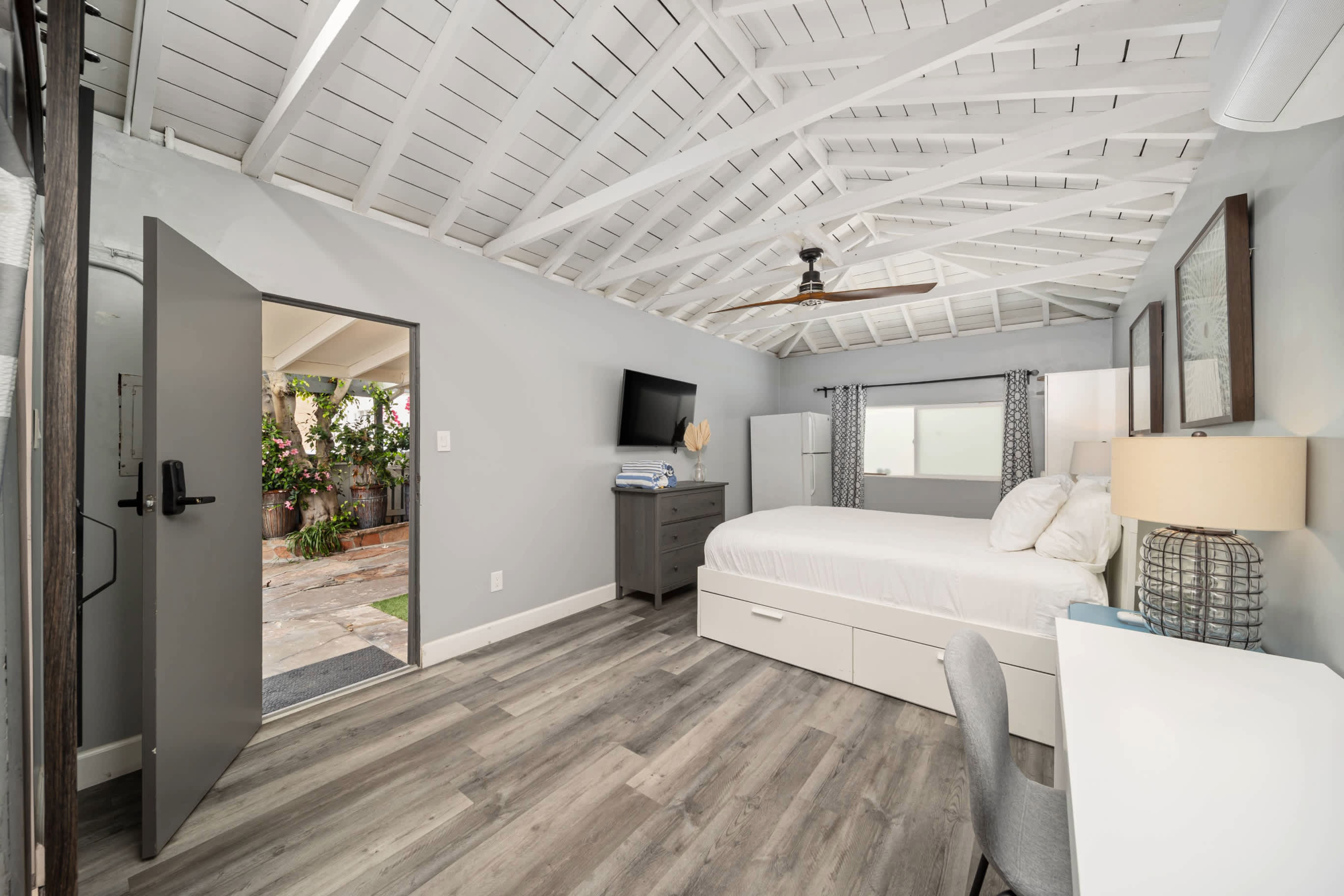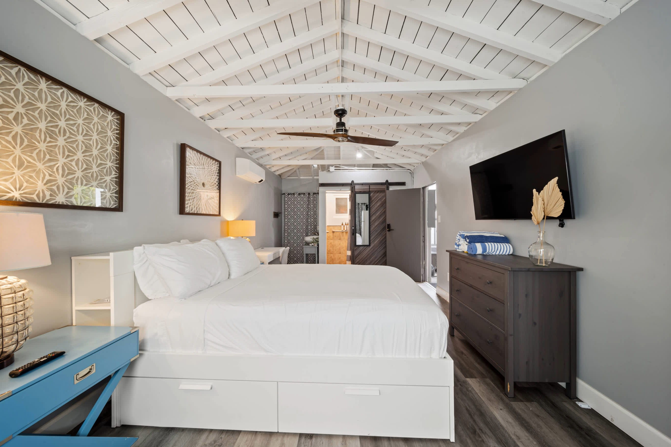 Bedroom #3 includes a queen size bed, TV, patio access, and ensuite bathroom with a single vanity and walk-in shower.
