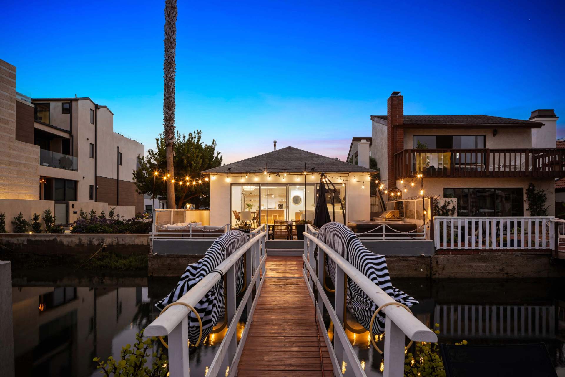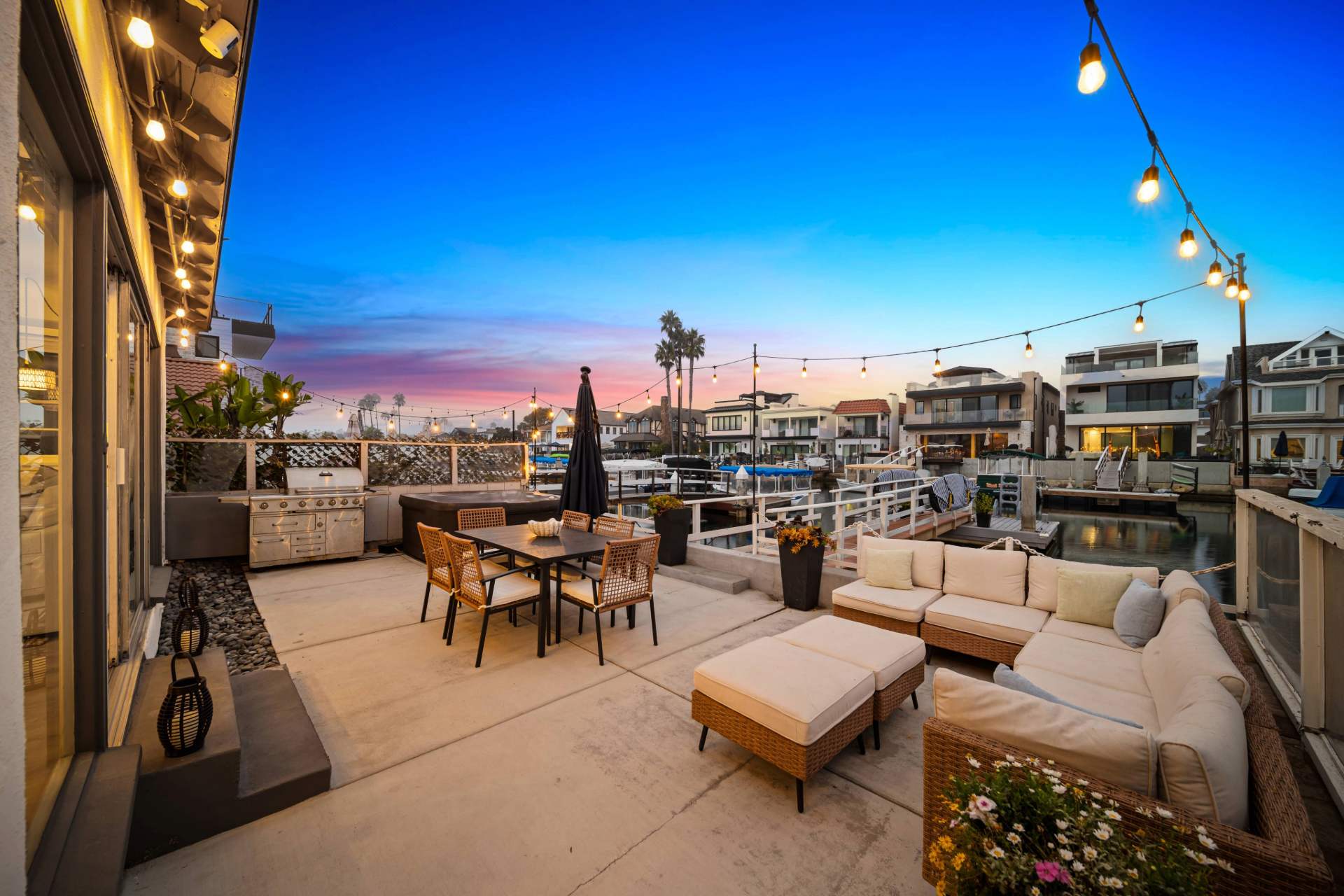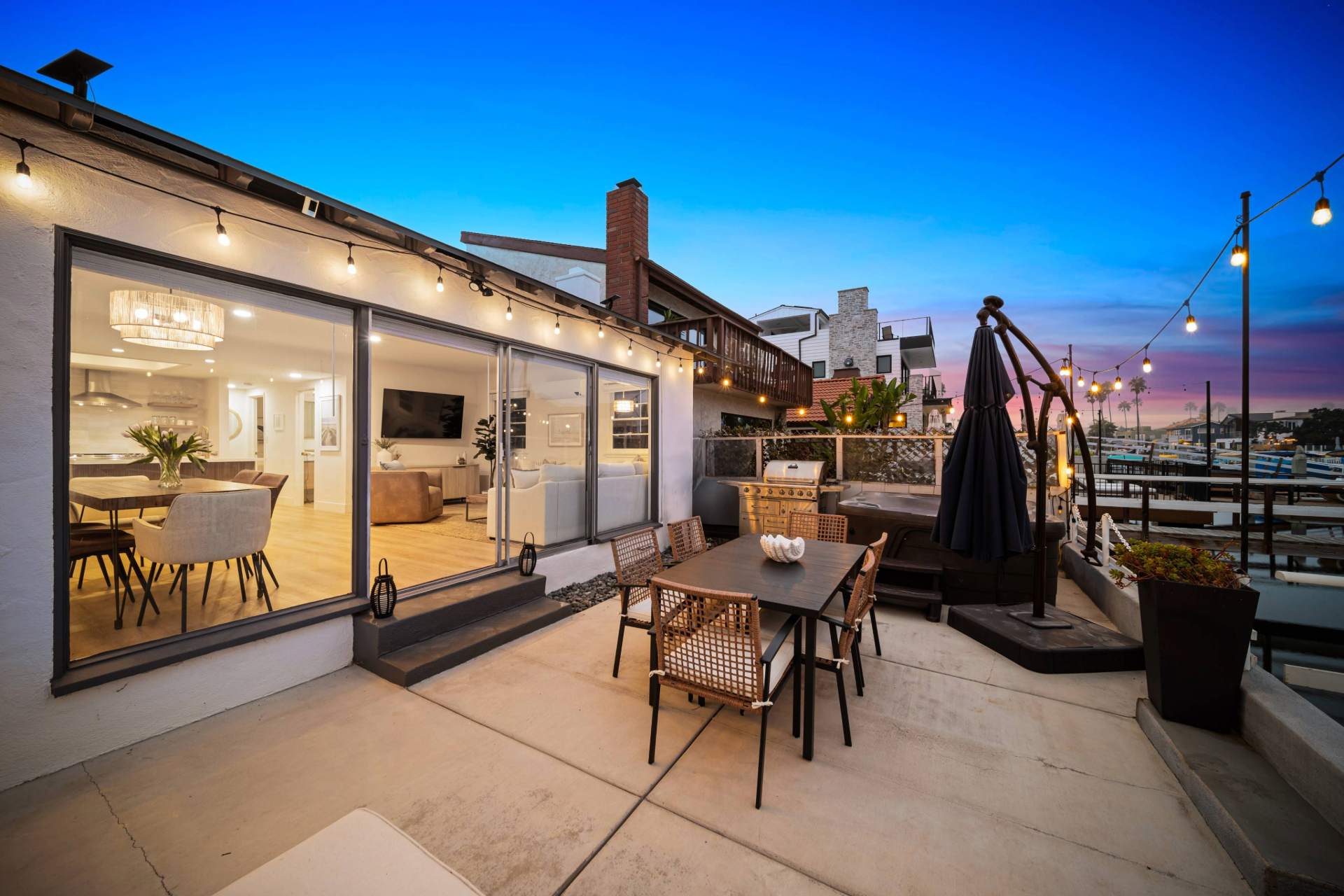 Enjoy sunset after striking sunset from the home’s back patio, set alongside the banks of the cove and offering an unmatched sense of serenity as you watch the boats drift lazily by. Sink into comfortable outdoor sofa seating with a good book in one hand and a cocktail in the other, the string lights softly glowing overhead. The grill master among you will enjoy whipping up an authentic barbeque feast, served tableside at the dining set for 6. To cap off the night, enjoy a soak in the bubbling hot tub before heading inside for a peaceful night’s sleep.