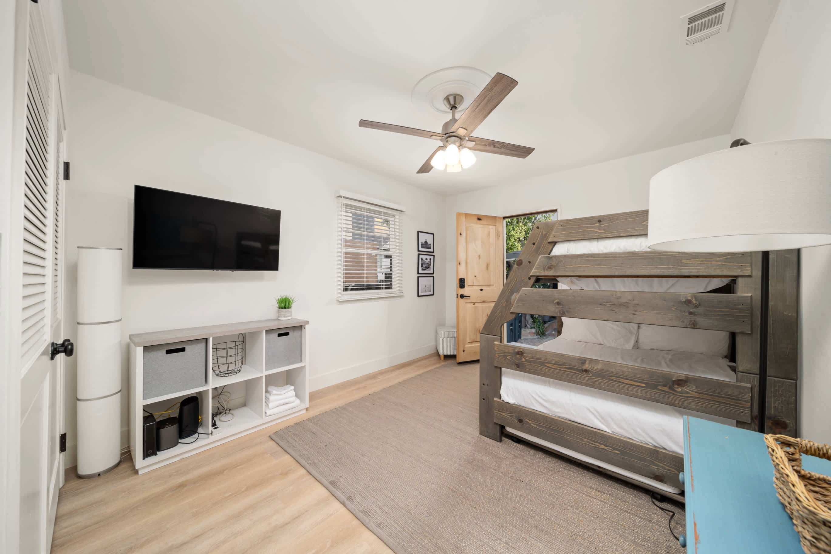 Bedroom #2 includes a twin-over-full bunk bed, TV, and deck access.