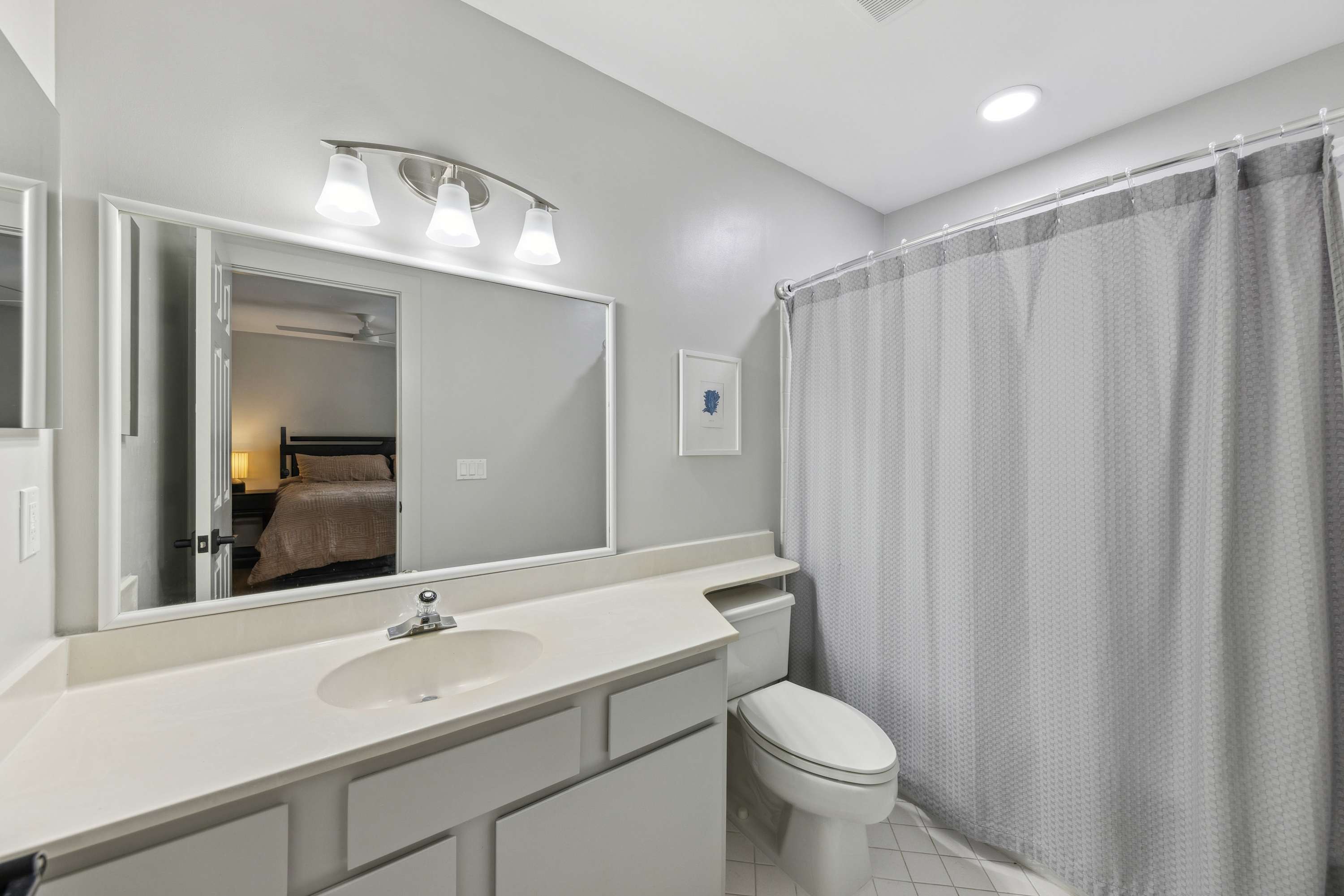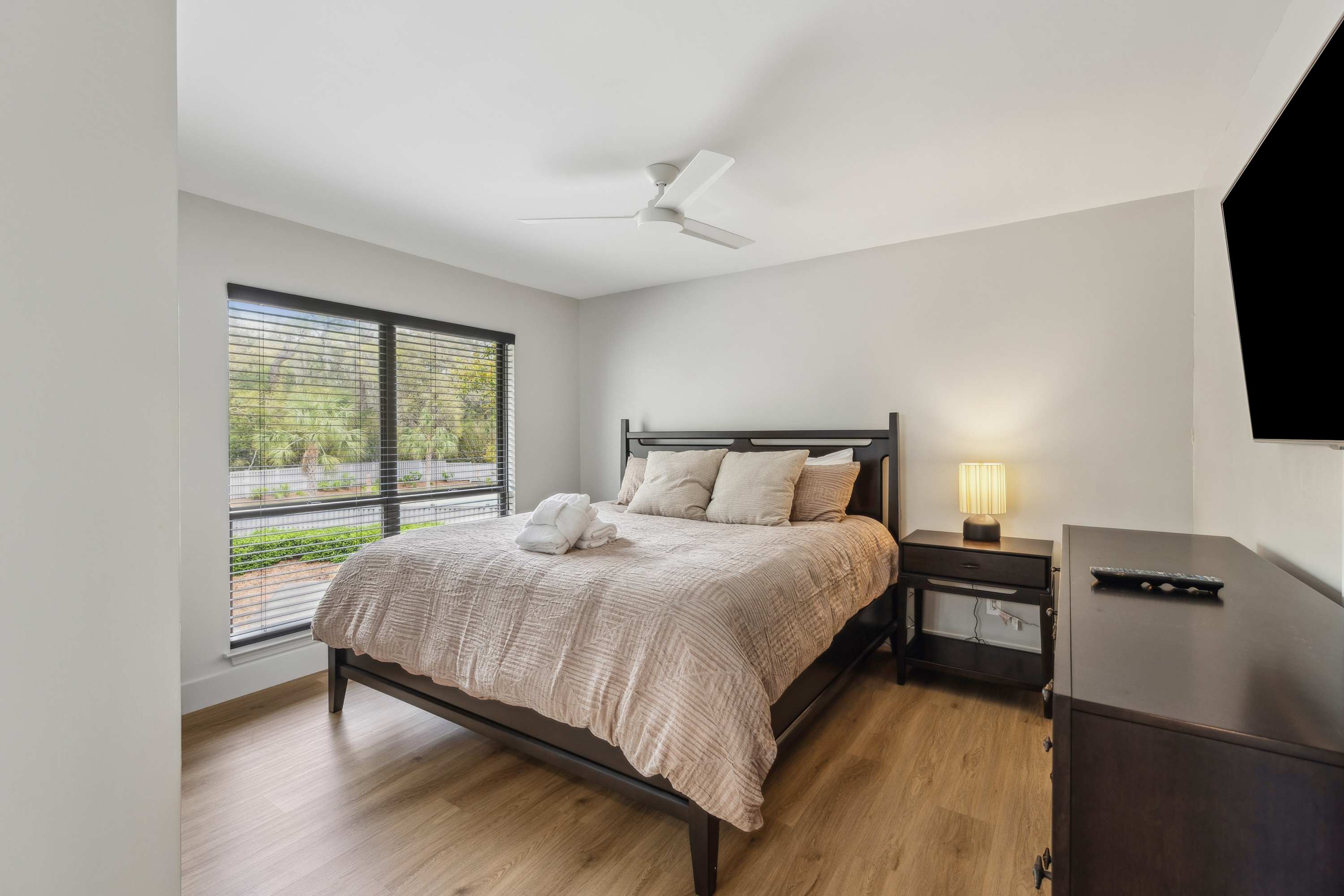 • Bedroom 2: King bed, smart TV, ensuite bathroom with single vanity and shower/tub combo