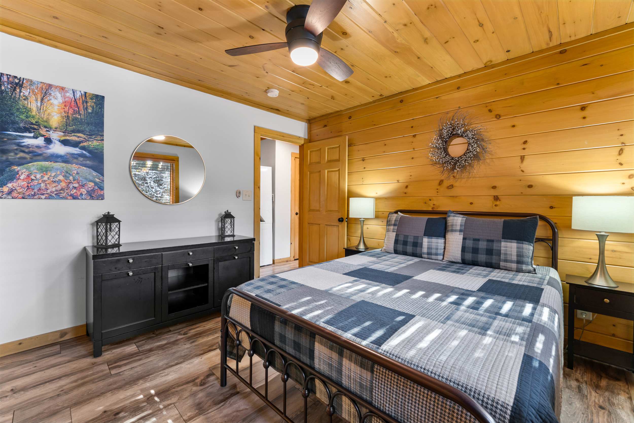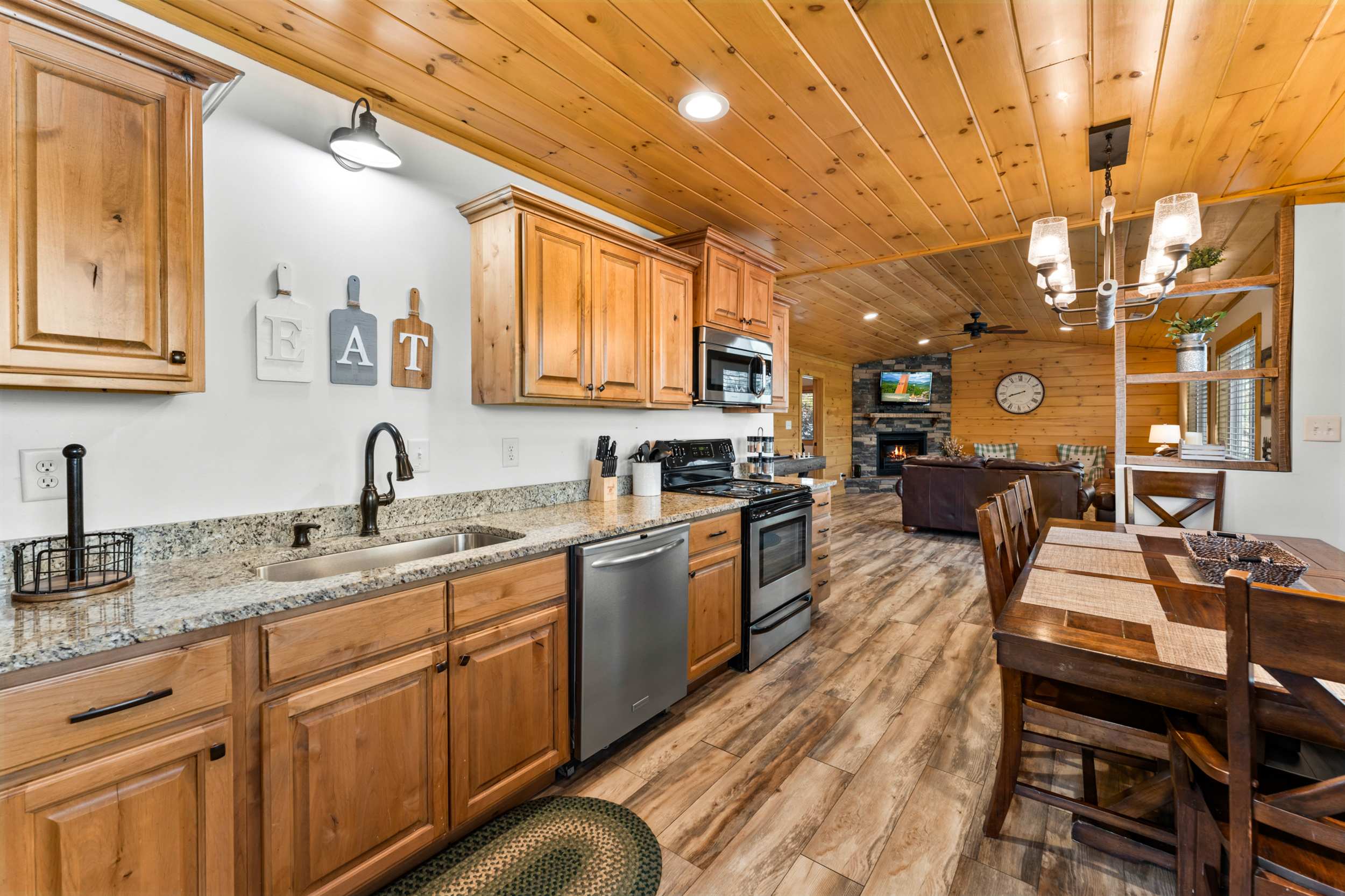 Drop your things in one of the bedrooms so you know where you’ll be resting your head after a day of outdoor adventure or fireside relaxation. Sneak a peek at the kitchen where you’ll prepare a hearty breakfast or dinner for the crew. Equipped with stainless steel appliances, ample stone countertops, and stunning wood cabinetry, you’ll find this kitchen stocked with all the essentials. Enjoy your meals al fresco at the tables on the deck or stay warm indoors at the dining table for eight. Then get the fireplace going, claim your spot on the roomy couches or one of the comfortable armchairs, and stream a movie everyone can enjoy.