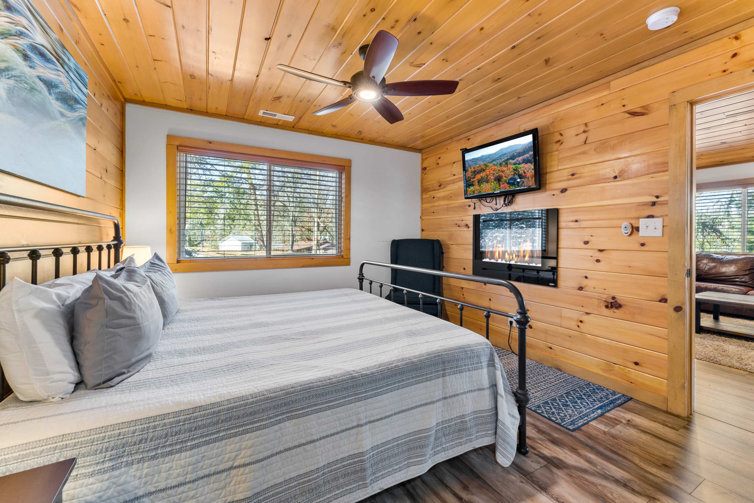 Bedroom #1 includes a king size bed, a smart TV, an electric fireplace, and an ensuite bathroom with a single vanity and a shower/tub combo.