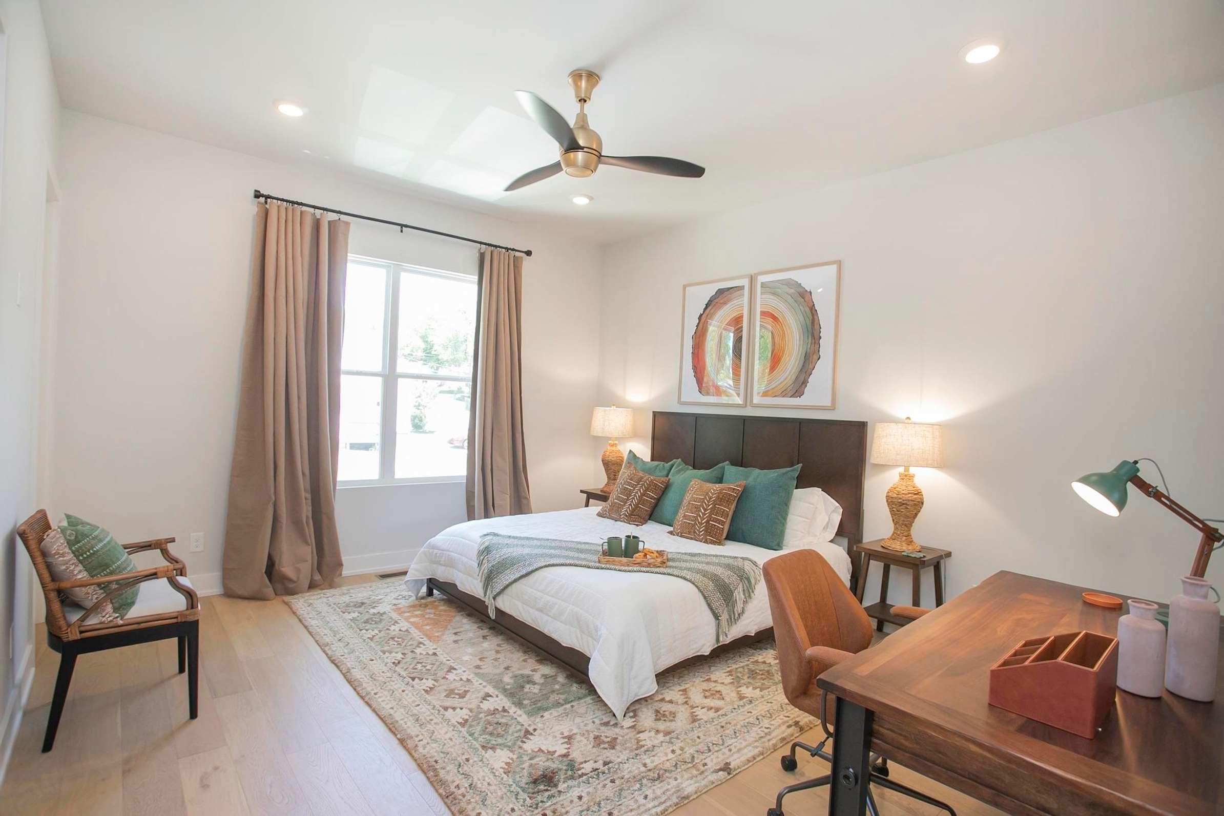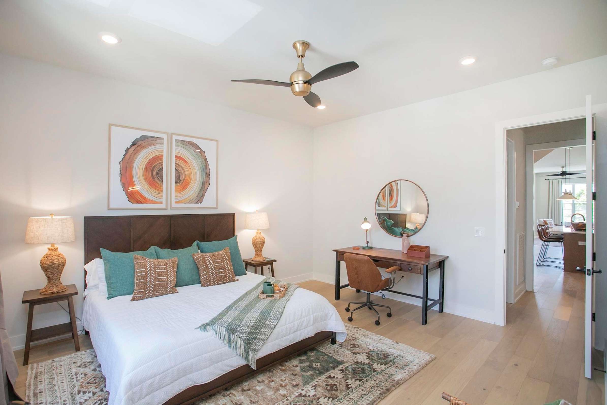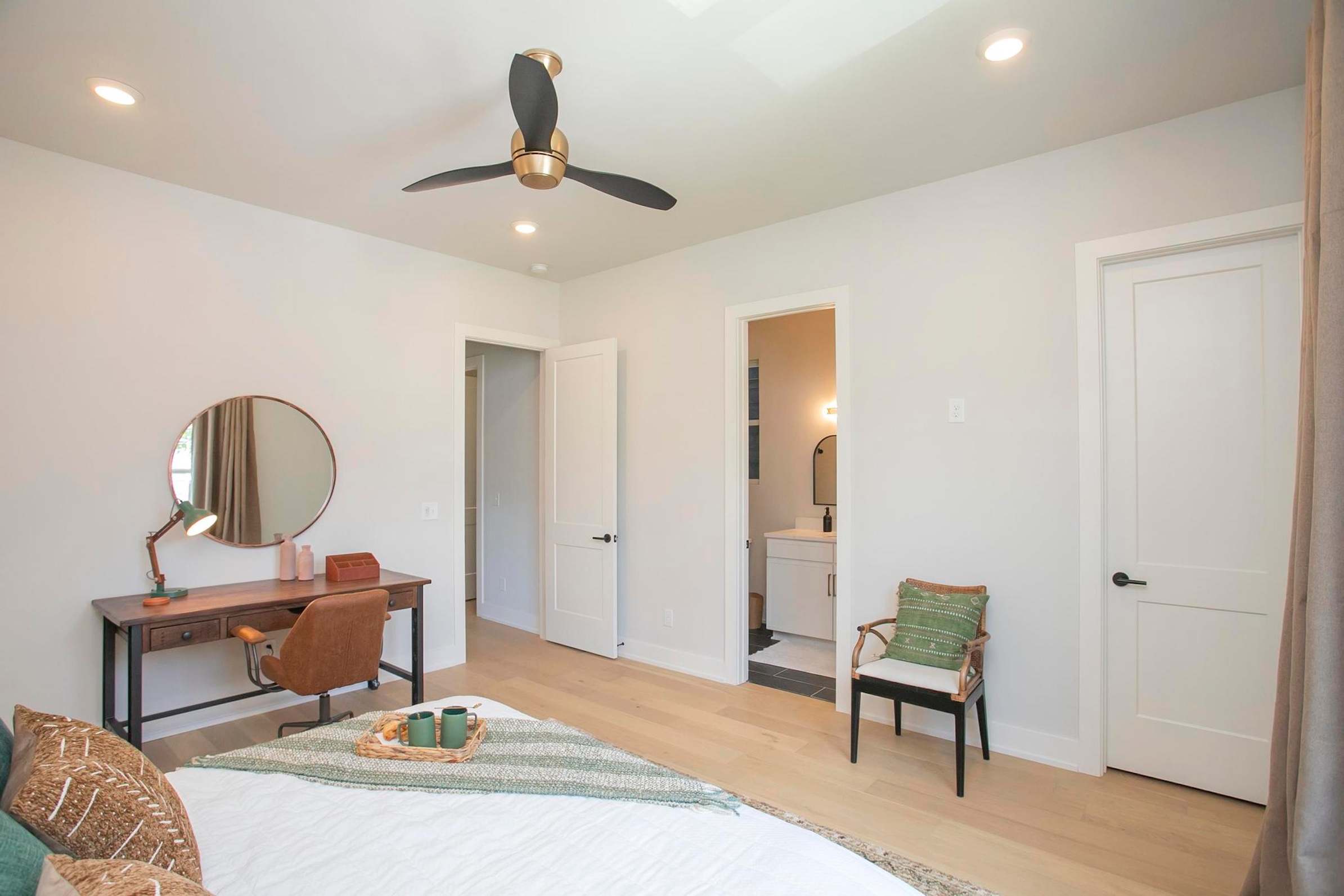 Bedroom #2 includes a king size bed, a desk, and an ensuite bathroom with a single vanity and a shower/tub combo.