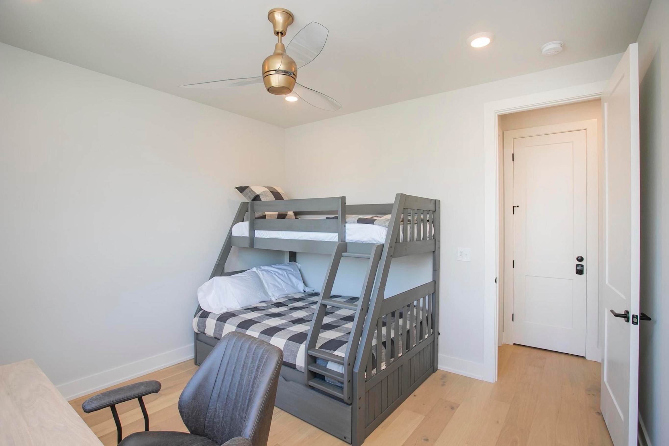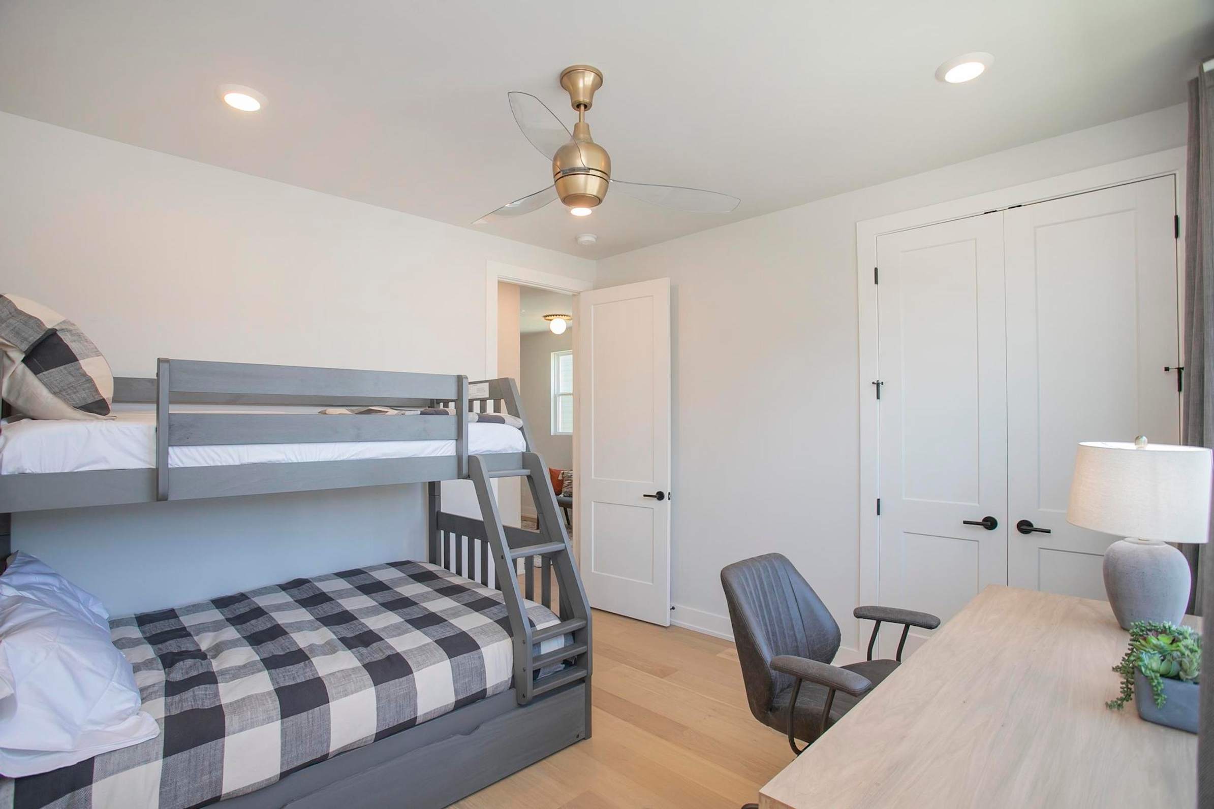 Bedroom #1 includes twin-over-queen bunk beds, a twin size trundle, and a desk.
