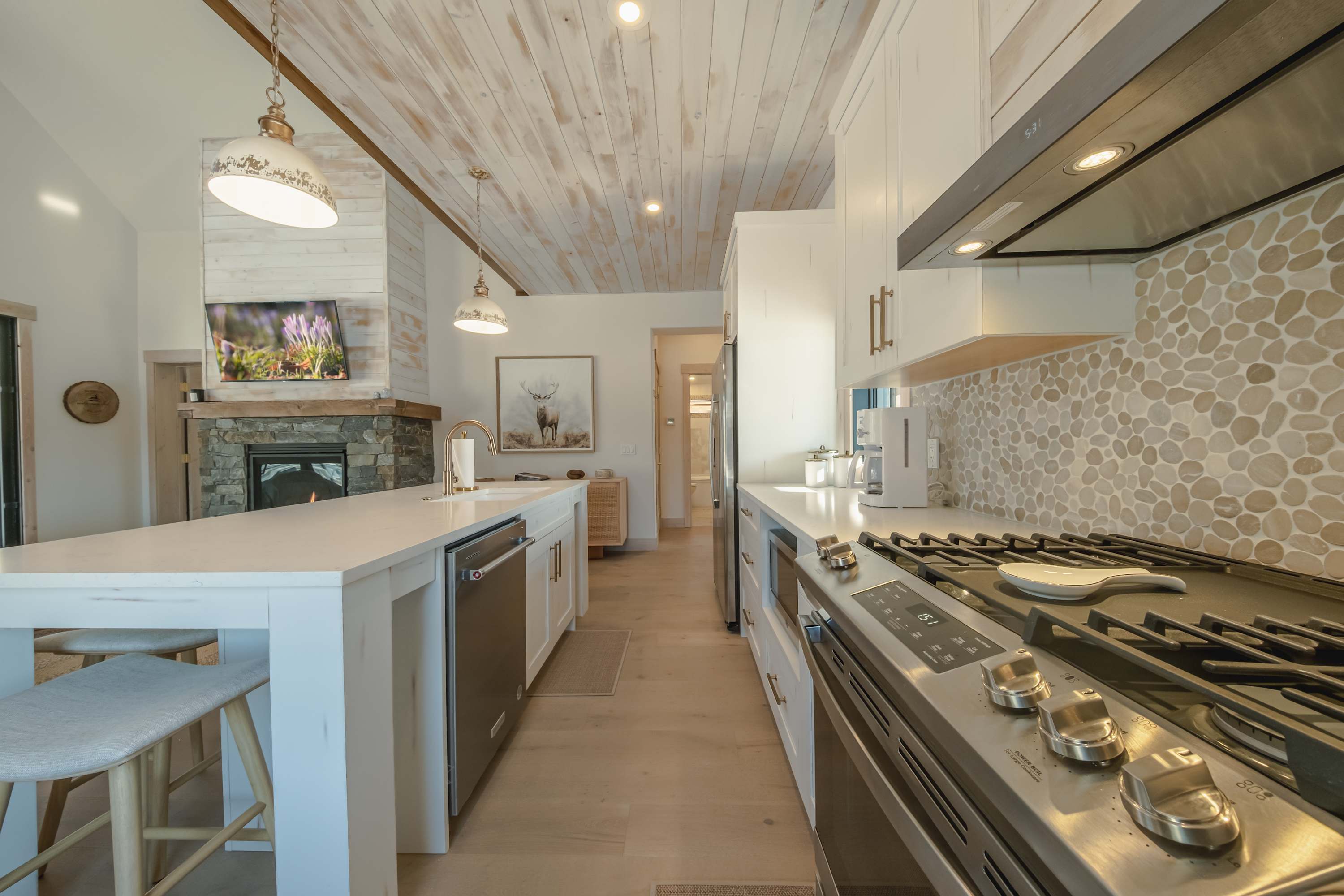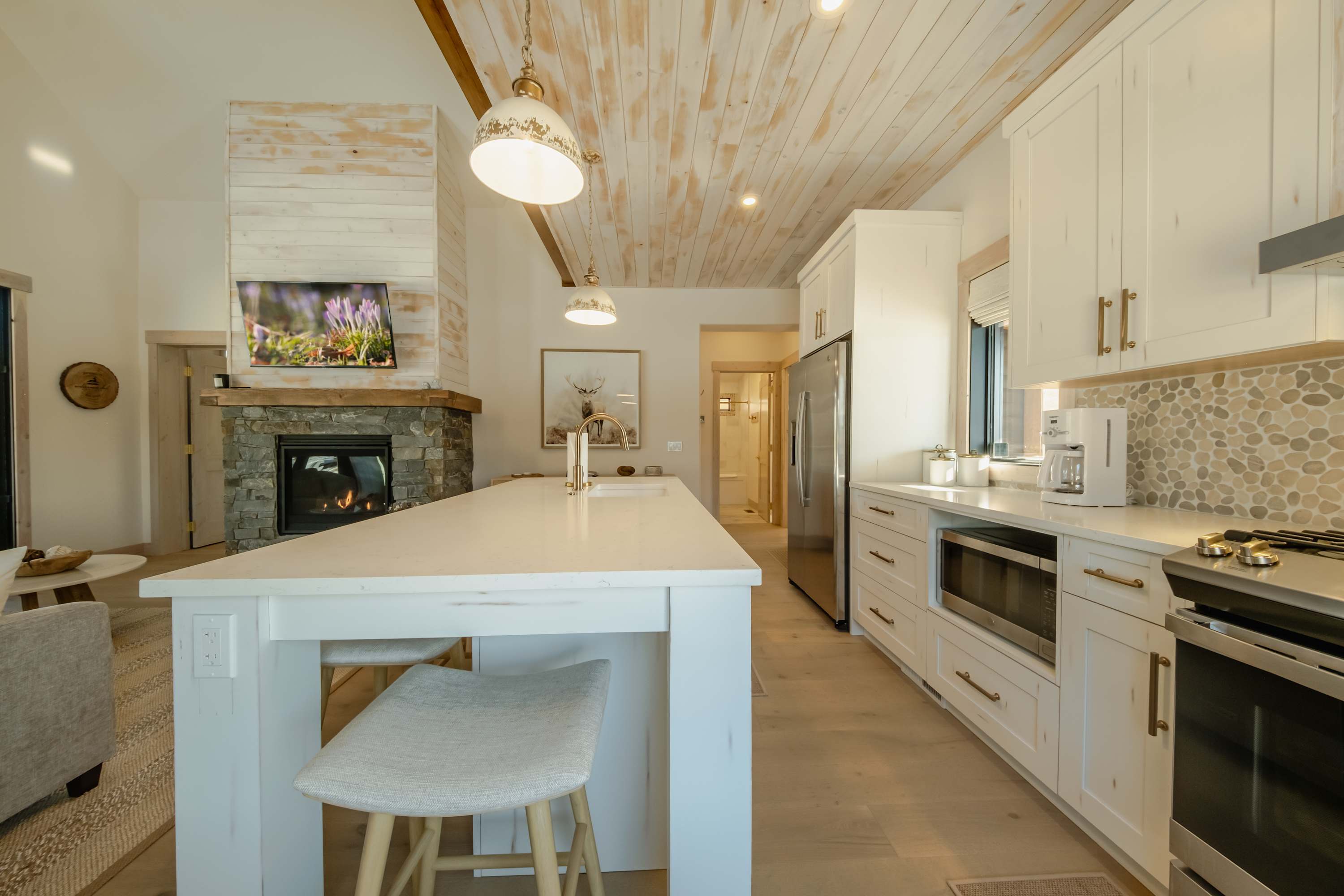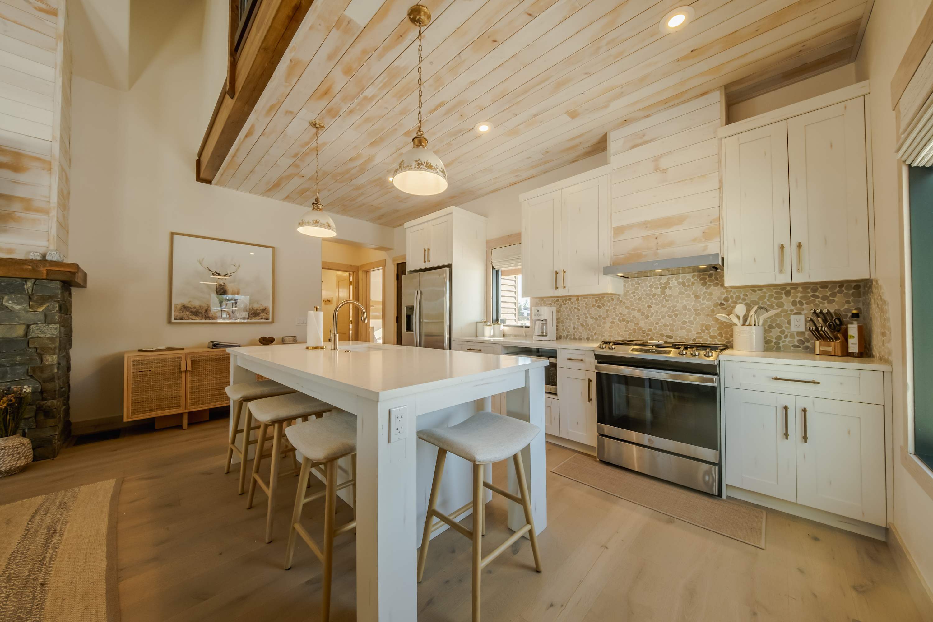 This stunning residence is thoughtfully designed for entertaining, providing the perfect blend of indoor comfort and outdoor relaxation. Start your mornings with a fresh cup of coffee on the second-story loft balcony, where you can soak in breathtaking views of Montana’s rugged landscape and serene wilderness. Make your way downstairs to prepare breakfast for the whole family in the well-equipped kitchen boasting sleek stainless steel appliances and white stone countertops and cabinetry stocked with all the essentials. Gather around the island with seating for five to share your home-cooked meal while planning the day’s activities.