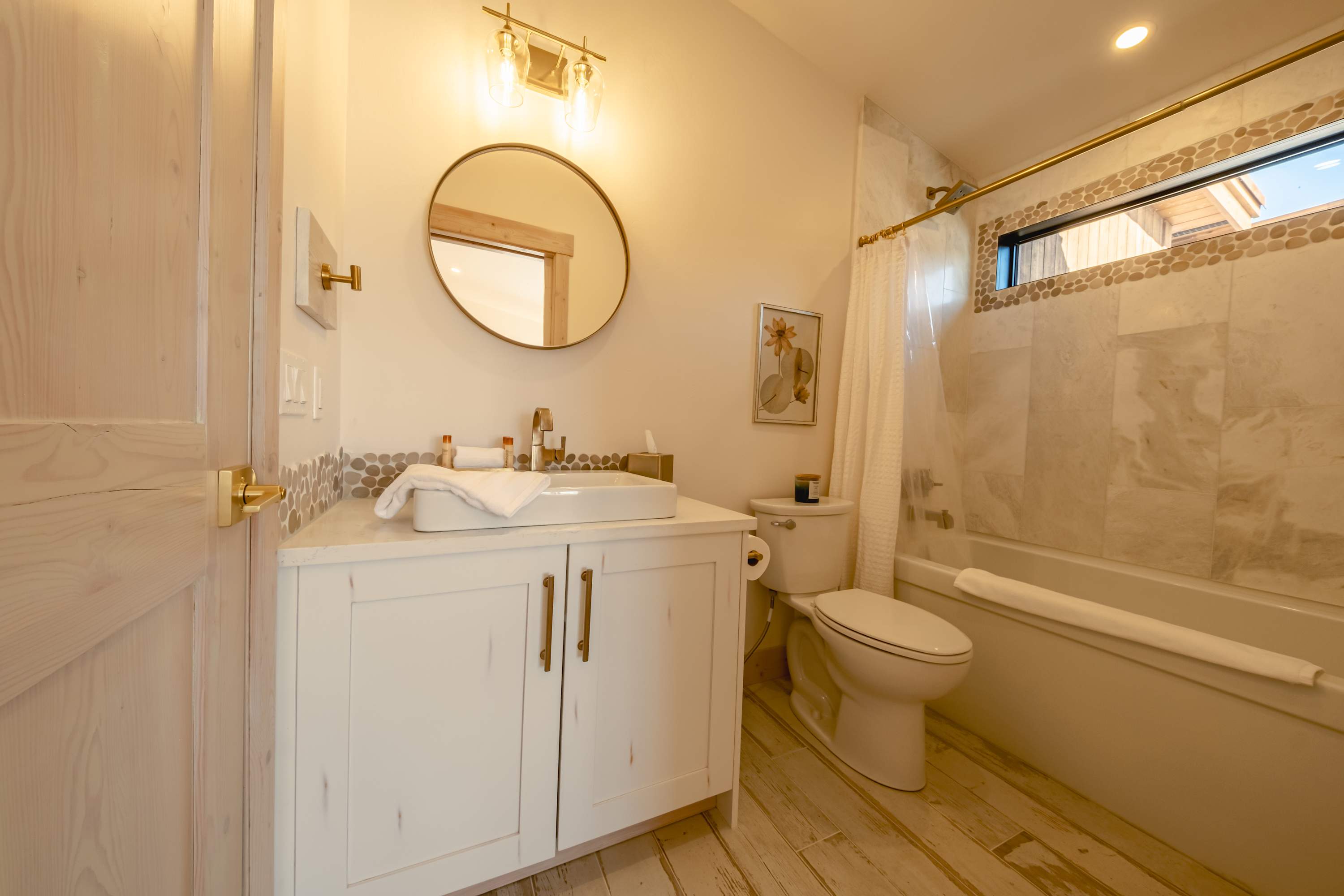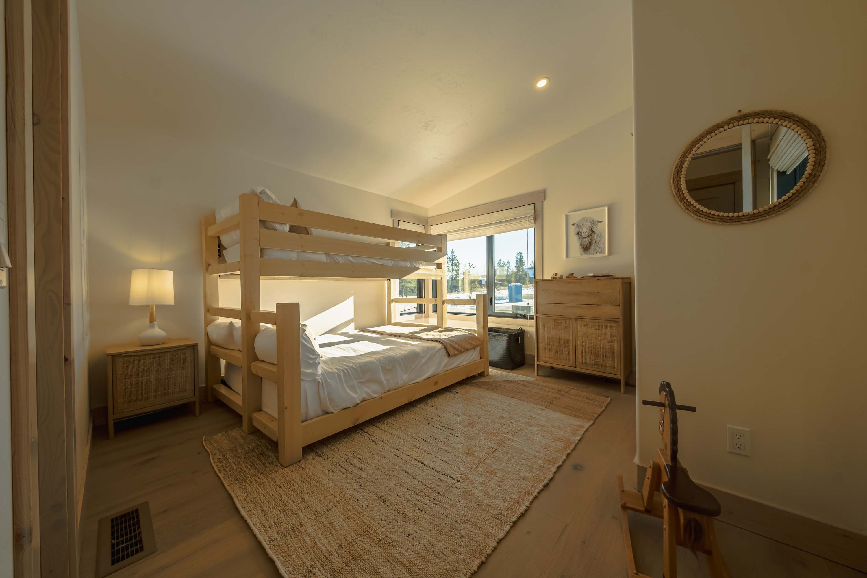 Bedroom #2 includes a twin-over-queen bunk beds and an ensuite bathroom with single vanity and a shower/tub combo.