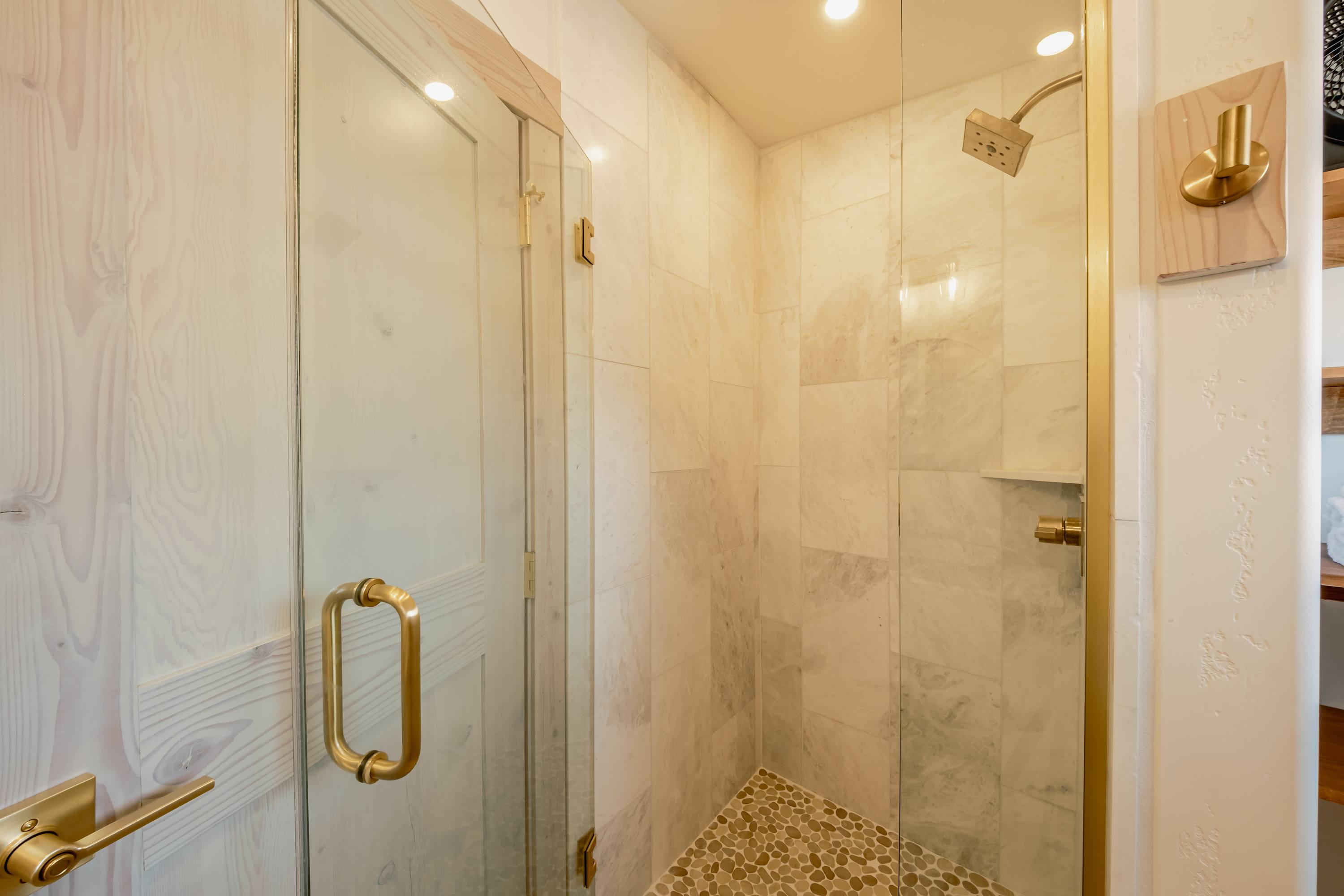 The Loft includes a king-size bed with a private balcony, and a full bathroom with a single vanity and a walk-in glass shower.