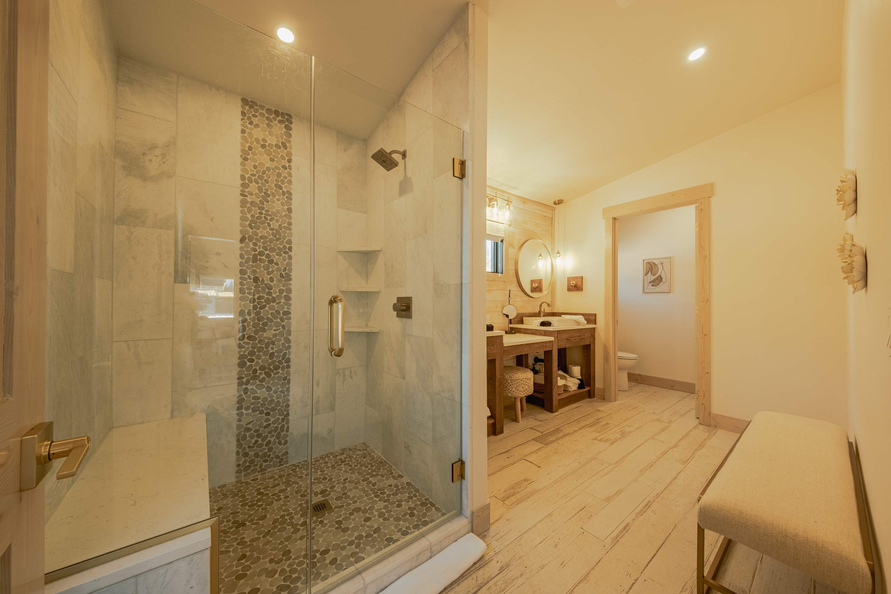 Bedroom #1 includes a king size bed, a smart TV, patio access, and an ensuite bathroom with a dual vanity and a walk-in glass shower.