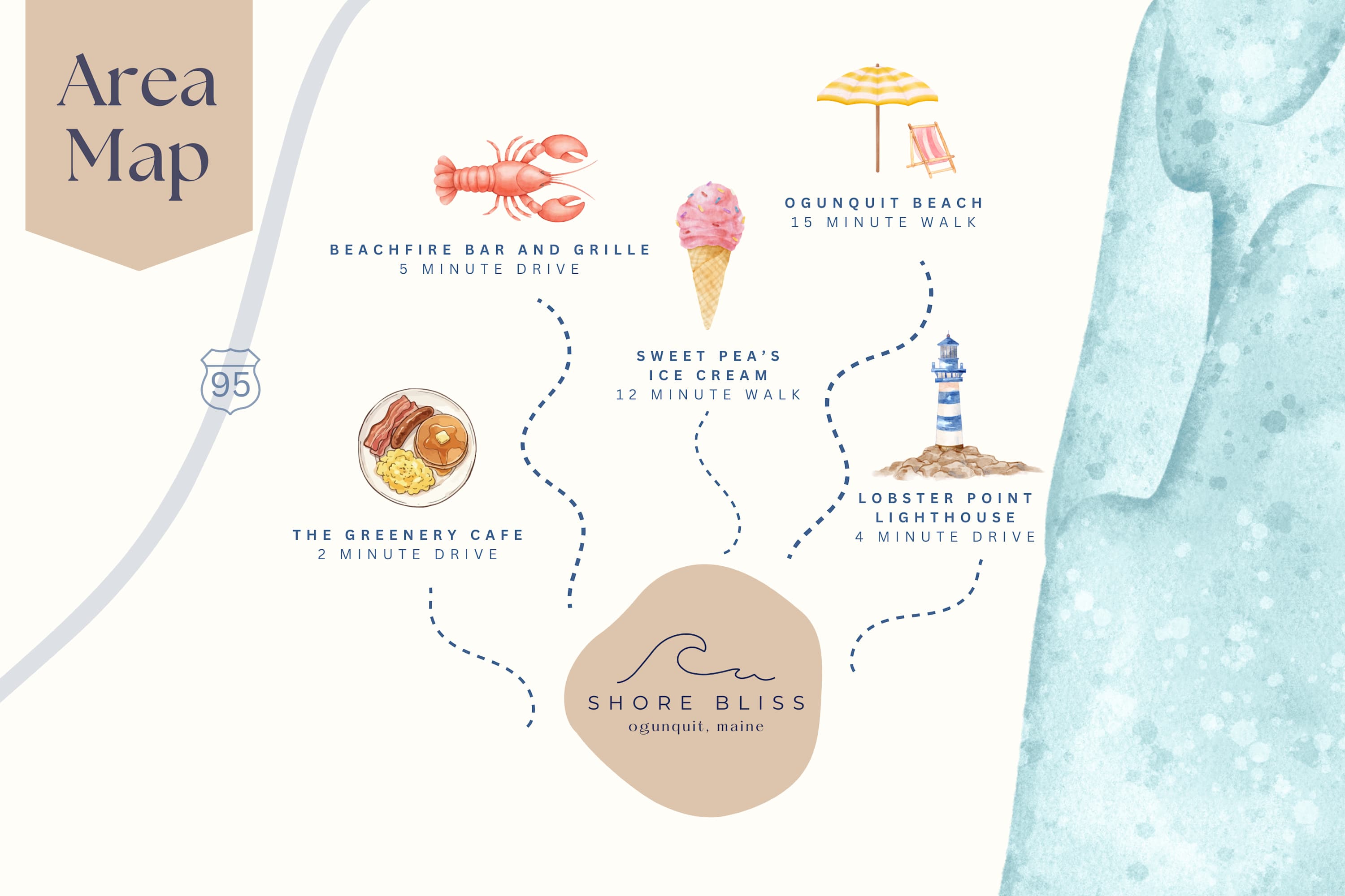 Tucked in a quiet corner of Ogunquit, Shore Bliss is conveniently located near two beautiful beaches. Little Beach is 0.9 miles away, a 19-minute walk or 3-minute drive. Offering a peaceful, lesser-known spot to enjoy the coast. Ogunquit Beach is just 1.6 miles away, an 18-minute walk or also a 3-minute drive featuring soft sand, scenic dunes, and gentle surf along a wide stretch of shoreline. Whether you're in the mood for serenity or a classic beach day, both options are within easy reach.