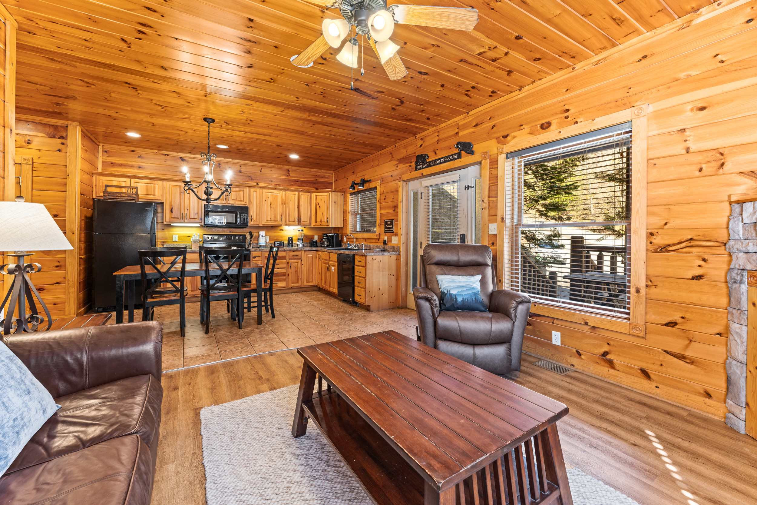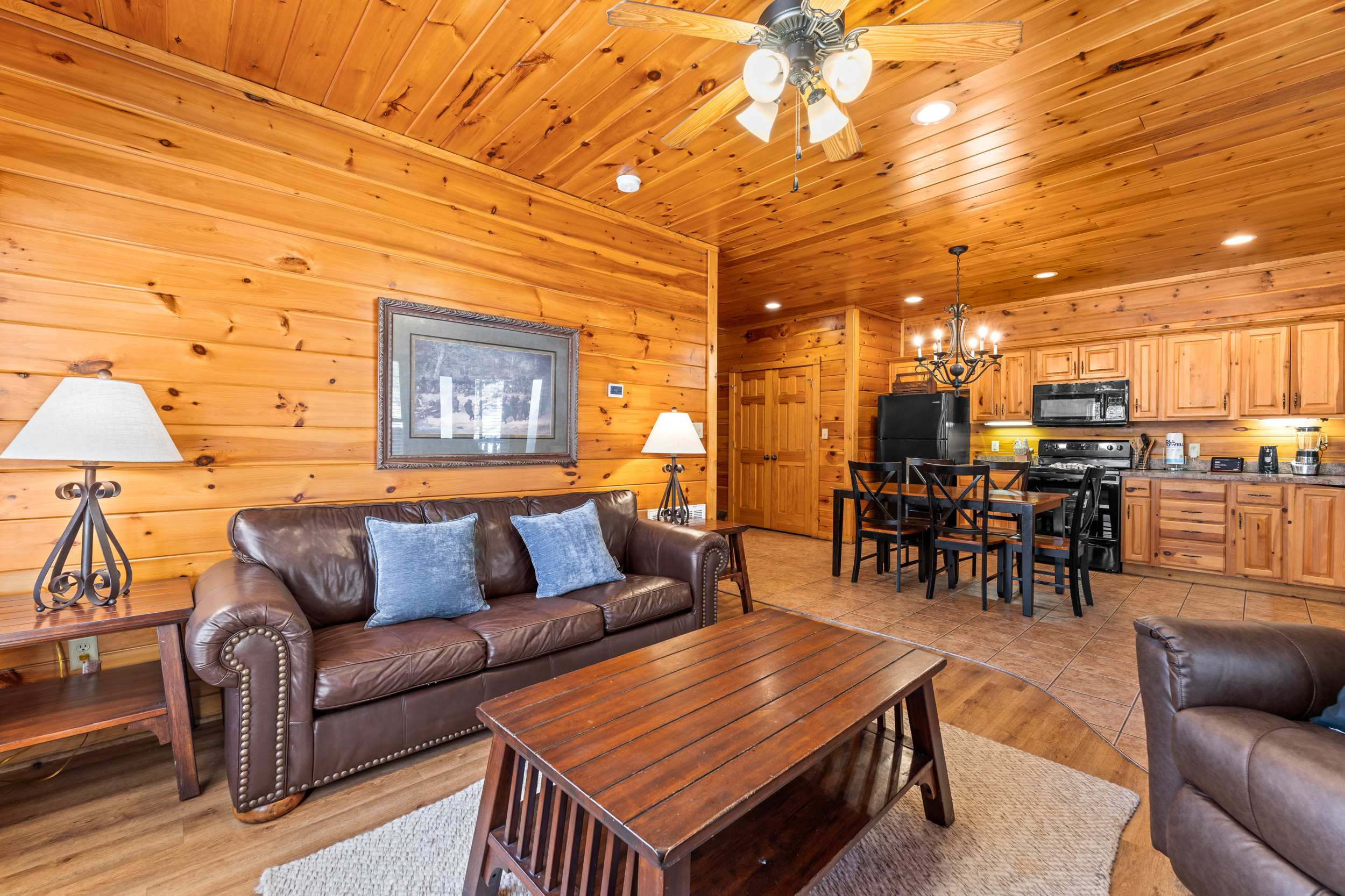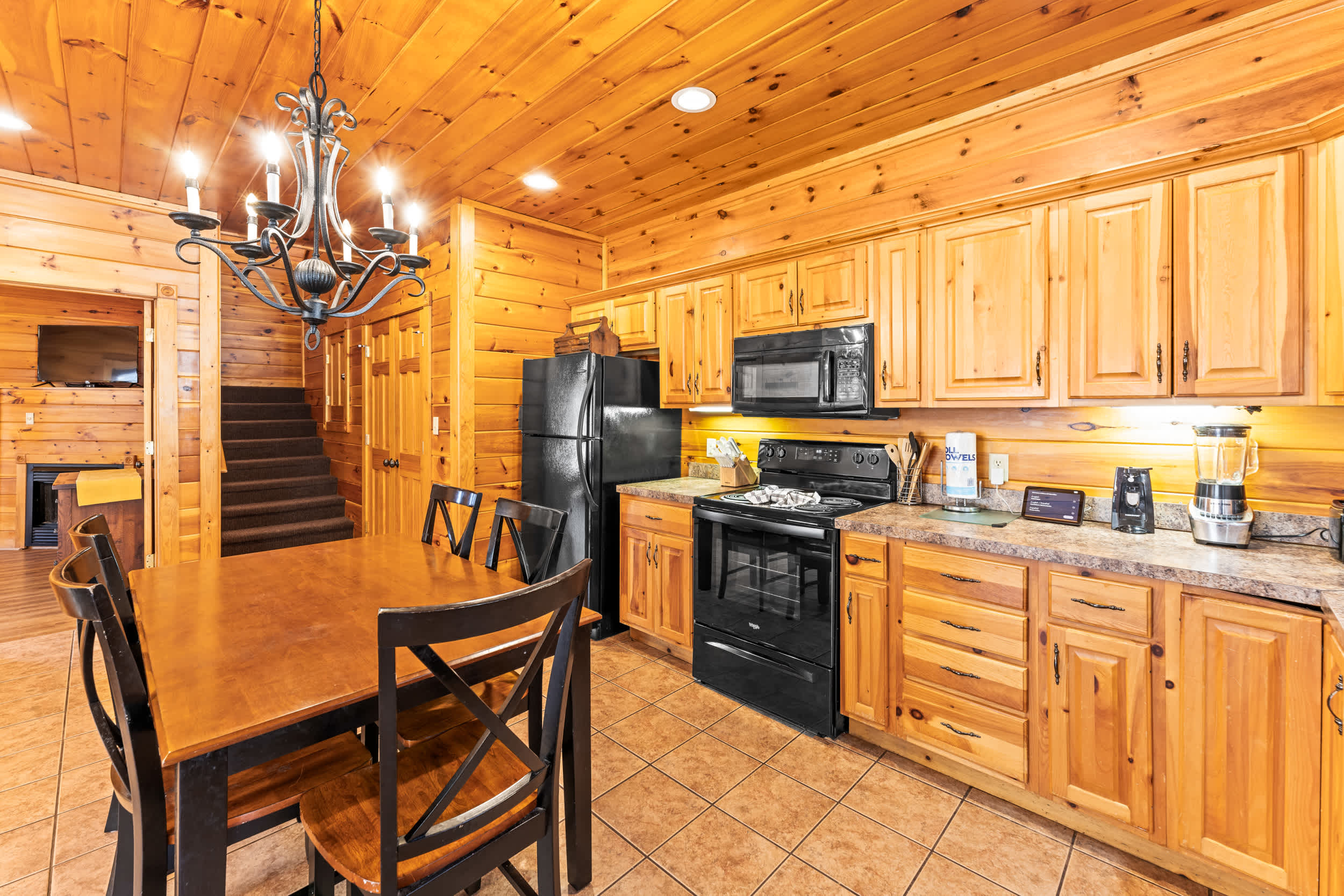 Step onto the front porch and you’ll find classic rocking chairs and a picnic table, perfect for morning coffee or an evening meal surrounded by nature. Inside, the fully equipped kitchen features both a standard coffee maker and a Keurig, sleek black appliances, natural wood cabinetry, and ample counterspace—making it easy to prepare meals or snacks during your stay. After taking a quick peek in the kitchen, head out to the back deck where you’ll discover a private haven with a soothing hot tub, additional rocking chairs, and a charming porch swing—all framed by serene, tree-lined mountain views that create a tranquil backdrop for your stay.