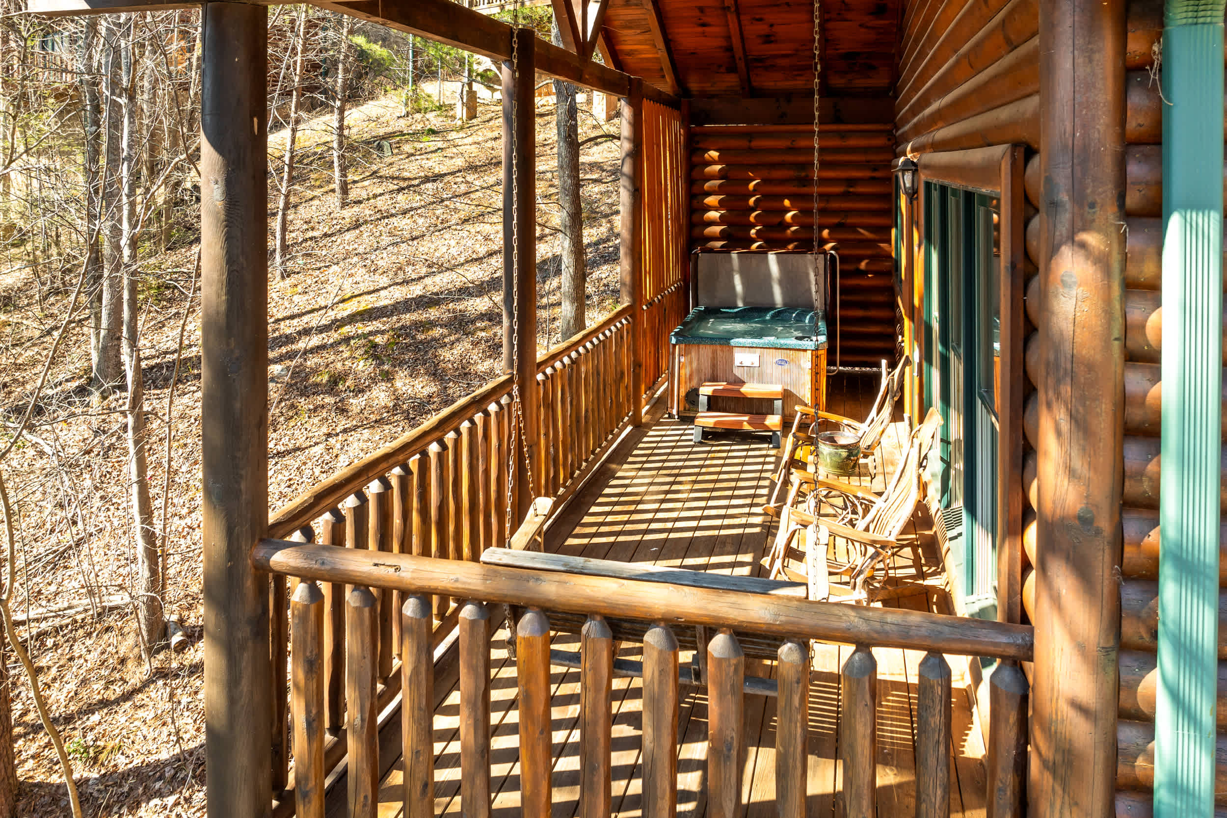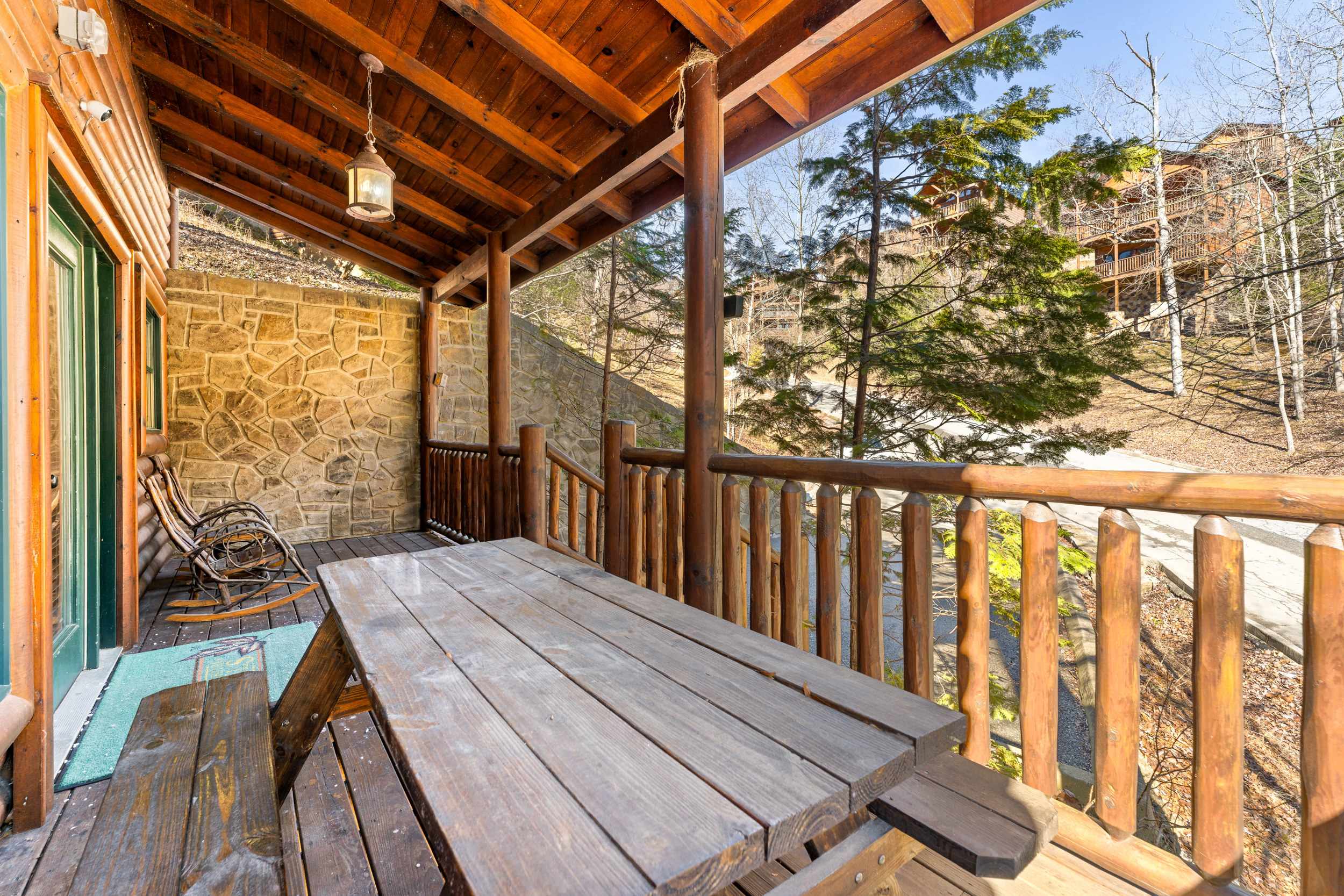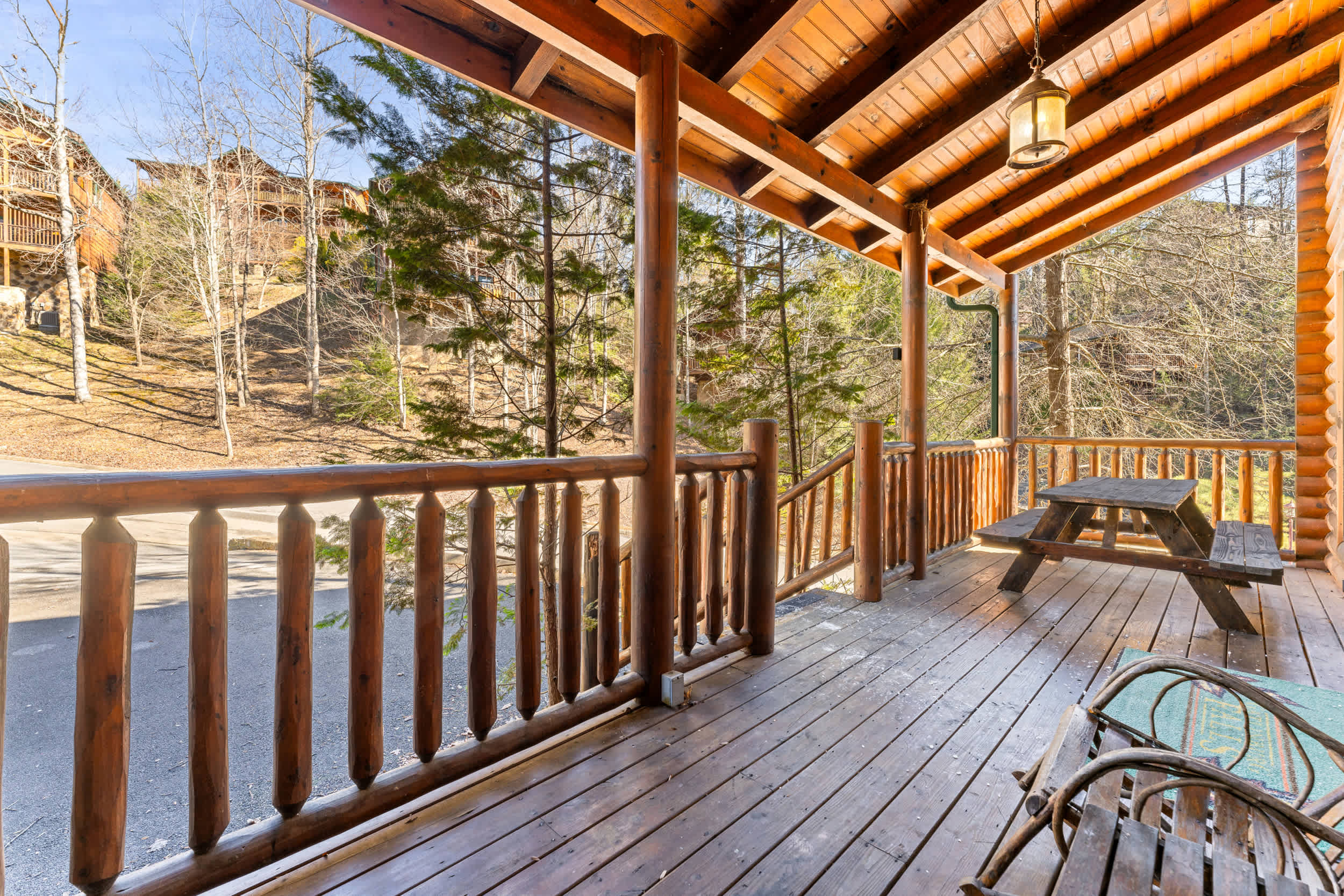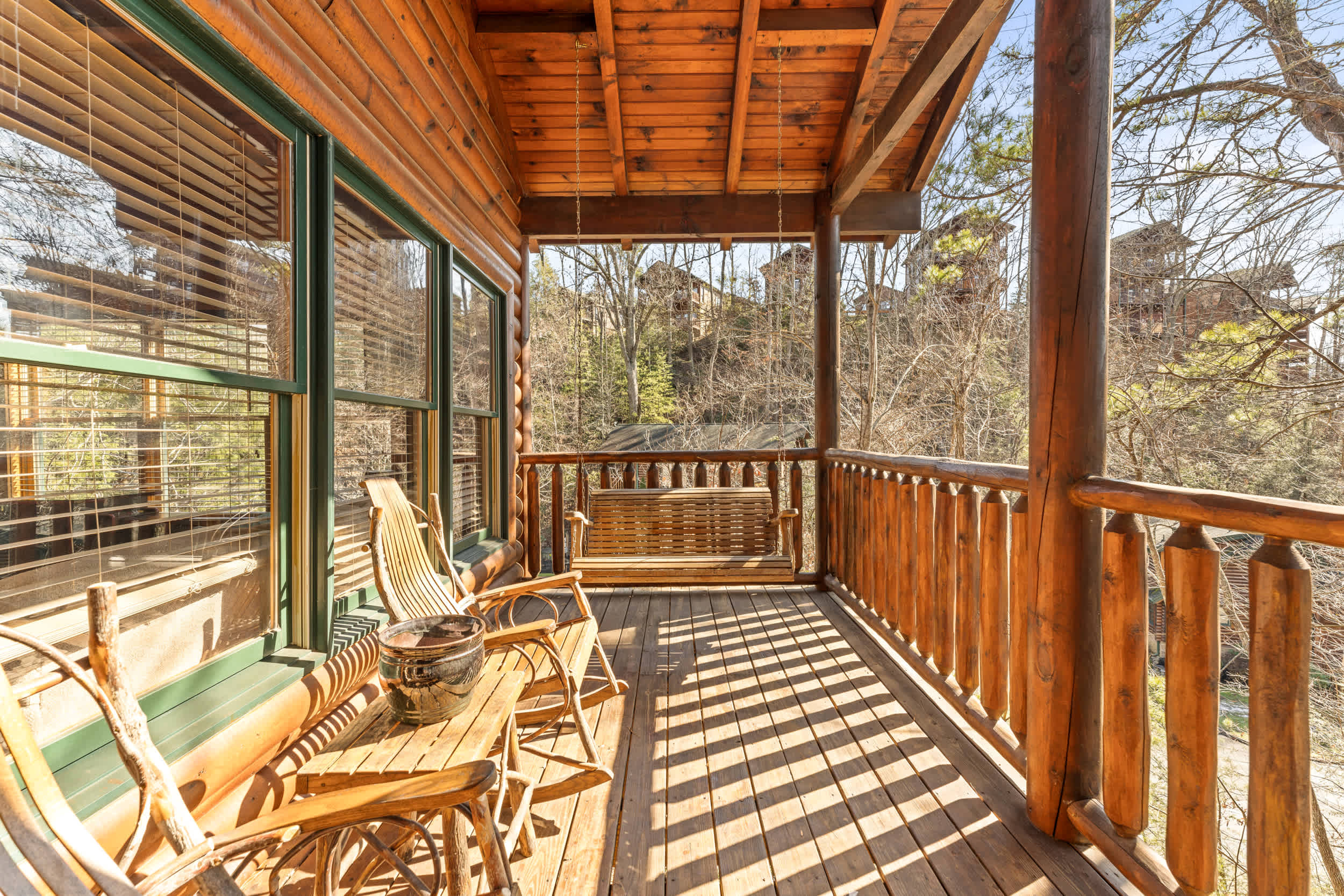 Step onto the front porch and you’ll find classic rocking chairs and a picnic table, perfect for morning coffee or an evening meal surrounded by nature. Inside, the fully equipped kitchen features both a standard coffee maker and a Keurig, sleek black appliances, natural wood cabinetry, and ample counterspace—making it easy to prepare meals or snacks during your stay. After taking a quick peek in the kitchen, head out to the back deck where you’ll discover a private haven with a soothing hot tub, additional rocking chairs, and a charming porch swing—all framed by serene, tree-lined mountain views that create a tranquil backdrop for your stay.