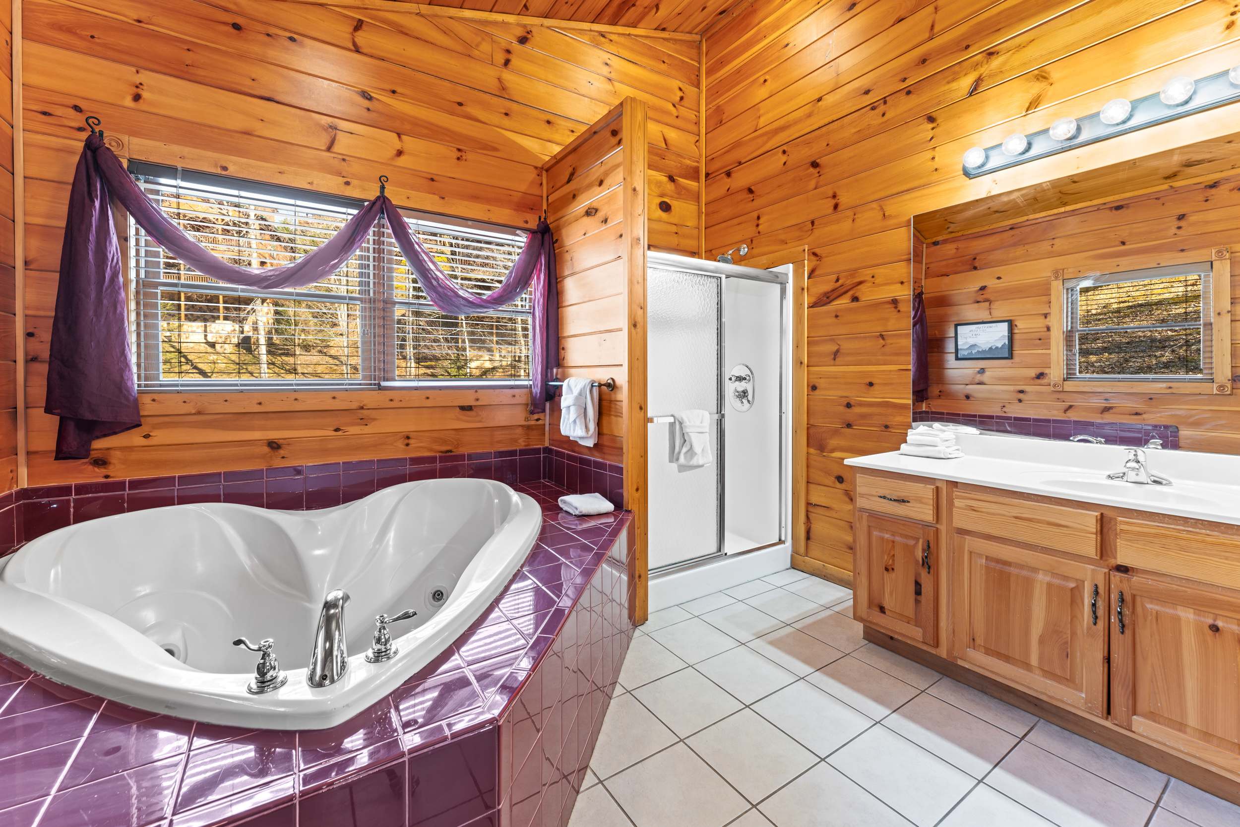 The home also includes a full guest bathroom with a single vanity, a heart-shaped jetted tub, and a walk-in shower.