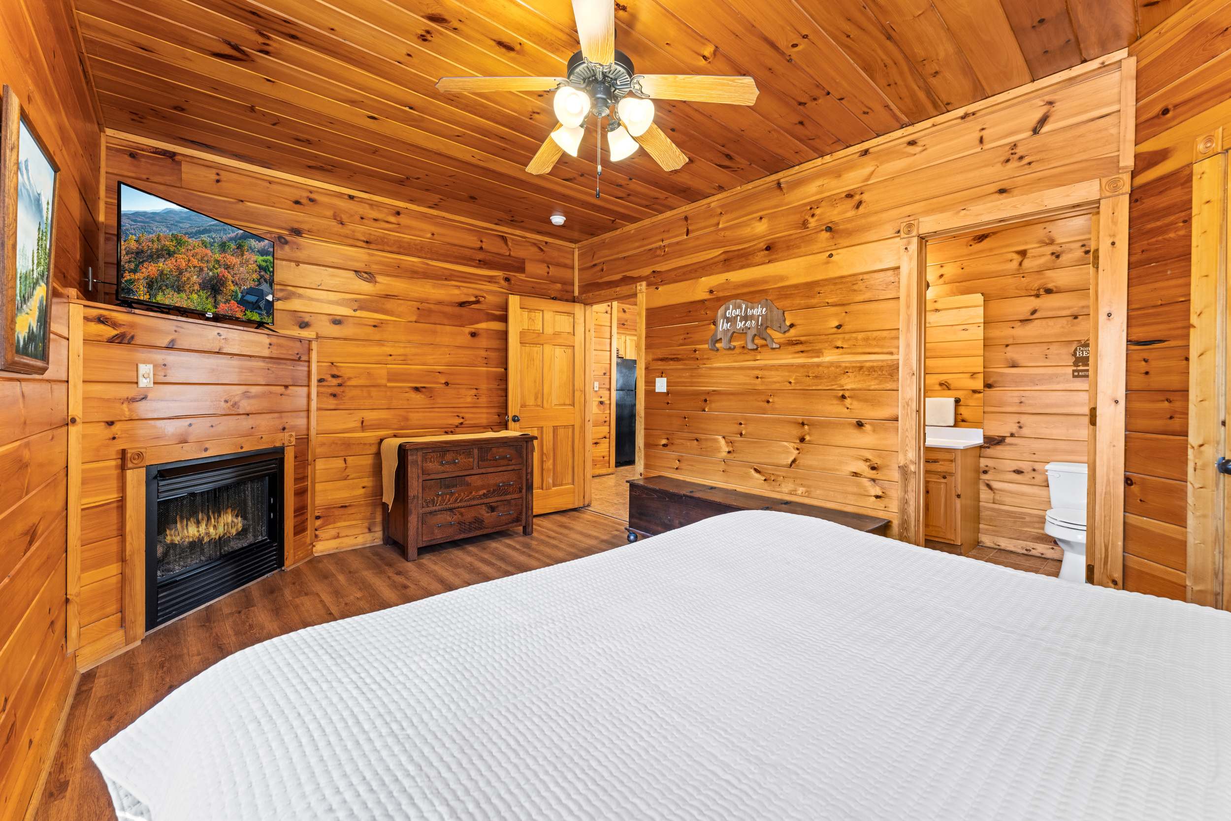 Bedroom #1 includes a king size bed, a smart TV, an electric fireplace, and a Jack-and-Jill bathroom with a single vanity and a shower/tub combo.
