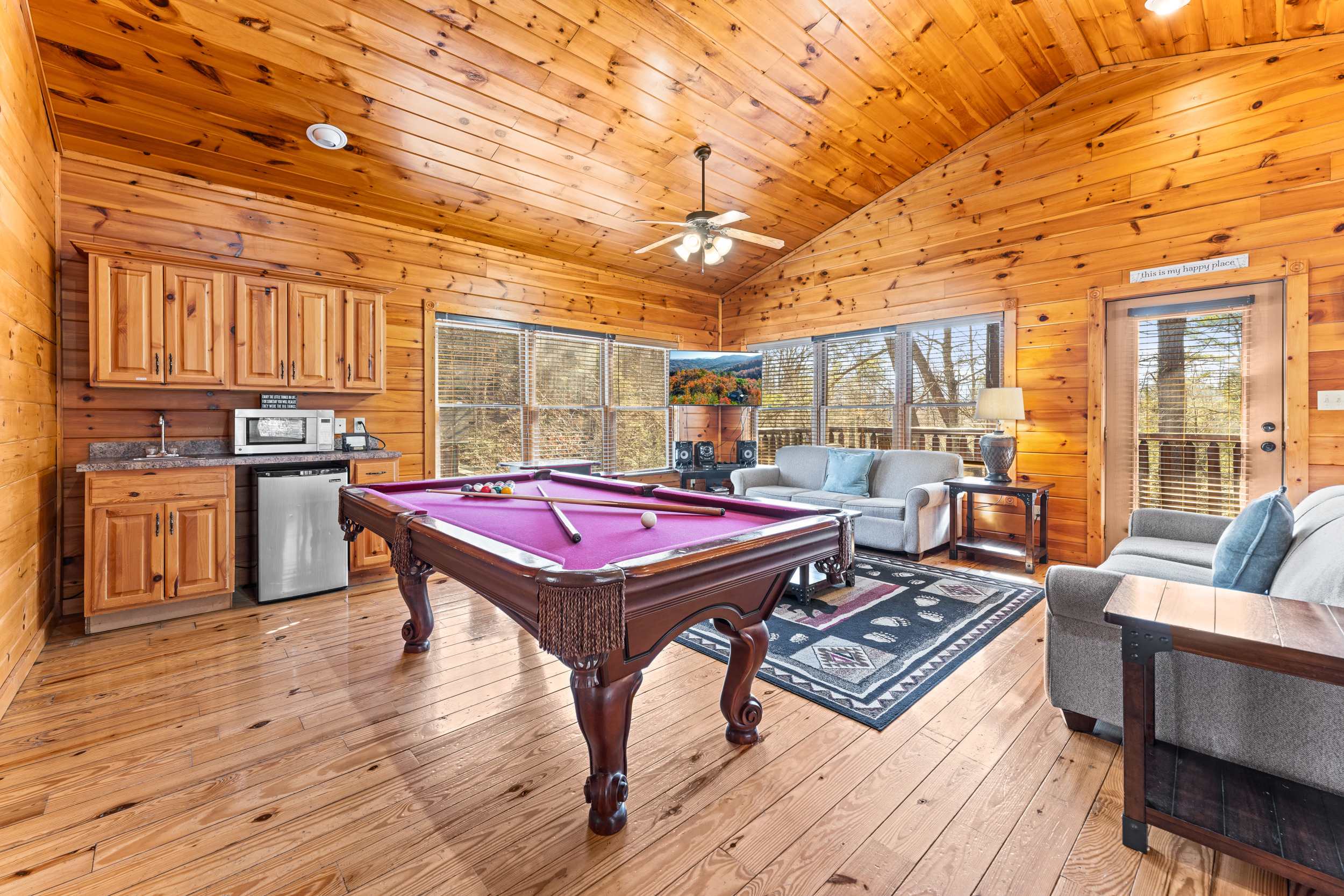 Settle into a family-friendly cabin made for easy mountain days and cozy nights. Inside, two private king bedrooms and two queen sleeper sofas comfortably host up to 8 guests across two bathrooms. The main living areas are simple and inviting, with room to relax, dine, and play.