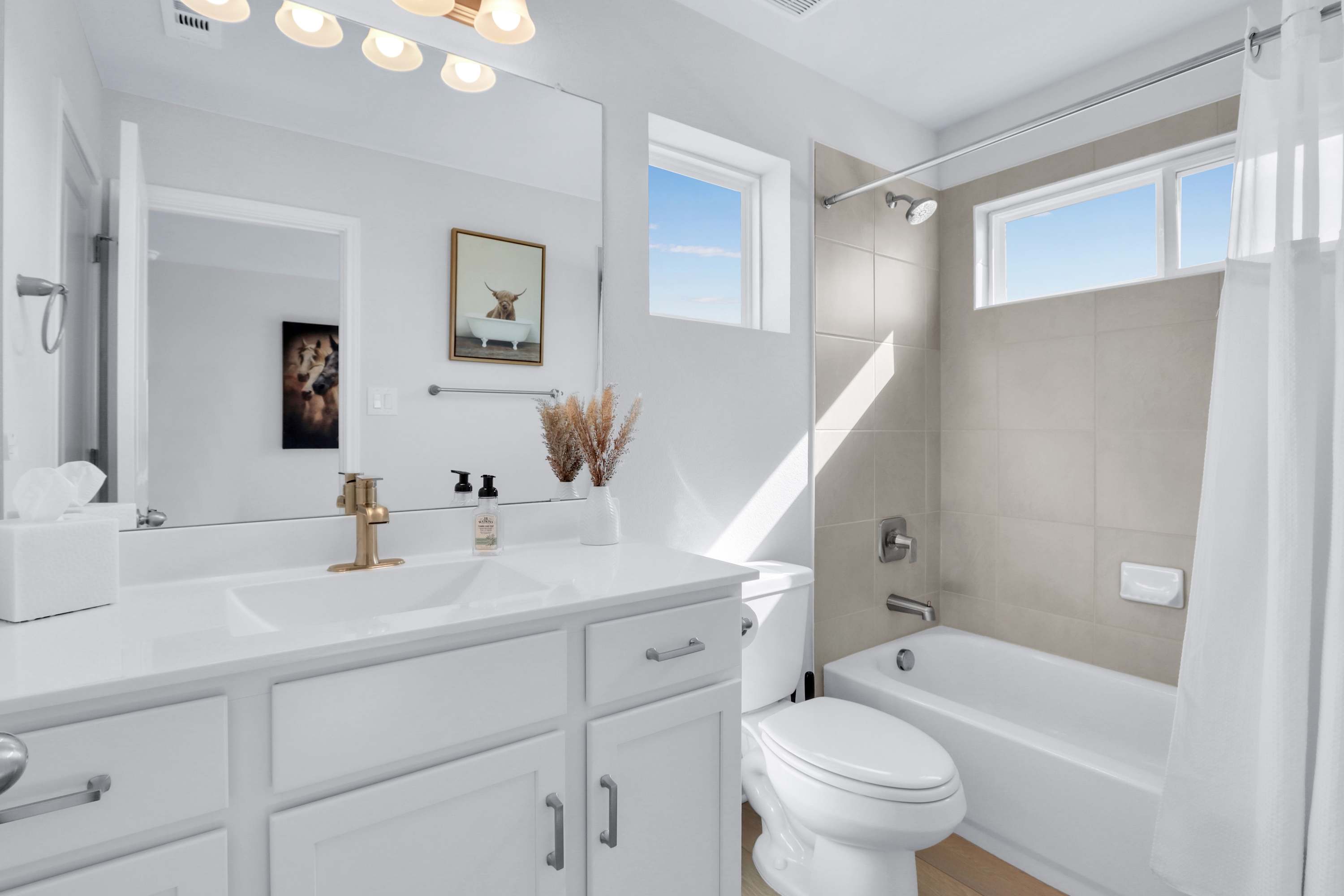 The home also includes a half bathroom and an additional a full bathroom with a single vanity and a shower/tub combo.