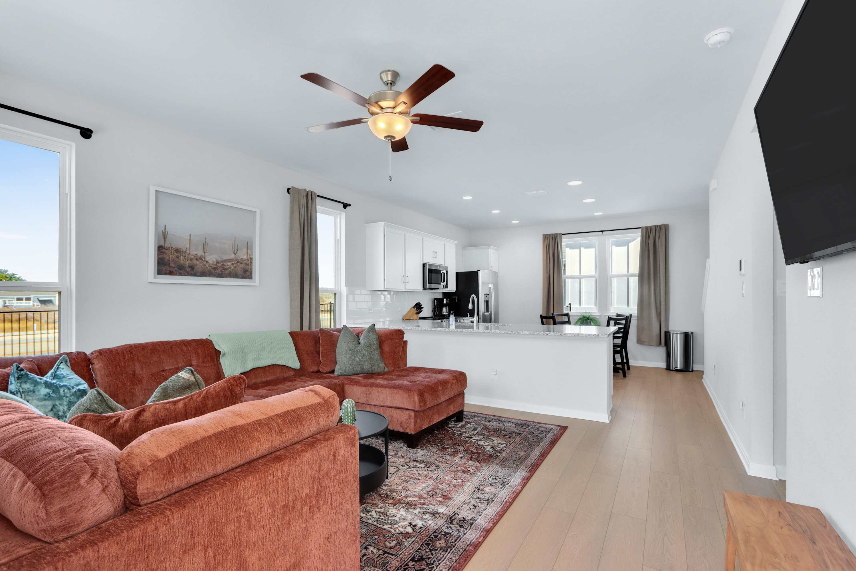 Step inside to find sophisticated furnishings amongst plenty of windows for gorgeous views of the surrounding city. Drop your things and get your vacation started with a glass of wine or your favorite cocktail and make your way to the plush sectional where you can kick your feet up and find your favorite shows on the smart TV. We hope you packed the fixings for your favorite eats to prepare your meals in the kitchen equipped with stainless steel appliances alongside ample cabinet and counter space. Or order some takeout from one of the nearby restaurants and enjoy your meal together at the dining table for four.