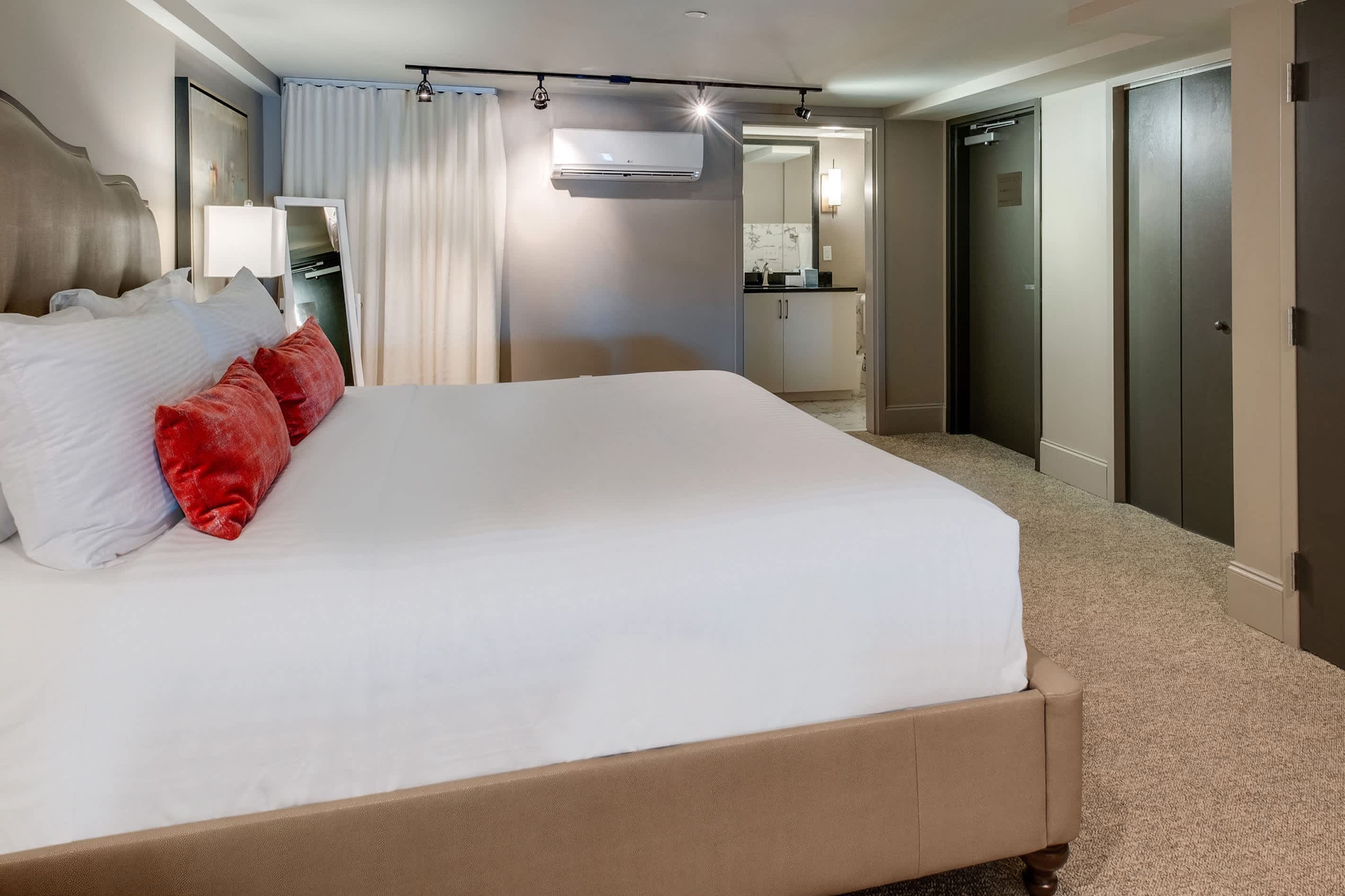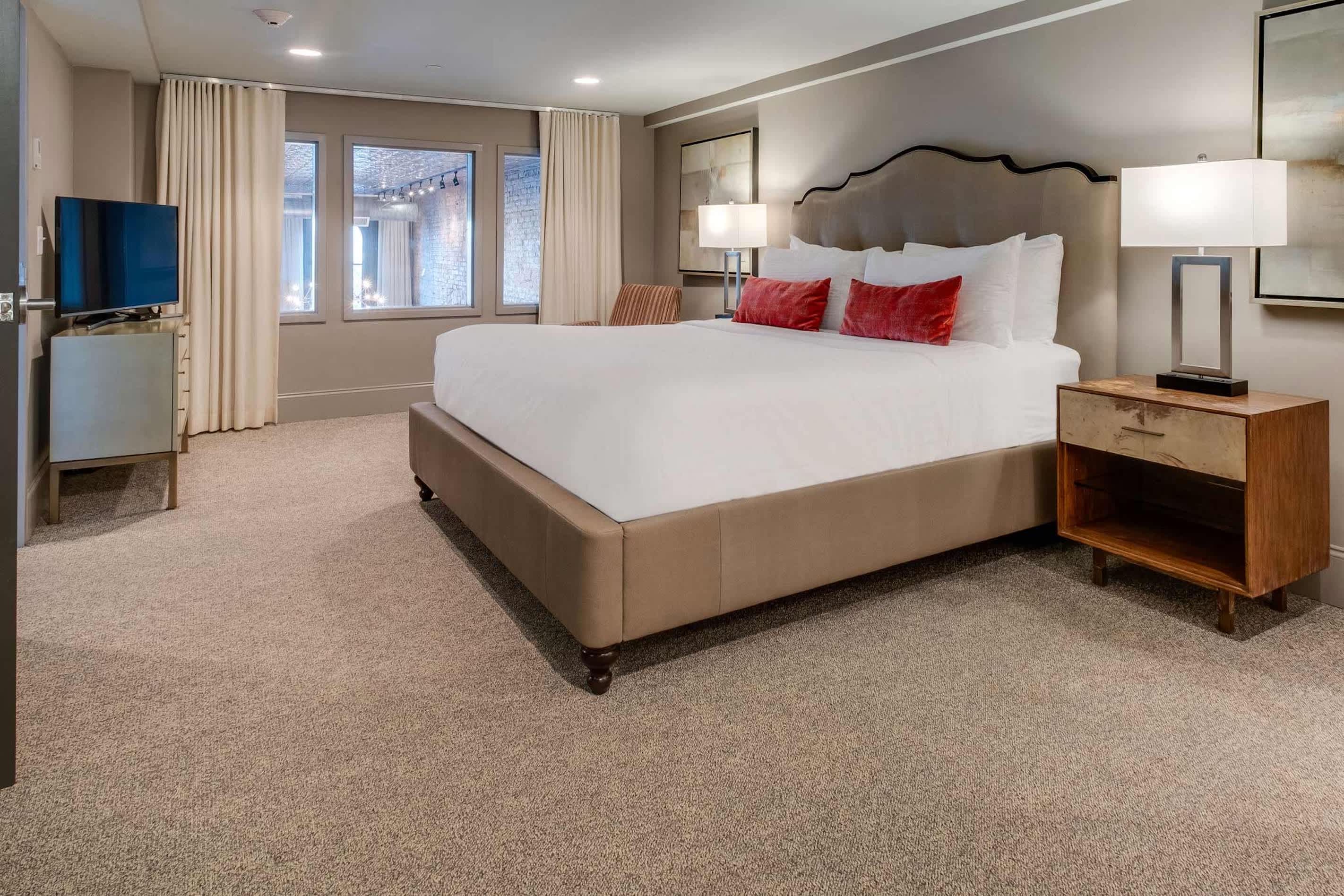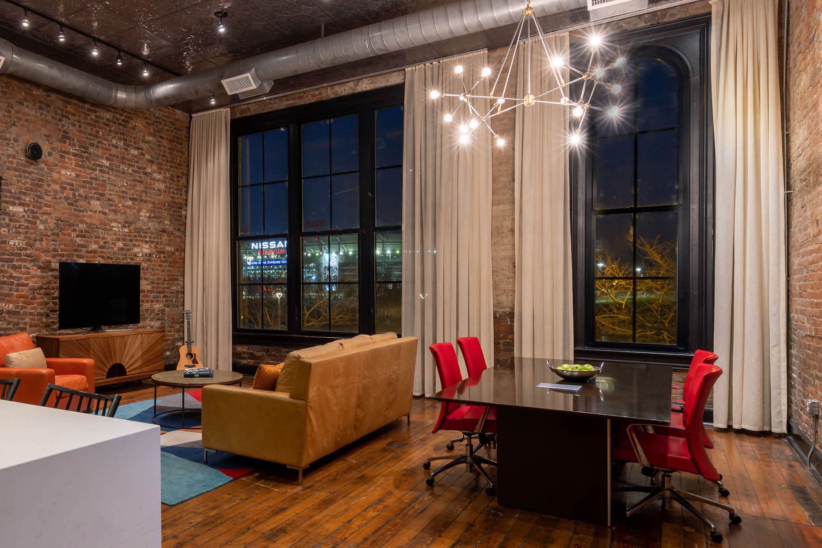 Inside, original brick walls, high ceilings, and tall arched windows create a bright, inviting atmosphere. Start your stay with a handcrafted cocktail in the fully equipped kitchen, then gather around the dining table for six or the island seating five before heading out for a night on the town. After exploring, unwind in the spacious living room with a cozy sofa and armchairs, streaming your favorite shows or take in the stunning views of Cumberland River.