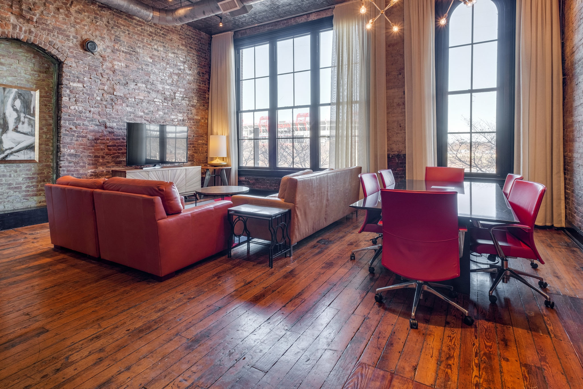 - Large arched windows with stunning views of Cumberland River and Nissan Stadium