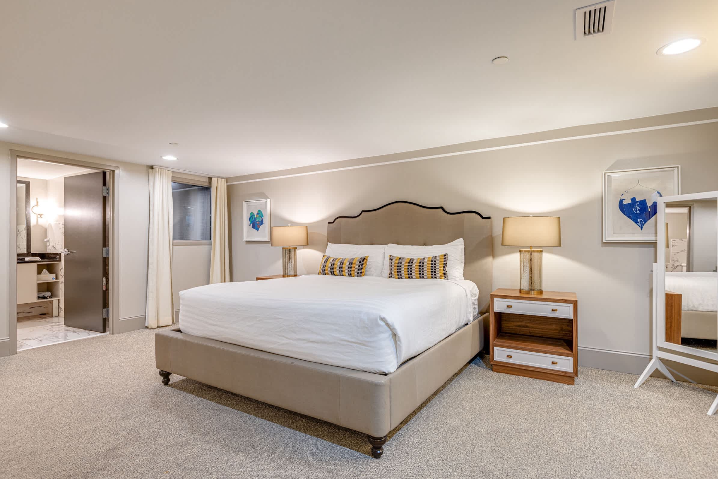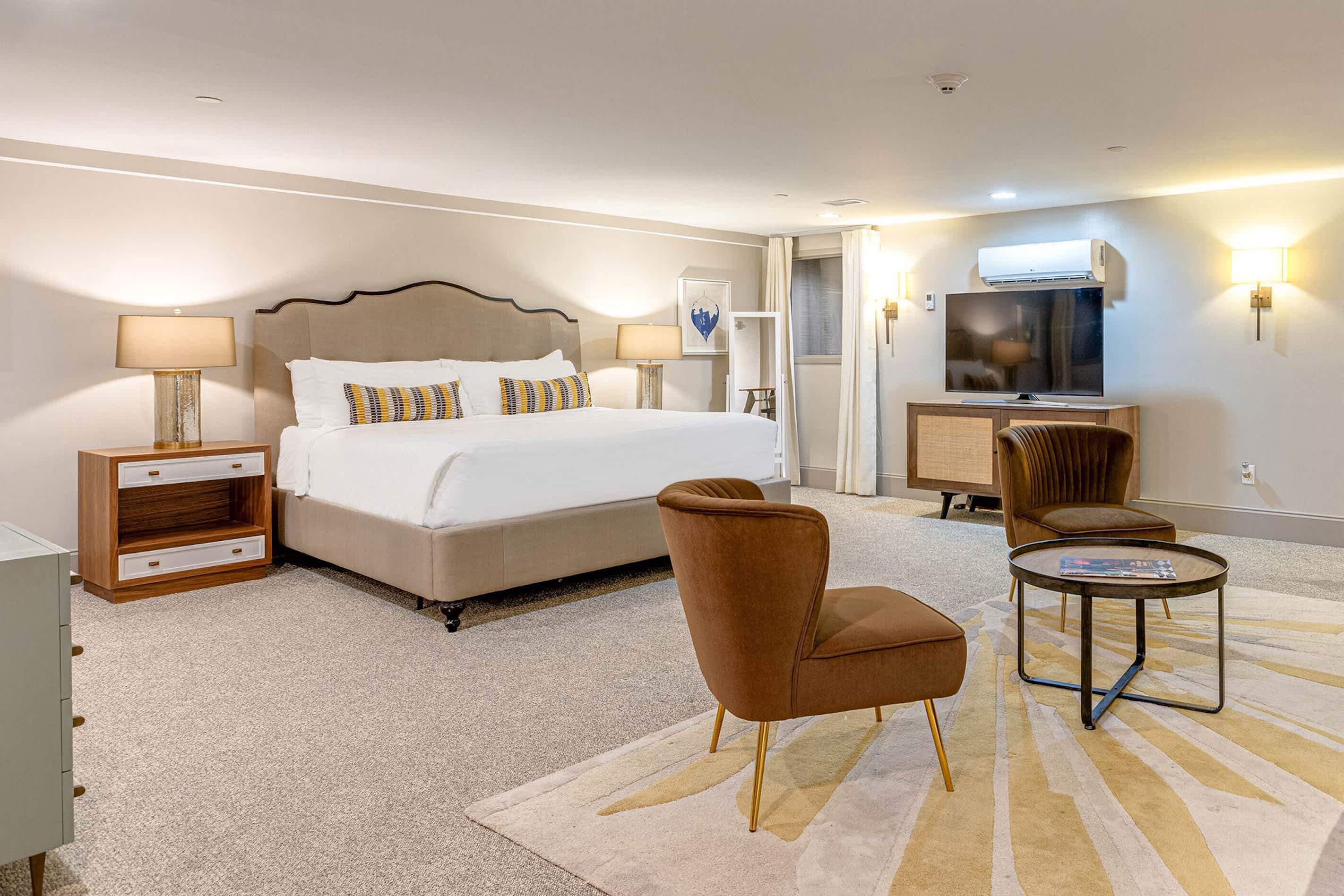This cozy Nashville Riverfront Lofts hotel-style studio is ideal for a romantic escape or a fun getaway with friends. The convenient kitchenette allows for light meal prep, and with Nashville’s best restaurants just steps away, you’ll have plenty of opportunities to savor the city’s famous southern eats. After a day of exploring, unwind in the seating area with a plush couch and stylish armchairs, then curl up in the king-size bed for a cozy movie night.