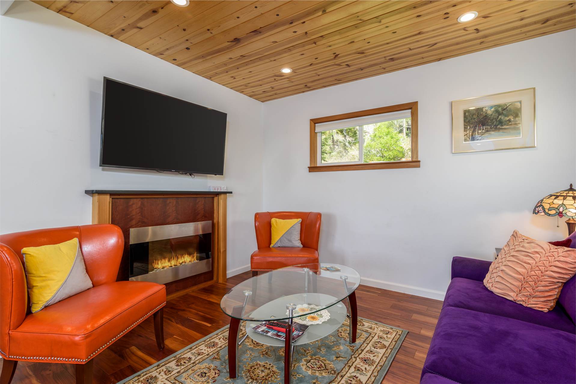 Bedroom 1 features a king bed, smart TV, an electric fireplace for added ambiance, and direct access to the deck. Bedroom 2 includes a queen bed. The full bathroom has a raised sink and a jetted shower/tub combo.