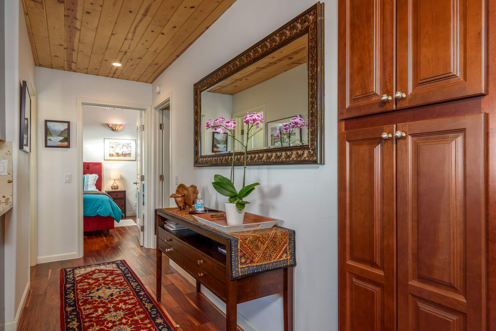 • Bathroom 1: Full bath with raised sink and jetted shower/tub combo (hall access)