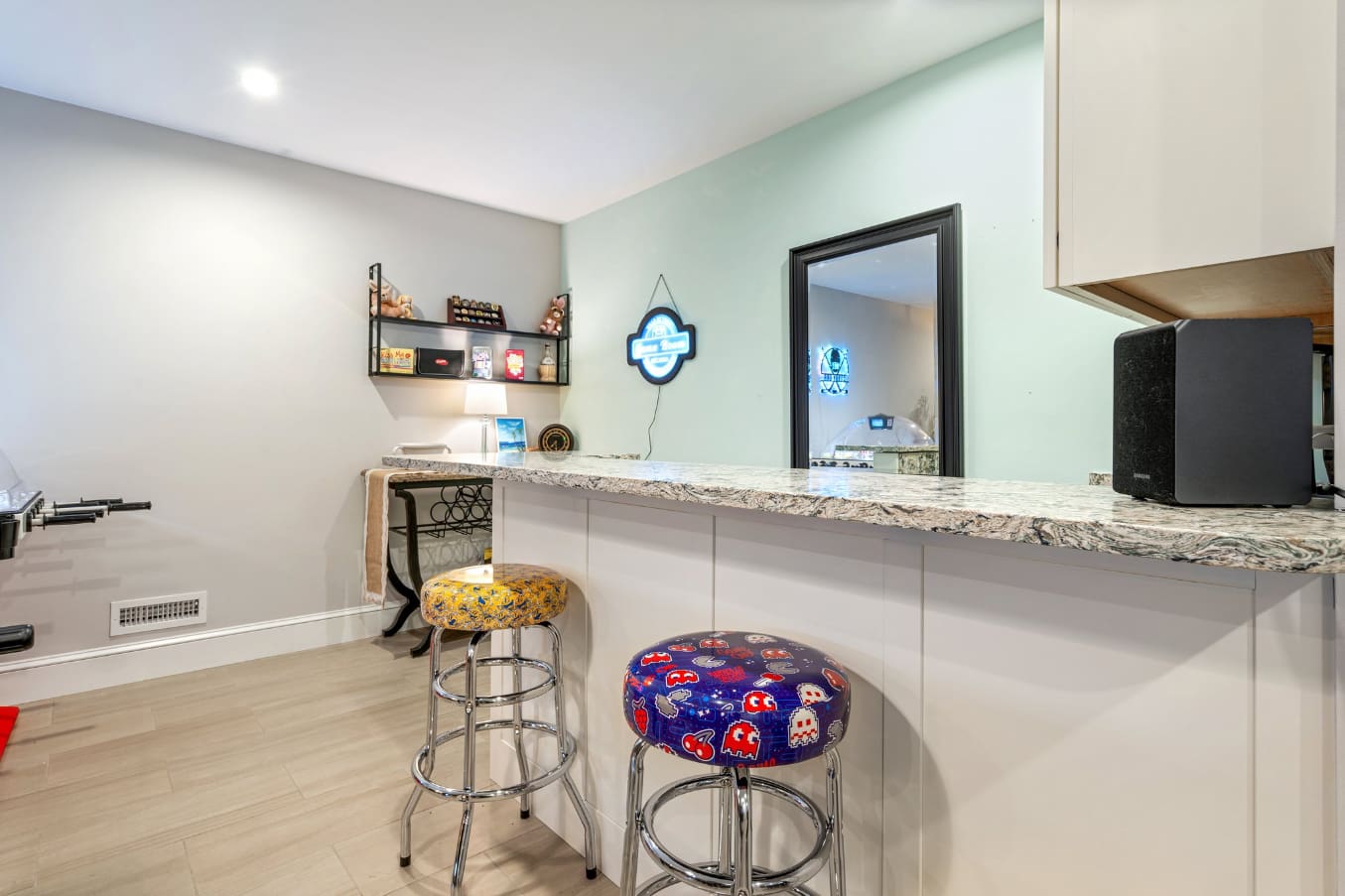 • Basement Wet Bar – The perfect spot to enjoy drinks while playing