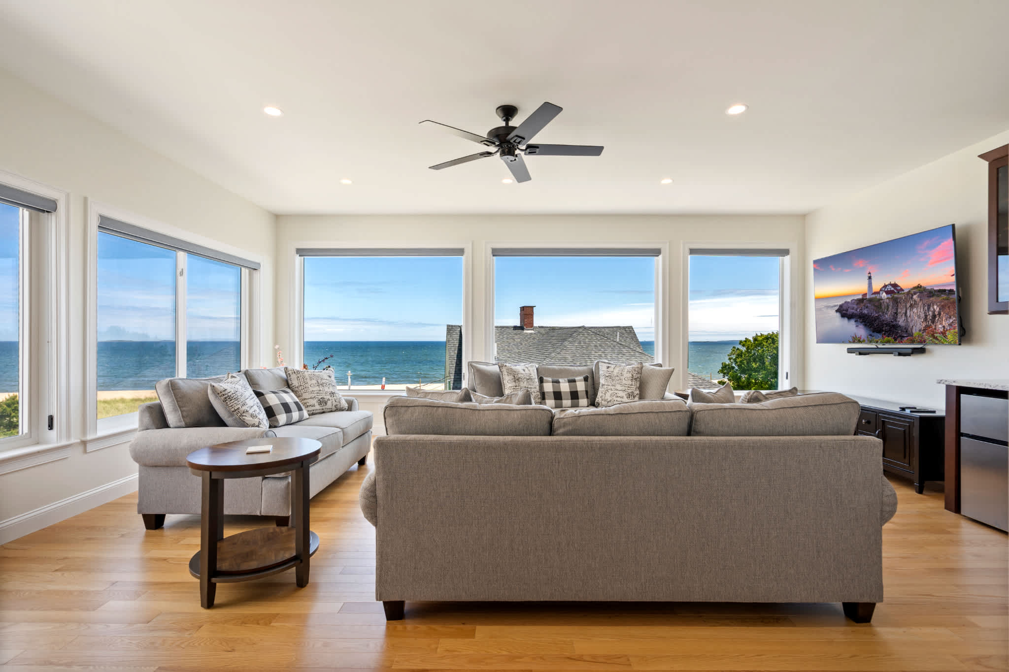 • Third-floor ocean-view lounge with two couches, large windows, smart TV, wet bar + mini fridge