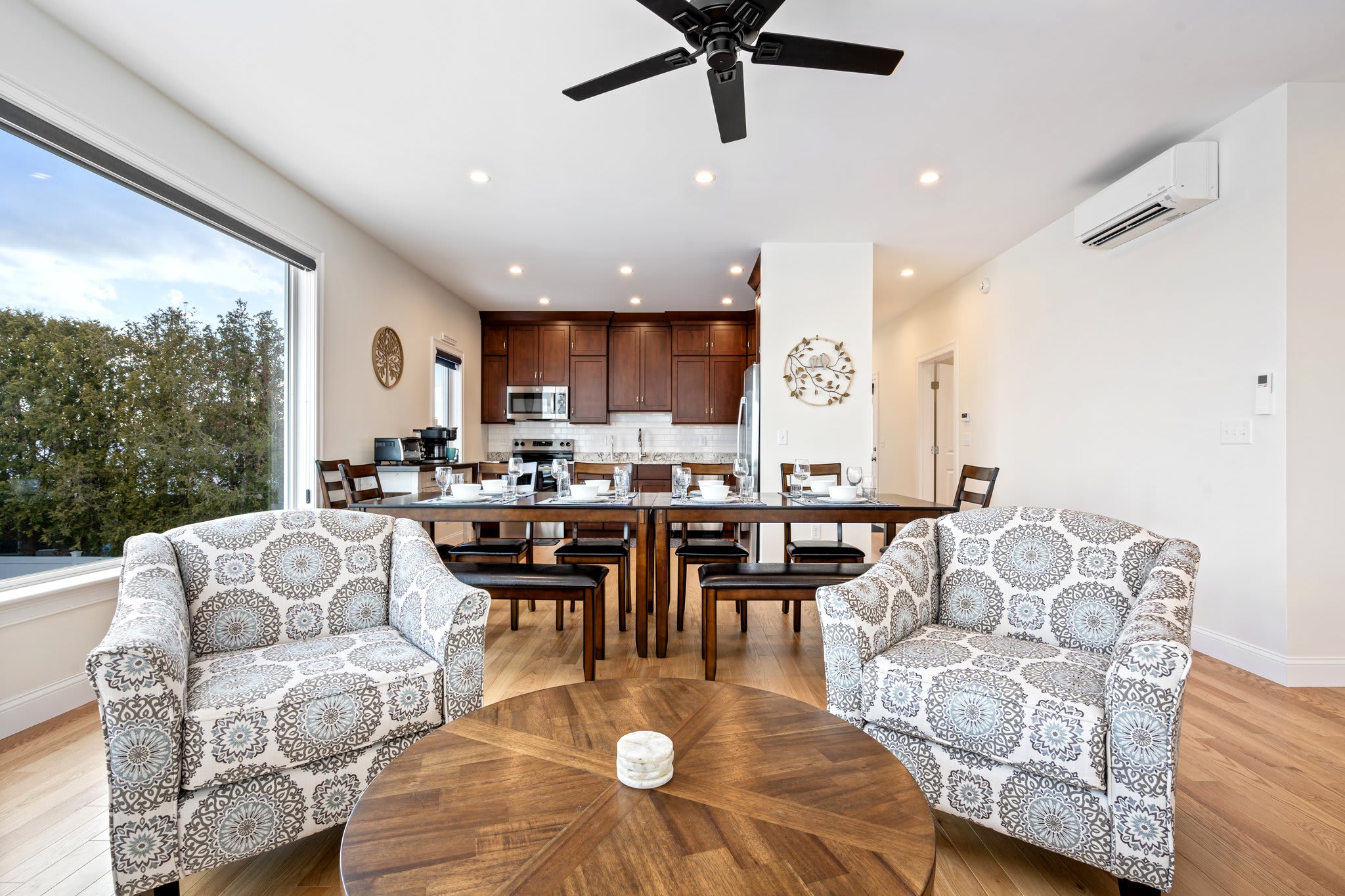 • Second-floor open-concept living + dining + kitchen area